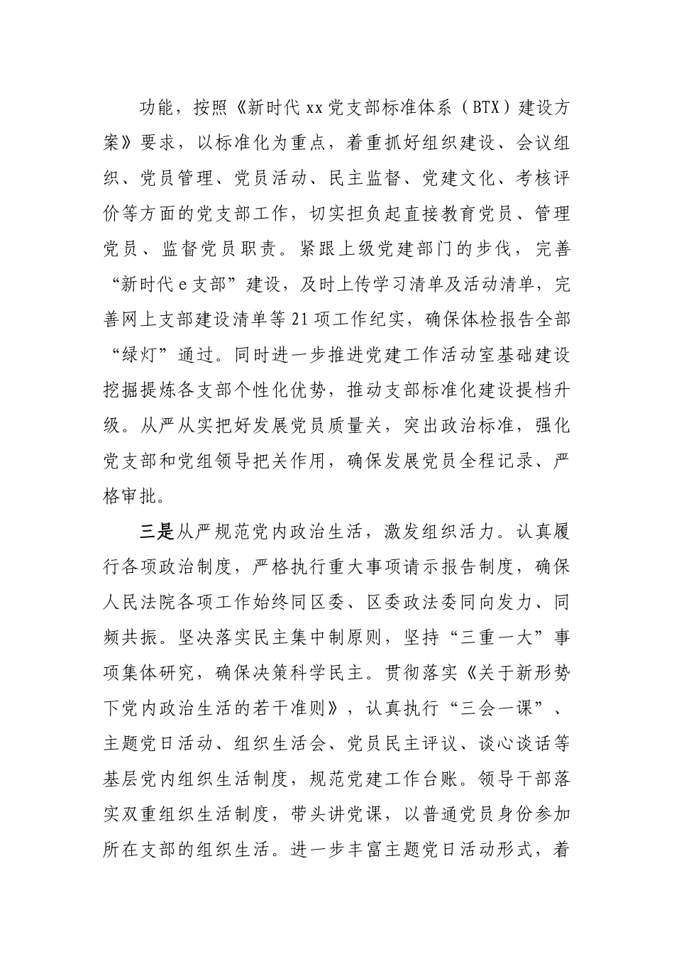 法院政治建设和一岗双责落实情况汇报各位领导、同志们:按照区委政法委的安排部署,下面由我将本院党的政治建设和“一岗双责”落实情况汇报如下。一、加强政治建设,维护党的领导一是深入开展政治理论学习,强化思想建设。始终把学懂弄通做实习近平新时代中国特色社会主义思想作为首要政治任务,深入学习习近平法治思想,认真学习贯彻党的十九大和十九届二中、三中、四中、五中、六中全会精神。认真落实党中央、省、市、区委和上级法院的各项重要决策部署。引导教育全院干警牢固树立“四个意识”,坚定“四个自信”,坚持“两个确立”,做到“两个维护”。通过院领导讲党课、理论中心组学习、党组会议第一议题学习、支部会议学习和政治轮训等方式,将政治理论学习和党的思想建设融入日常、抓在经常。深入开展党史学习教育、“响应党的伟大号召,发扬伟大建党精神,争取更大光荣”主题实践活动,通过参观红色教育基地、组织主题观影、开展主题宣讲等形式,进一步筑牢干警政治忠诚,提升干警政治能力。年初以来,共开展理论中心组学习18次,组织参与政治轮训32次,组织各支部开展集中学习40余次,干警撰写各类学习心得体会700余篇。二是推进党支部标准化建设,夯实组织基础。深入推进党支部标准化建设,夯实规范基础。突出党支部的政治引领功能,按照《新时代xx党支部标准体系(BTX)建设方案》要求,以标准化为重点,着重抓好组织建设、会议组织、党员管理、党员活动、民主监督、党建文化、考核评价等方面的党支部工作,切实担负起直接教育党员、管理党员、监督党员职责。紧跟上级党建部门的步伐,完善“新时代e支部”建设,及时上传学习清单及活动清单,完善网上支部建设清单等21项工作纪实,确保体检报告全部“绿灯”通过。同时进一步推进党建工作活动室基础建设挖掘提炼各支部个性化优势,推动支部标准化建设提档升级。从严从实把好发展党员质量关,突出政治标准,强化党支部和党组领导把关作用,确保发展党员全程记录、严格审批。三是从严规范党内政治生活,激发组织活力。认真履行各项政治制度,严格执行重大事项请示报告制度,确保人民法院各项工作始终同区委、区委政法委同向发力、同频共振。坚决落实民主集中制原则,坚持“三重一大”事项集体研究,确保决策科学民主。贯彻落实《关于新形势下党内政治生活的若干准则》,认真执行“三会一课”、主题党日活动、组织生活会、党员民主评议、谈心谈话等基层党内组织生活制度,规范党建工作台账。领导干部落实双重组织生活制度,带头讲党课,以普通党员身份参加所在支部的组织生活。进一步丰富主题党日活动形式,着力强化主题党日活动的庄重感、仪式感。年初以来共组织开展演讲报告、参观基地、书画影展等多种形式的党性教育活动10余次,切实把党的基层组织建设成讲政治、有活力、能战斗的坚强堡垒。二、坚定政治立场,落实一岗双责一是坚持高站位部署,认真履行管党治党政治责任。始终保持政治定力,始终坚持把全面从严治党工作作为首要政治责任和重大政治考验,在政治立场、政治方向、政治原则、政治道路上同以习近平同志为核心的党中央保持高度一致。坚持向党中央看齐,向党的理论和路线方针政策看齐,向党中央决策部署看齐,做到党中央提倡的坚决响应、党中央决定的坚决执行、党中央禁止的坚决不做,确保政令畅通。带头履行管党责任,认真履行全面从严治党“第一责任人”职责,把党风廉政建设作为一项基础性工作来抓,年初以来召开党组会议4次,专题研究全面从严治党工作。深入贯彻中央和省、市、区委关于全面从严治党工作的部署要求,坚持做到重要工作亲自部署、重大问题亲自过问、重点环节亲自协调、重要案件亲自督办,把全面从严治党和党风廉政建设贯穿法院工作全过程。三是坚持高标准落实,严格遵守廉洁从政各项规定。严格落实党风廉政建设责任制,院领导带头执行廉洁从政各项规定,带头遵守《准则》和《条例》,切实管好亲属和身边工作人员。带头落实贯彻“八项规定”,驰而不息纠正“四风”。严格落实意识形态工作责任制,强化党员干部意识形态建设,坚守意识形态高地。严格贯彻执行防止干预司法“三个规定”,建立《关...