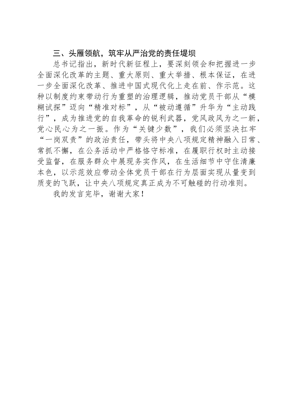 乡镇干部深入贯彻作风建设专题理论中心组的交流发言大家好!根据县委深入贯彻作风建设专题的学习安排,近期,本人通过对《习近平关于加强党的作风建设论述摘编》的深入研读,现将个人心得体会分享如下。一、观势应时,淬炼忠诚担当的政治品格党的作风关系党的形象,关系人心向背,关系党的生死存亡。在决胜“十四五”的重要节点上,党中央决定在全党开展深入贯彻作风建设专题,正当其时,意义重大。习近平总书记更是亲自点题、亲自部署,发表重要讲话,作出重要指示,为开展学习教育提供了根本遵循、指明了努力方向。作为党员领导干部,只有不断强化政治自觉,原原本本学,逐字逐句研读八项规定及其实施细则,才能把握“精简文件简报”“改进调查研究”“厉行勤俭节约”等具体要求背后的政治考量。同时,要坚持以文化涵养新风。充分发挥宣传思想文化工作优势,将中央八项规定精神融入社会主义核心价值观培育。用好我镇不可移动革命文物、爱国主义教育基地等红色资源,推动红色教育与党性教育、廉政教育、作风建设紧密结合。加强新时代廉洁文化建设和家庭家教家风建设,深入挖掘并活化利用xx优秀传统文化中的勤廉因素,推动形成崇廉尚俭的文化氛围。二、革故鼎新,激发奋进争先的实干动能总书记强调,“要以正确政绩观真抓实干,以钉钉子精神抓落实,推动高质量发展取得实实在在的成效”。道不可坐论,理不能空谈。作风建设并不是空中楼阁,而是要“紧紧围绕以中国式现代化全面推进强国建设、民族复兴伟业这个中心任务”,围绕中心、服务大局,依法履职尽责,努力推动xx工作高质量发展。要聚焦经济高质量发展,围绕县委重大决策部署,加强对乡村振兴、经济运行、乡村振兴、生态环保、民主法治、民生保障等重点工作的推动,确保县委决策部署落地落实。要干事创业敢担当。主动担当是对党忠诚的表现,也是讲政治的表现。在新形势下,我们的党员干部要始终以强烈的政治责任感和历史使命感,保持只争朝夕、奋发有为的奋斗姿态和越是艰险越向前的斗争精神,以钉钉子精神抓工作落实,坚决摒弃一切明哲保身、得过且过、敷衍塞责、懒政怠政等消极行为,对党忠诚、为党分忧、为党尽职、为民造福,守土有责、守土负责、守土尽责。要排查换届风险隐患。要逐村开展换届风险隐患排查,摸清换届时村书记无合适人选、村情选情复杂、预判换届信访矛盾问题较多、换届组织难度较大的换届重点难点村,提前研究解决问题的措施、摆布工作力量,相关问题在今年10月底前要全部完成,整顿不到位的村不得启动换届。同时要持续关注现任村书记的思想动态,尤其是对拟不再继续留任的村书记,乡镇党委要“一对一”的做好思想工作、加强正面引导,警惕换届舆情风险并做好应对处置工作。要实施“乡村赋能”行动。聚焦乡村发展人才匮乏难题,以家情、乡情、友情为纽带,聘请县直单位x名优秀人才及x余名在外人才担任“乡村规划师”,常态化与结对村党组织联络,发挥人才资金、人脉、管理等优势,帮助结对村规划发展思路、破解村级集体经济产业发展难题、建强基层党组织等,切实打通基层治理微循环。要持续加大产业扶持力度。支持集体经济合作社作为项目实施主体,在扶贫产业、农产品基地、农业综合开发、“一事一议”、村集体经济发展、休闲农业和乡村旅游项目申报上予以帮扶;出台风险补偿、保险补贴、财政贴息等系列政策,对符合条件的集体经济合作社予以扶持;统筹财政专项扶贫资金和相关涉农资金,对发展特色产业且收益好的集体经济合作社给予适当额度的补贴,大力支持集体经济合作社申报绿色产业基金。三、头雁领航,筑牢从严治党的责任堤坝总书记指出,新时代新征程上,要深刻领会和把握进一步全面深化改革的主题、重大原则、重大举措、根本保证,在进一步全面深化改革、推进中国式现代化上走在前、作示范。这种以制度约束带动行为重塑的治理逻辑,推动党员干部从“模糊试探”迈向“精准对标”,从“被动遵循”升华为“主动践行”,成为推进党的自我革命的锐利武器,党风政风为之一新,党心民心为之一振。作为“关键少数”,我们必须坚决扛牢“一岗双责”的政治责任,带头将中央八项规定精神融入日常、常抓不懈,...