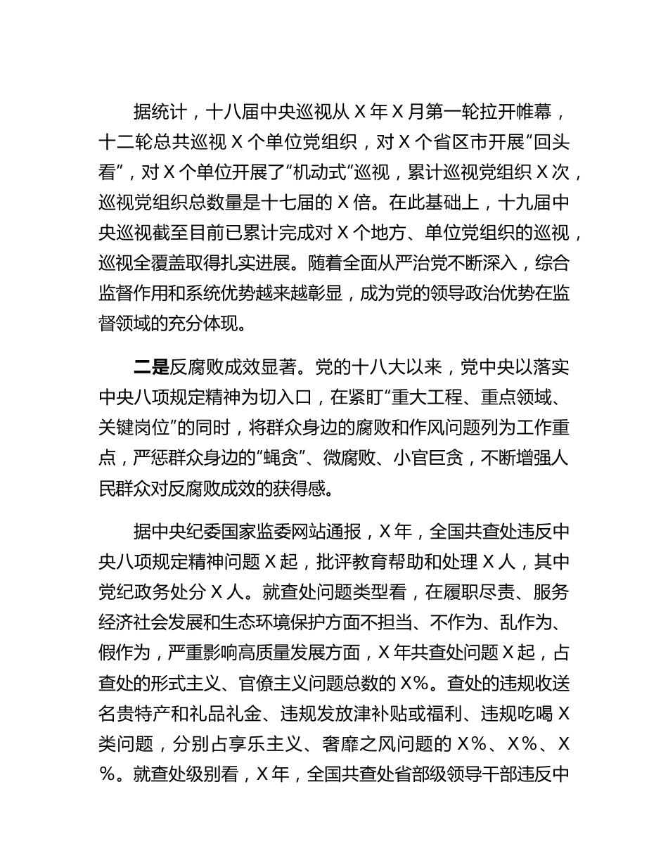廉政党课:知敬畏存戒惧守底线争做新时代忠诚干净担当的党员干部同志们:根据工作计划安排,本月我们以“建设最廉洁干部队伍”为主题,集中开展“5·10”思廉月活动,目的是通过给全体党员干部打免疫针、敲警示钟、上廉政课,进一步提升廉洁从政、廉洁用权、廉洁修身、廉洁齐家的思想自觉,做到知敬畏、存戒惧、守底线,为新形势下我市红十字事业的蓬勃发展奠定坚实基础。今天,我就结合自己的学习感悟,以“知敬畏、存戒惧、守底线,争做新时代忠诚干净担当的党员干部”为题和大家作一交流,同时也是一次集中谈心提醒。希望大家深刻领会全面从严治党的新要求,以案为鉴、警钟长鸣,走对路、扎实干,以清正廉洁、克己奉公的良好形象推动各项工作迈上崭新台阶。一、高站位、认形势,不断强化反腐倡廉意识近年来,中央坚持不懈抓正风肃纪,以“零容忍”的态度和刮骨疗毒、壮士断腕的勇气坚决惩治腐败,持续保持反腐败的高压态势,产生了极大的震慑作用。但我们必须清醒认识到,全面从严治党永远在路上。在十九届中央纪委六次全会上,习近平总书记用四个“任重道远”,深刻分析反腐败斗争新的阶段性特征:“防范形形色色的利益集团成伙作势、'围猎'腐蚀还任重道远,有效应对腐败手段隐形变异、翻新升级还任重道远,彻底铲除腐败滋生土壤、实现海晏河清还任重道远,清理系统性腐败、化解风险隐患还任重道远。”四个“任重道远”的深刻概括,表明以习近平同志为核心的党中央始终保持强烈的忧患意识,始终对腐败这个党执政的最大风险保持高度警惕。需要我们以“赶考”的心态警醒自己、鞭策自己,确保在经受各种考验中交出合格答卷。一是反腐败永远在路上。坚决反对腐败是党的性质和宗旨决定的。党的十八大以来,党中央始终强调坚持党的领导、加强党的建设,把全面从严治党纳入“四个全面”战略布局,提升到治国理政的战略层面,并将党风廉政建设和反腐败工作作为全面从严治党的重要组成部分,体现出高瞻远瞩的政治站位和深谋远虑的政治智慧。据统计,十八届中央巡视从X年X月第一轮拉开帷幕,十二轮总共巡视X个单位党组织,对X个省区市开展“回头看”,对X个单位开展了“机动式”巡视,累计巡视党组织X次,巡视党组织总数量是十七届的X倍。在此基础上,十九届中央巡视截至目前已累计完成对X个地方、单位党组织的巡视,巡视全覆盖取得扎实进展。随着全面从严治党不断深入,综合监督作用和系统优势越来越彰显,成为党的领导政治优势在监督领域的充分体现。二是反腐败成效显著。党的十八大以来,党中央以落实中央八项规定精神为切入口,在紧盯“重大工程、重点领域、关键岗位”的同时,将群众身边的腐败和作风问题列为工作重点,严惩群众身边的“蝇贪”、微腐败、小官巨贪,不断增强人民群众对反腐败成效的获得感。据中央纪委国家监委网站通报,X年,全国共查处违反中央八项规定精神问题X起,批评教育帮助和处理X人,其中党纪政务处分X人。就查处问题类型看,在履职尽责、服务经济社会发展和生态环境保护方面不担当、不作为、乱作为、假作为,严重影响高质量发展方面,X年共查处问题X起,占查处的形式主义、官僚主义问题总数的X%。查处的违规收送名贵特产和礼品礼金、违规发放津补贴或福利、违规吃喝X类问题,分别占享乐主义、奢靡之风问题的X%、X%、X%。就查处级别看,X年,全国共查处省部级领导干部违反中央八项规定精神问题X起,查处地厅级领导干部问题X起,查处县处级领导干部问题X起,查处乡科级及以下干部问题X起。其中,县处级及以下查处问题数占查处问题总数的X%。我们再把视线拉回省内,今年一季度,XX省共查处违反中央八项规定精神问题X起,其中,XX起,占X%。X起问题中形式主义、官僚主义问题X起,享乐主义、奢靡之风问题X起(违规收受礼金和其他礼品X起,违规公款吃喝X1起,违规接受管理和服务对象等宴请X起,违规发放津补贴或福利X起,公款旅游以及违规接受管理和服务对象等旅游活动安排X起,其他X起),共批评教育帮助和处理X人,党纪政务处分X人。在有力彰显党委政府惩治腐败坚定决心的同时,持续释放了越往后执纪越严的强烈信号。三是反腐败乃立身之本。我们党是由千千...
