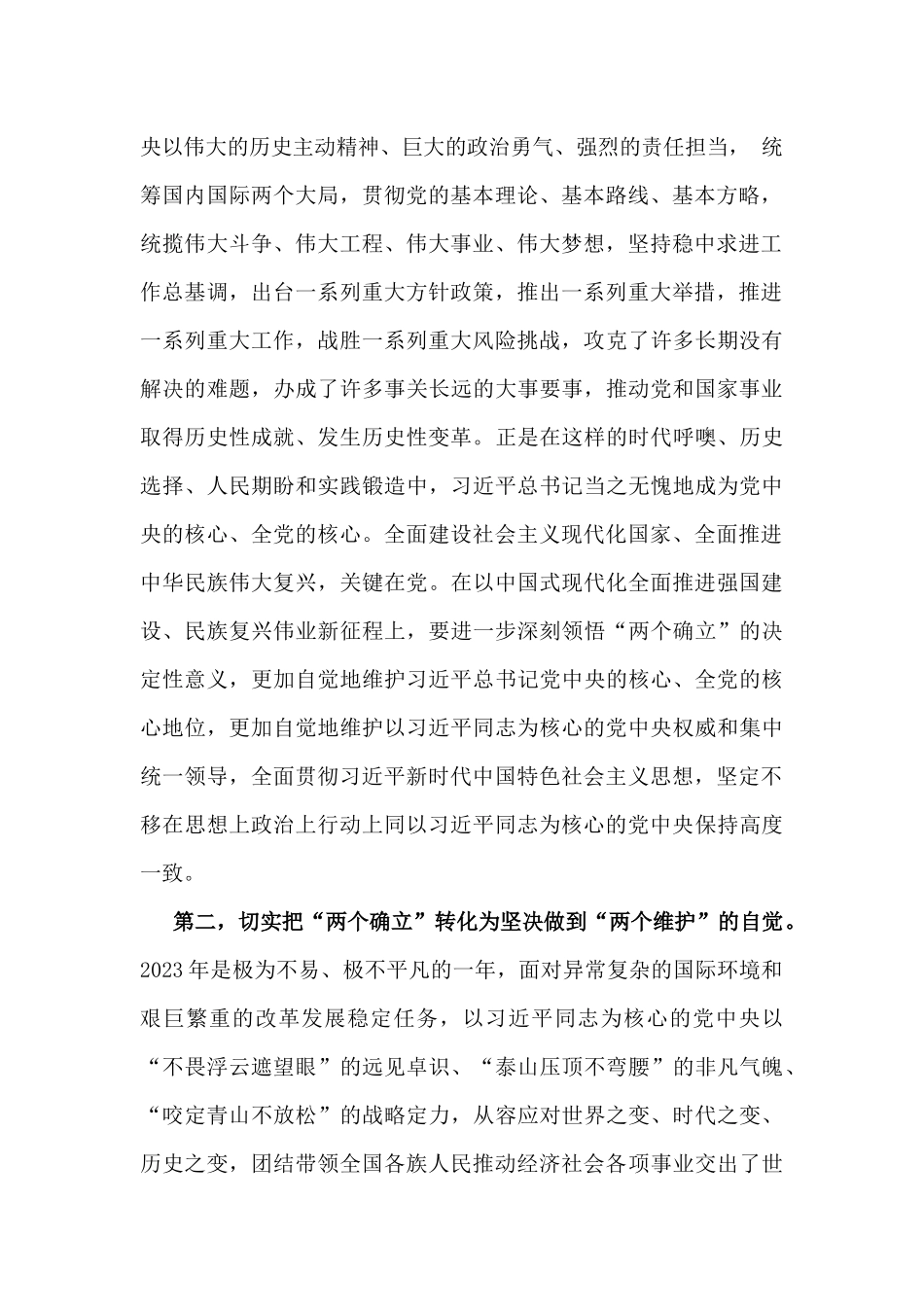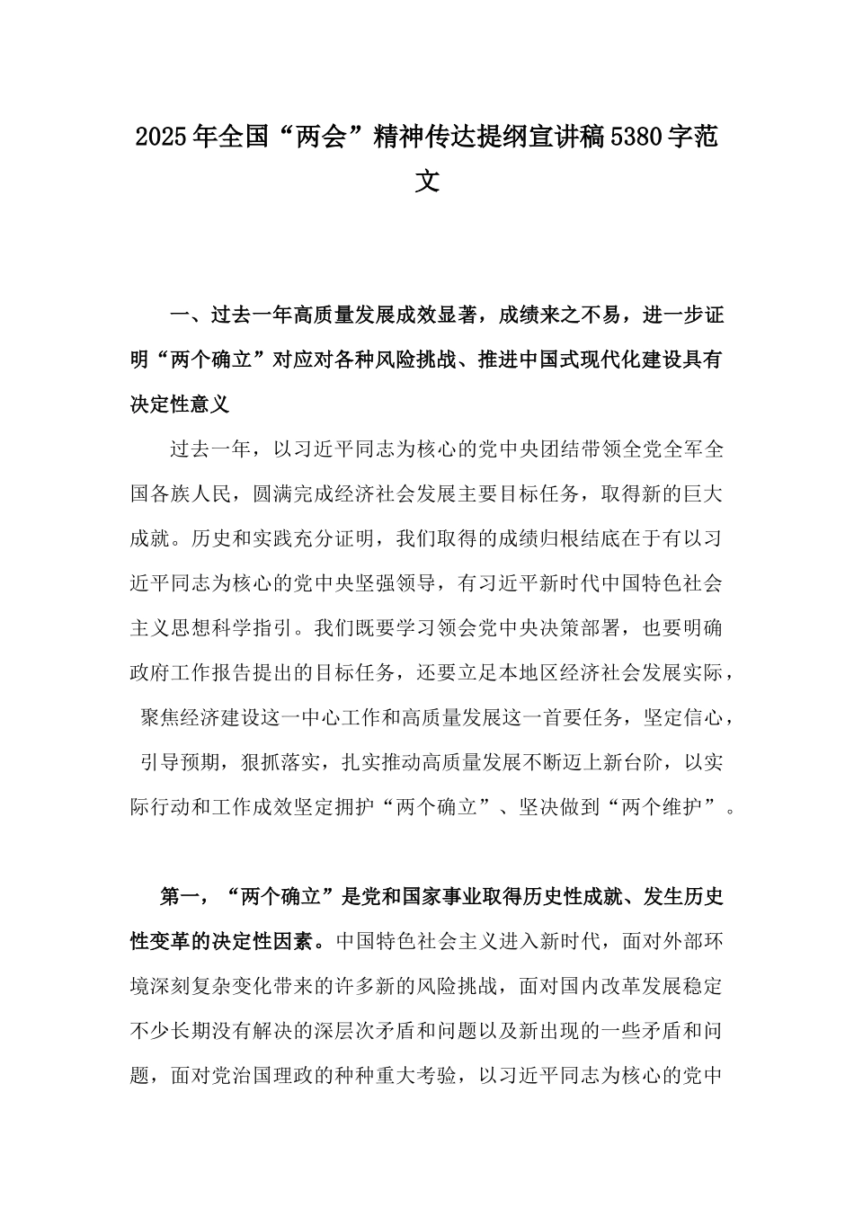 2025年全国“两会”精神传达提纲宣讲稿5380字范文一、过去一年高质量发展成效显著,成绩来之不易,进一步证明“两个确立”对应对各种风险挑战、推进中国式现代化建设具有决定性意义过去一年,以习近平同志为核心的党中央团结带领全党全军全国各族人民,圆满完成经济社会发展主要目标任务,取得新的巨大成就。历史和实践充分证明,我们取得的成绩归根结底在于有以习近平同志为核心的党中央坚强领导,有习近平新时代中国特色社会主义思想科学指引。我们既要学习领会党中央决策部署,也要明确政府工作报告提出的目标任务,还要立足本地区经济社会发展实际,聚焦经济建设这一中心工作和高质量发展这一首要任务,坚定信心,引导预期,狠抓落实,扎实推动高质量发展不断迈上新台阶,以实际行动和工作成效坚定拥护“两个确立”、坚决做到“两个维护”。第一,“两个确立”是党和国家事业取得历史性成就、发生历史性变革的决定性因素。中国特色社会主义进入新时代,面对外部环境深刻复杂变化带来的许多新的风险挑战,面对国内改革发展稳定不少长期没有解决的深层次矛盾和问题以及新出现的一些矛盾和问题,面对党治国理政的种种重大考验,以习近平同志为核心的党中央以伟大的历史主动精神、巨大的政治勇气、强烈的责任担当,统筹国内国际两个大局,贯彻党的基本理论、基本路线、基本方略,统揽伟大斗争、伟大工程、伟大事业、伟大梦想,坚持稳中求进工作总基调,出台一系列重大方针政策,推出一系列重大举措,推进一系列重大工作,战胜一系列重大风险挑战,攻克了许多长期没有解决的难题,办成了许多事关长远的大事要事,推动党和国家事业取得历史性成就、发生历史性变革。正是在这样的时代呼噢、历史选择、人民期盼和实践锻造中,习近平总书记当之无愧地成为党中央的核心、全党的核心。全面建设社会主义现代化国家、全面推进中华民族伟大复兴,关键在党。在以中国式现代化全面推进强国建设、民族复兴伟业新征程上,要进一步深刻领悟“两个确立”的决定性意义,更加自觉地维护习近平总书记党中央的核心、全党的核心地位,更加自觉地维护以习近平同志为核心的党中央权威和集中统一领导,全面贯彻习近平新时代中国特色社会主义思想,坚定不移在思想上政治上行动上同以习近平同志为核心的党中央保持高度一致。第二,切实把“两个确立”转化为坚决做到“两个维护”的自觉。2023年是极为不易、极不平凡的一年,面对异常复杂的国际环境和艰巨繁重的改革发展稳定任务,以习近平同志为核心的党中央以“不畏浮云遮望眼”的远见卓识、“泰山压顶不弯腰”的非凡气魄、“咬定青山不放松”的战略定力,从容应对世界之变、时代之变、历史之变,团结带领全国各族人民推动经济社会各项事业交出了世界瞩目、人民满意的亮丽"成绩单”,成功推进和拓展了中国式现代化,用新的伟大奋斗创造了新的伟大奇迹。我们要深刻领会“两个确立”的决定性意义,深刻把握“两个确立”的必然逻辑,切实增强对“两个确立”的政治认同、思想认同、理论认同、情感认同,把“两个确立”转化为坚决做到“两个维护”的思想自觉、政治自觉、行动自觉,始终牢记习近平总书记的殷殷嘱托,以更大担当和作为,把中央经济工作会、政府工作报告确定的具体工作任务落到实处,奋力谱写现代化建设新篇章。第三,坚定拥护“两个确立”,坚决做到“两个维护”,为强国建设和民族复兴伟业营造更有利国际环境、提供更坚实战略支撑。每年全国两会,习近平总书记总会与代表委员共商国是,热切询问百姓冷暖,动情讲述生动故事,留下了许多暖心瞬间和精彩话语。我们要深刻认识,“两个确立”是推动党和国家事业取得历史性成就、发生历史性变革的决定性因素,是战胜一切艰难险阻、应对一切不确定性的最大确定性、最大底气、最大保证。我们要进一步深刻领悟“两个确立”对新时代党和国家事业发展、对推进中华民族伟大复兴历史进程具有的决定性意义,把增强“四个意识”、坚定“四个自信”、做到“两个维护”体现在理想信念、政治生活、立场定力、担当作为上,始终在思想上政治上行动上同以习近平同志为核心的党中央保持高度一致。要强化政治自觉,始终聚...