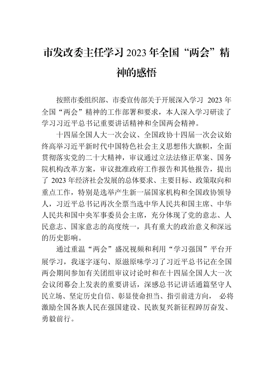 2023按照市委组织部、市委宣传部关于开展深入学习2023年全国“两会”精神的工作部署和要求,本人深入学习研读了学习习近平总书记重要讲话精神和全国两会精神。十四届全国人大一次会议、全国政协十四届一次会议始终高举习近平新时代中国特色社会主义思想伟大旗帜,全面贯彻落实党的二十大精神,审议通过立法法修正草案、国务院机构改革方案,审议批准政府工作报告和其他报告,提出了2023年经济社会发展的总体要求、主要目标、政策取向和重点工作,特别是选举产生新一届国家机构和全国政协领导人,习近平总书记再次全票当选中华人民共和国主席、中华人民共和国中央军事委员会主席,充分体现了党的意志、人民意志、国家意志的高度统一,具有重大的政治意义和深远的历史影响。通过重温“两会”盛况视频和利用“学习强国”平台开展学习,我逐字逐句、原滋原味学习了习近平总书记在全国两会期间参加有关团组审议讨论时和在十四届全国人大一次会议闭幕会上发表的重要讲话,深感总书记讲话通篇坚守人民立场、坚定历史自信、彰显使命担当、指引前进方向,必将激励全国各族人民在强国建设、民族复兴新征程踔厉奋发、勇毅前行。当前,我们正全面、完整、准确理解新发展理念,全力推动构建新发展格局,面临的改革发展稳定工作任务日趋繁重,作为一名长期奋战在高质量发展一线的干部,深入学习领会“两会”精神的丰富内涵和精神实质,特别是“两会”中明确的新思想、新举措、新目标,对做好新时期改革发展工作极为重要。一是坚持深刻领悟“两个确立”的决定性意义。充分认识习近平总书记再次全票当选,反映了全体全国人大代表的共同意志和全国各族人民的共同心愿,表明了习近平总书记是全党拥护、人民爱戴、当之无愧的党的核心、军队统帅、人民领袖,切实增强拥护“两个确立”、做到“两个维护”的思想自觉、政治自觉、行动自觉,思想上认同核心、政治上维护核心、组织上服从核心、行动上紧跟核心,把“两个确立”的政治共识转化为“两个维护”的行动自觉。二是坚持把学习贯彻全国两会精神作为当前重要任务。我们要将深入学习“两会”精神与持续深入学习贯彻党的二十大和二十届二中全会精神结合起来,与即将开展的学习贯彻习近平新时代中国特色社会主义思想主题教育结合起来,精心安排部署,周密组织实施,推动全国两会精神在XXX落地见效。同时,要充分认识修改立法法是加强党对立法工作全面领导、推进全面依法治国、发展全过程人民民主的重要举措,准确把握修改的指导思想、基本原则、主要内容,紧紧围绕全面依法治市目标,适应改革发展稳定需要,坚持把依法治理、依法行政的理念和举措贯彻到全市发展改革工作的全过程和各阶段。三是要深入推动XX市高质量发展走深走实。作为领导干部,要坚持深入学习领会,带头组织专题学习和研讨,吃透精神实质,把握核心要义;要以身作则、以上率下,抓紧自身学习,抓好分管领域学习,切实用以统一思想、振奋精神、指导实践。要主动大力宣传宣讲,充分利用各种宣传形式和手段,大力宣传全国两会精神,解读好新思想新观点新举措,展现好贯彻落实的成效;深入开展面向基层、面向各族群众的分众化、互动化宣讲,引导干部群众准确理解全国两会精神,自觉把学习成果转化为奋进新征程、建功新时代的实际行动。要全面贯彻落实,与XXX高质量发展实际结合起来,与当前工作结合起来,牢牢把握高质量发展这个首要任务,锚定全年发展目标,统筹抓好维护稳定、发展产业、安全生产、防范化解重大风险等工作,扎实推进中国式现代化的XXX实践,坚定不移沿着习近平总书记指引的方向前进。要把紧项目准入关口,以最小代价换取经济发展。要强化对大企业、大项目建设运营全过程参与和监管,建立健全项目考核和退出机制,努力蹚出一条高质量发展的新路子。