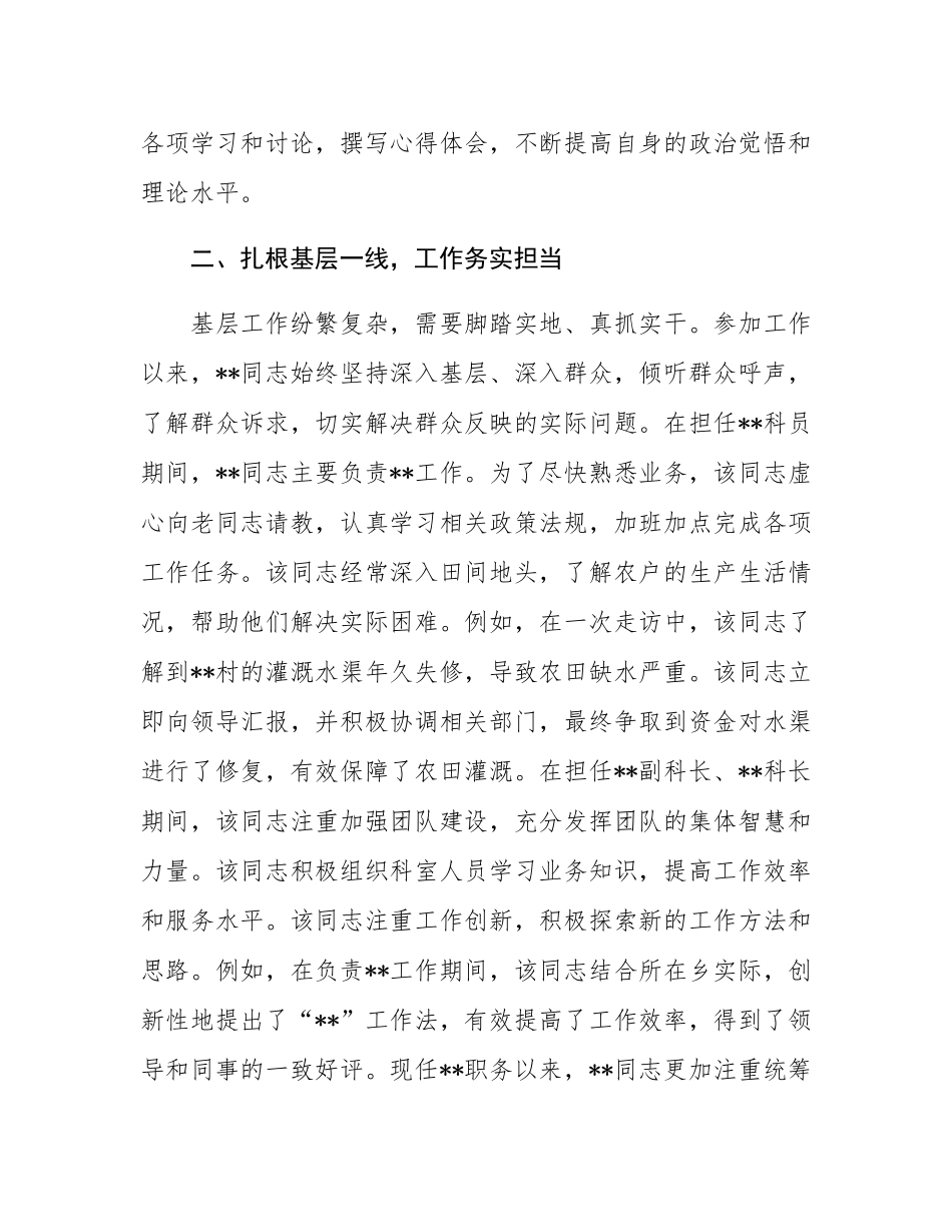 乡镇干部个人现实表现材料***,男,汉族,中共党员,**年*月出生于**省**市**县,**年*月毕业于**大学**专业,同年*月进入**乡镇人民政府工作,历任**科员、**副科长、**科长等职,现任**乡镇**职务。回顾参加工作以来的点点滴滴,该同志始终牢记党的宗旨,扎根基层,勤勉工作,努力为乡镇发展贡献力量。一、政治立场坚定,理论学习扎实**同志始终把学习贯彻新时代中国特色社会主义思想作为首要政治任务,通过集中学习、个人自学、研讨交流等多种形式,系统学习党的二十大精神,深刻领会其核心要义和丰富内涵。该同志注重理论联系实际,将学习成果转化为指导实践、推动工作的强大动力。例如,在负责脱贫攻坚工作期间,该同志深入学习总书记关于扶贫工作的重要论述,结合所在乡实际,制定了切实可行的帮扶措施,有效提高了脱贫攻坚的成效。**同志积极参加党组织的各项活动,按时缴纳党费,认真参加组织生活会,勇于开展批评与自我批评。在“不忘初心、牢记使命”主题教育、“党史学习教育”等活动中,该同志积极参与各项学习和讨论,撰写心得体会,不断提高自身的政治觉悟和理论水平。二、扎根基层一线,工作务实担当基层工作纷繁复杂,需要脚踏实地、真抓实干。参加工作以来,**同志始终坚持深入基层、深入群众,倾听群众呼声,了解群众诉求,切实解决群众反映的实际问题。在担任**科员期间,**同志主要负责**工作。为了尽快熟悉业务,该同志虚心向老同志请教,认真学习相关政策法规,加班加点完成各项工作任务。该同志经常深入田间地头,了解农户的生产生活情况,帮助他们解决实际困难。例如,在一次走访中,该同志了解到**村的灌溉水渠年久失修,导致农田缺水严重。该同志立即向领导汇报,并积极协调相关部门,最终争取到资金对水渠进行了修复,有效保障了农田灌溉。在担任**副科长、**科长期间,该同志注重加强团队建设,充分发挥团队的集体智慧和力量。该同志积极组织科室人员学习业务知识,提高工作效率和服务水平。该同志注重工作创新,积极探索新的工作方法和思路。例如,在负责**工作期间,该同志结合所在乡实际,创新性地提出了“**”工作法,有效提高了工作效率,得到了领导和同事的一致好评。现任**职务以来,**同志更加注重统筹协调和全局把握。该同志积极参与乡镇的各项重大决策和部署,认真履行职责,努力完成各项工作任务。该同志注重调查研究,深入了解所在乡经济社会发展的现状和面临的挑战,为乡镇领导提供决策参考。三、作风务实清廉,严于律己守纪**同志始终坚持以一名共产党员的标准严格要求自己,自觉遵守党纪国法和各项规章制度,做到清正廉洁、作风务实。该同志注重加强自身修养,不断提高道德品质和思想境界。该同志自觉抵制各种不正之风,不利用职务之便谋取私利。**同志注重家庭家教家风建设,教育引导家人树立正确的价值观和人生观。该同志自觉接受群众监督,虚心听取群众意见,不断改进工作作风。四、存在的不足和今后努力方向回顾过去的工作,虽然取得了一些成绩,但也存在一些不足之处:一是理论学习还不够深入系统,对一些新理论、新知识学习不够及时;二是工作方法还不够灵活,创新意识还不够强;三是与群众的沟通交流还不够深入,对群众的了解还不够全面。在今后的工作中,该同志将继续加强理论学习,不断提高自身的政治素质和理论水平;继续深入基层、深入群众,倾听群众呼声,了解群众诉求,切实解决群众反映的实际问题;继续改进工作作风,提高工作效率和服务水平;继续加强自身修养,做到清正廉洁、作风务实。**同志坚信,在党的领导下,通过不懈努力,一定能够为乡镇的发展做出更大的贡献。以上是**同志的现实表现材料,恳请组织审查。