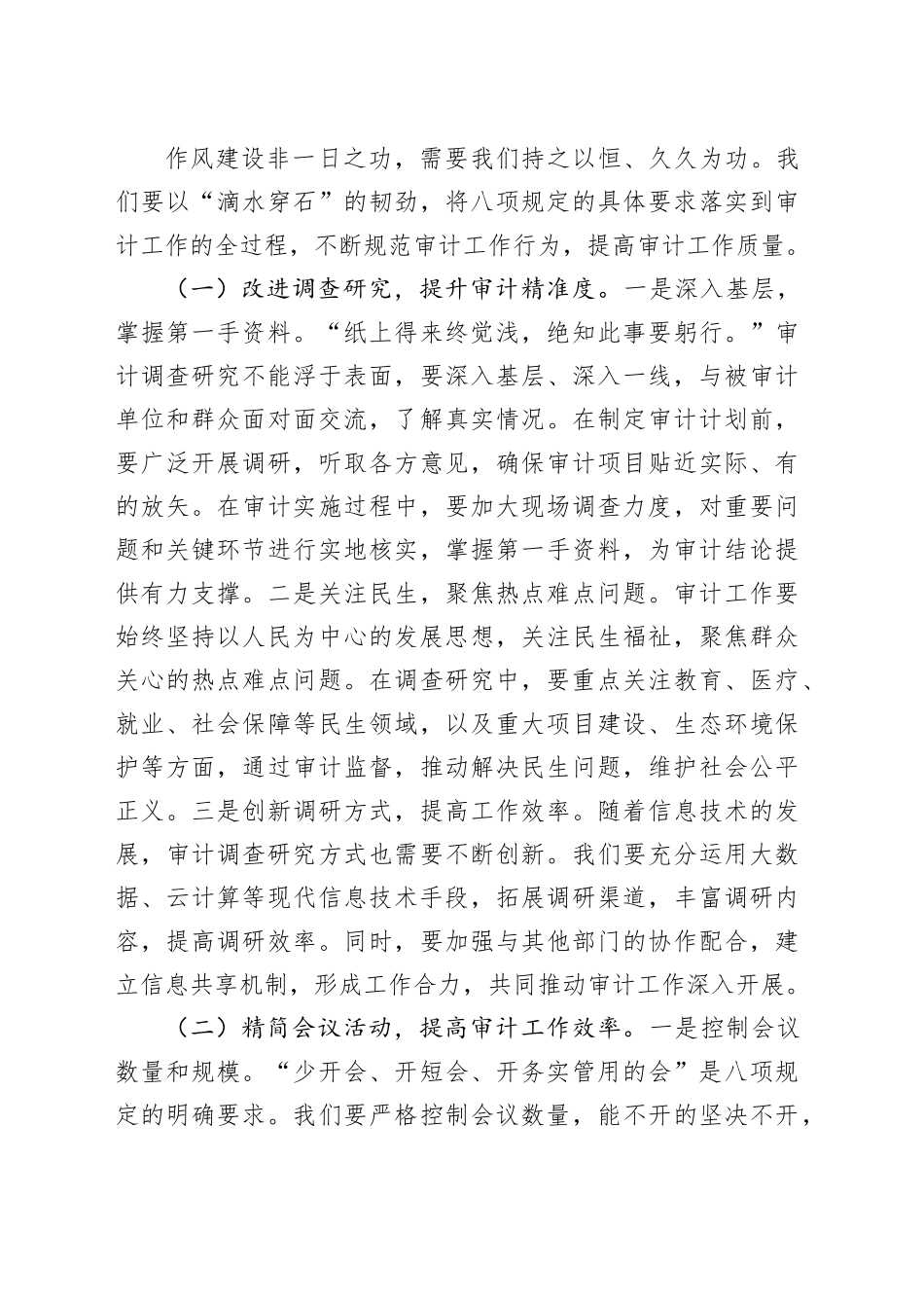 学习《党的十八大以来深入贯彻中央八项规定精神的成效和经验》交流发言同志们:此次专题学习《党的十八大以来深入贯彻中央八项规定精神的成效和经验》及《八项规定改变中国》,让我深感作风建设于党和国家事业发展的重大意义。下面,围绕研讨交流主题,结合我局工作实际,与大家分享一些学习体会。一、以“刮骨疗毒”的决心,筑牢作风建设思想根基,提升审计政治站位思想是行动的先导,作风建设的首要任务便是夯实思想基础。中央八项规定的出台,为全党树立了行为规范的标杆,也为我们审计工作指明了方向。我们必须以“刮骨疗毒”的决心,从思想深处认识到作风建设的重要性,将其融入审计工作的每一个环节。(一)深刻领悟八项规定内涵,强化政治担当。中央八项规定,短短600余字,却涵盖了改进调查研究、精简会议活动、精简文件简报、规范出访活动、改进警卫工作、改进新闻报道、严格文稿发表、厉行勤俭节约等八个方面,切中时弊,针对性极强。我们要深入学习,领会其精神实质,认识到这不仅是对工作作风的要求,更是对我们政治素养的考验。审计机关作为国家监督体系的重要组成部分,肩负着维护经济秩序、保障民生福祉的重任,只有深刻领悟八项规定内涵,才能在工作中保持政治敏锐性,强化政治担当,做到对党忠诚、对人民负责。(二)增强纪律意识和规矩意识,严守审计底线。“欲知平直,则必准绳;欲知方圆,则必规矩。”纪律和规矩是党的生命线,也是我们审计工作的生命线。八项规定明确了纪律红线,我们要将其作为行为准则,时刻保持警醒。在审计工作中,严守审计纪律、廉政纪律和工作纪律,坚决杜绝以权谋私、吃拿卡要等行为,做到依法审计、廉洁审计、文明审计。同时,要加强对审计人员的纪律教育,通过开展警示教育、廉政谈话等方式,让纪律意识和规矩意识入脑入心,成为审计人员的自觉行动。(三)树立正确的政绩观和价值观,服务发展大局。政绩观和价值观决定着我们的工作方向和工作成效。八项规定的核心在于求真务实、为民服务,我们要以此为指引,树立正确的政绩观和价值观。在审计工作中,不以追求数量为目标,而以提高质量为核心,注重审计成果的运用,切实解决人民群众关心的热点难点问题。要围绕市委市政府中心工作,服务经济社会发展大局,通过审计监督,推动政策落实、促进改革发展、维护群众利益,为XX都市圈高质量发展贡献审计力量。二、以“滴水穿石”的韧劲,落实八项规定具体要求,规范审计工作行为作风建设非一日之功,需要我们持之以恒、久久为功。我们要以“滴水穿石”的韧劲,将八项规定的具体要求落实到审计工作的全过程,不断规范审计工作行为,提高审计工作质量。(一)改进调查研究,提升审计精准度。一是深入基层,掌握第一手资料。“纸上得来终觉浅,绝知此事要躬行。”审计调查研究不能浮于表面,要深入基层、深入一线,与被审计单位和群众面对面交流,了解真实情况。在制定审计计划前,要广泛开展调研,听取各方意见,确保审计项目贴近实际、有的放矢。在审计实施过程中,要加大现场调查力度,对重要问题和关键环节进行实地核实,掌握第一手资料,为审计结论提供有力支撑。二是关注民生,聚焦热点难点问题。审计工作要始终坚持以人民为中心的发展思想,关注民生福祉,聚焦群众关心的热点难点问题。在调查研究中,要重点关注教育、医疗、就业、社会保障等民生领域,以及重大项目建设、生态环境保护等方面,通过审计监督,推动解决民生问题,维护社会公平正义。三是创新调研方式,提高工作效率。随着信息技术的发展,审计调查研究方式也需要不断创新。我们要充分运用大数据、云计算等现代信息技术手段,拓展调研渠道,丰富调研内容,提高调研效率。同时,要加强与其他部门的协作配合,建立信息共享机制,形成工作合力,共同推动审计工作深入开展。(二)精简会议活动,提高审计工作效率。一是控制会议数量和规模。“少开会、开短会、开务实管用的会”是八项规定的明确要求。我们要严格控制会议数量,能不开的坚决不开,能合并的坚决合并。对于必须召开的会议,要提前做好充分准备,明确会议主题和议程,精简会议内容,控制会议规模和时间,提高会...