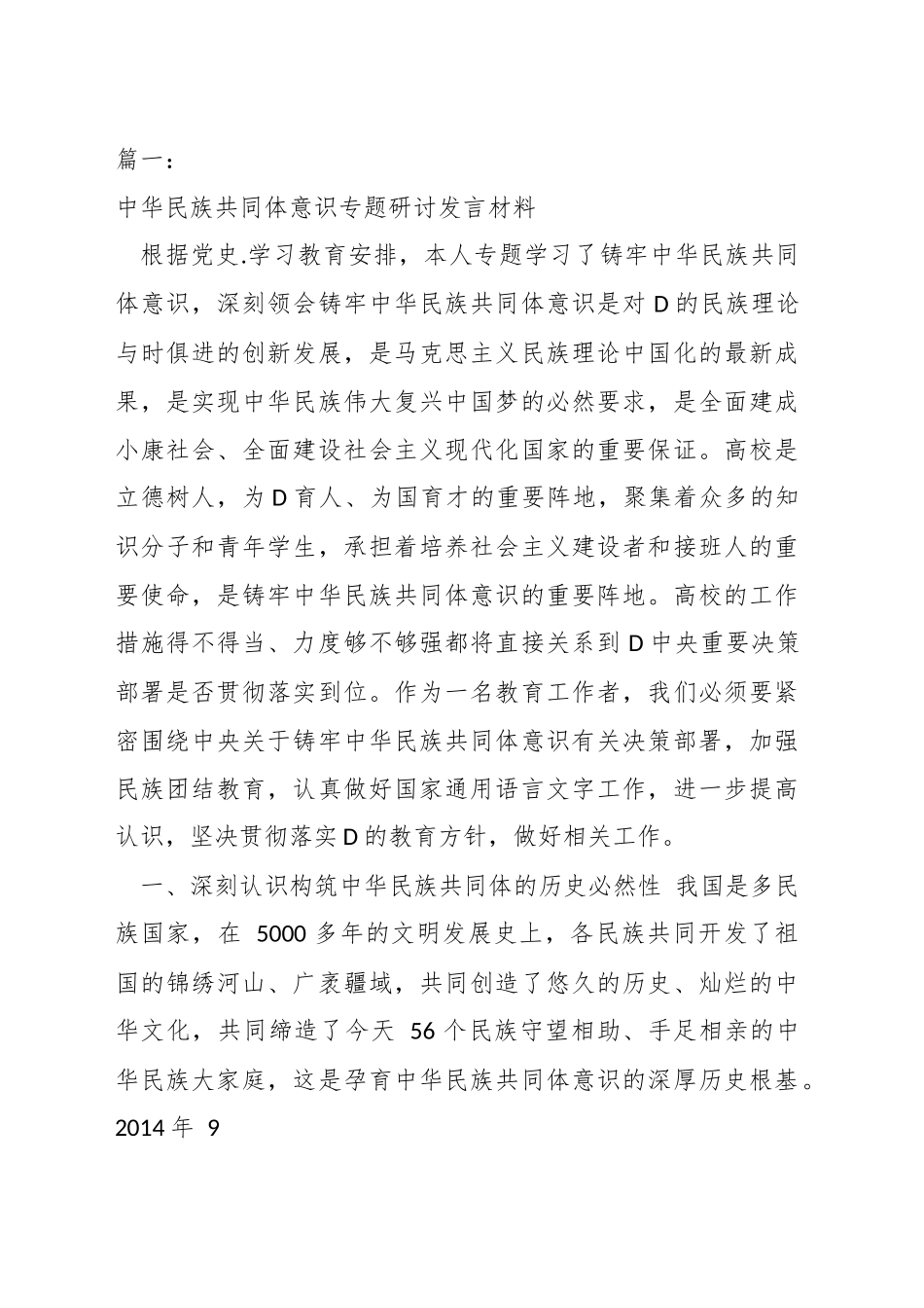 篇一:中华民族共同体意识专题研讨发言材料根据党史.学习教育安排,本人专题学习了铸牢中华民族共同体意识,深刻领会铸牢中华民族共同体意识是对D的民族理论与时俱进的创新发展,是马克思主义民族理论中国化的最新成果,是实现中华民族伟大复兴中国梦的必然要求,是全面建成小康社会、全面建设社会主义现代化国家的重要保证。高校是立德树人,为D育人、为国育才的重要阵地,聚集着众多的知识分子和青年学生,承担着培养社会主义建设者和接班人的重要使命,是铸牢中华民族共同体意识的重要阵地。高校的工作措施得不得当、力度够不够强都将直接关系到D中央重要决策部署是否贯彻落实到位。作为一名教育工作者,我们必须要紧密围绕中央关于铸牢中华民族共同体意识有关决策部署,加强民族团结教育,认真做好国家通用语言文字工作,进一步提高认识,坚决贯彻落实D的教育方针,做好相关工作。一、深刻认识构筑中华民族共同体的历史必然性我国是多民族国家,在5000多年的文明发展史上,各民族共同开发了祖国的锦绣河山、广袤疆域,共同创造了悠久的历史、灿烂的中华文化,共同缔造了今天56个民族守望相助、手足相亲的中华民族大家庭,这是孕育中华民族共同体意识的深厚历史根基。2014年9月,在中央民族工作会议暨国务院第六次全国民族团结进步表彰大会上的重要讲话中指出:“加强中华民族大团结,长远和根本的是增强文化认同,建设各民族共有精神家园,积极培养中华民族共同体意识”。在D的十九大报告中,指出:“全面贯彻D的民族政策,深化民族团结进步教育,铸牢中华民族共同体意识,加强各民族交往交流交融,促进各民族像石榴籽一样紧紧抱在一起,共同团结奋斗、共同繁荣发展”。D的十九大把“铸牢中华民族共同体意识”正式写入D章,成为全D全国各族人民实现中国梦新征程上的共同意志和根本遵循。“铸牢中华民族共同体意识”这一重大论断,是对我国基本国情和历史传统的准确把握,是对中华民族团结进步规律的深刻揭示,也是D带领全国各族人民不懈奋斗,实现中华民族伟大复兴的强大基础和必然要求。二、深刻理解推广普及国家通用语言文字工作的重要意义推广普及国家通用语言文字,书写各民族交往交流交融形成的灿烂中华文化,是铸牢中华民族共同体意识的重要内容。近年来,随着少数民族地区经济社会的发展、人员交流频繁、网络、电视和新型媒体的普及,特别是少数民族地区学前教育迅速发展,社会语言环境发生了巨大变化,少数民族地区已经具备了将国家通用语言文字作为基本教育教学语言的条件。D的十九大以来,D和国家对加快民族地区发展教育、推广普及国家通用语言文字、推行使用国家统编教材作出了一系列部署和安排。特别是国家通用语言文字成为教育教学的基本语言,极大促进了民族地区教育质量和水平的提升。2021年3月5日,在参加内蒙古代表团审议时发表重要讲话并强调,要倍加珍惜、继续坚持民族团结光荣传统和“模范自治区”崇高荣誉,巩固发展民族团结大局。要抓好党史.学习教育,教育引导全体D员不忘初心、牢记使命,坚定不移为中国人民谋幸福、为中华民族谋复兴。民族团结是各族人民的生命线,高度重视民族工作,多次深入调研、体察冷暖,亲自部署、亲自推动召开一系列重要会议,作出一系列重大决策部署。在D中央亲切关怀下,从雪域高原到天山南北,从祖国北疆到西南边陲,少数民族贫困群众全部脱贫,全面小康阳光普照,民族地区面貌日新月异,少数民族群众生活蒸蒸日上,各民族同胞手足相亲、守望相助,像石榴籽一样紧紧抱在一起,谱写出新时代民族团结进步事业的光辉篇章。站在新起点,我们D要团结带领人民,实现中华民族伟大复兴这个共同目标,就需要各民族共同团结奋斗、共同发展繁荣,牢记汉族离不开少数民族、少数民族离不开汉族、各少数民族之间也相互离不开,在促进民族团结方面把工作做细做实。要通过文化认同筑牢民族团结之根,凝聚民族和睦之魂;要深入开展中华民族共同体意识教育,引导广大干部群众全面理解D的政策;要认真做好推广普及国家通用语言文字工作,全面推行使用国家统编教材,树立爱国观念,抵制错误思潮,以全面认同为民族复兴凝聚合力。三、坚决推进国家...