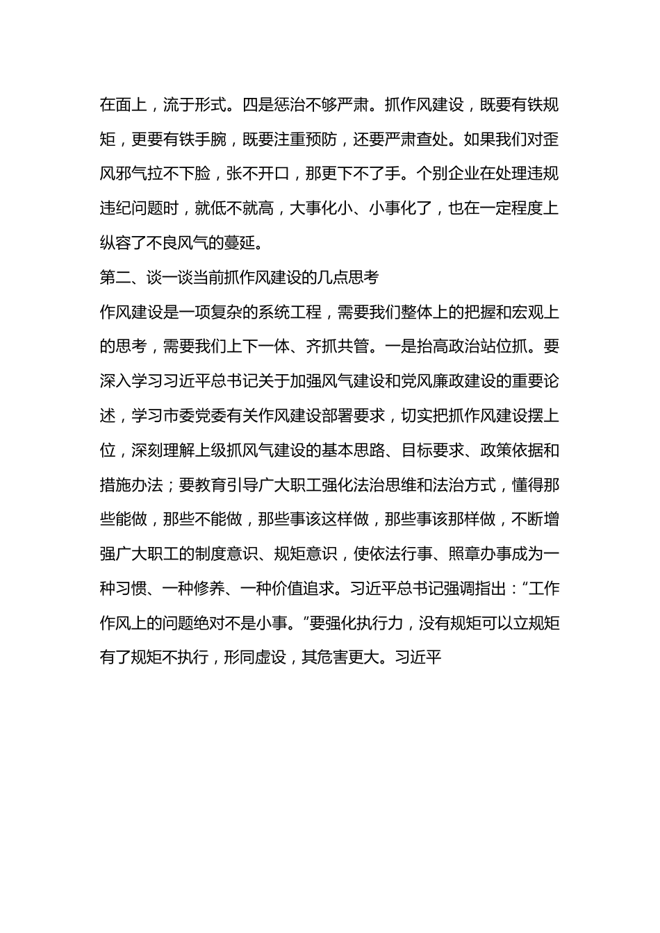 Xx公司企业2022年底作风纪律专项整治讲评会讲话公司专项作风纪律整顿以来,各下属单位做了大量工作,这里不一一列举,这也是体现作风纪律要求。我只讲2个问题。第一、存在哪些模糊认识?这些年,我们公司各级党支部在抓作风建设上,思想认识总体在提高,观念态度不断在端正,但仍有极少数下属企业和个人仍存在一些模糊的认识。一是认识还不够到位。当前,少数同志仍然还存有旧的思想、旧的行为、旧的习惯,执行企业新规新纪跟的不紧、不适应、不到位、不彻底。有的因学习跟不上,存在对新规新纪知之不多不深,掌握不准不细等不懂不会的问题。有的因认识不到位,存在片面认为只要没有经济腐败问题,其它都是小问题,不算事等错误观点;有的因执行不严格,存在原来就这样的惯性做法,差不多的模糊执行,其它单位也这么做的参照落实等软性弹性问题;有的因贯彻不自觉,存在软执行,变通执行、选择性执行、凭个人好恶执行等末端偏差问题。二是工作不够有力。现在一些企业在抓作风建设上还存在力度不够,抓而不紧、抓而不实,雷声大雨点小,甚至说一套做一套,有的上级不强调不抓,不出问题不抓,时紧时松,不能一以贯之,有的头疼医头,脚疼医脚,工作不成体系,没有套路;有的推给党办部门,工作展不开、推不动,深不下去。三是落实不够扎实。个别单位组织不严,摸排不深,有的工作指导不够有力,过程不够扎实,情况掌握不够全面,该开的会不开、该组织的讨论不组织,该纠治的问题没有查摆到,浮在面上,流于形式。四是惩治不够严肃。抓作风建设,既要有铁规矩,更要有铁手腕,既要注重预防,还要严肃查处。如果我们对歪风邪气拉不下脸,张不开口,那更下不了手。个别企业在处理违规违纪问题时,就低不就高,大事化小、小事化了,也在一定程度上纵容了不良风气的蔓延。第二、谈一谈当前抓作风建设的几点思考作风建设是一项复杂的系统工程,需要我们整体上的把握和宏观上的思考,需要我们上下一体、齐抓共管。一是抬高政治站位抓。要深入学习习近平总书记关于加强风气建设和党风廉政建设的重要论述,学习市委党委有关作风建设部署要求,切实把抓作风建设摆上位,深刻理解上级抓风气建设的基本思路、目标要求、政策依据和措施办法;要教育引导广大职工强化法治思维和法治方式,懂得那些能做,那些不能做,那些事该这样做,那些事该那样做,不断增强广大职工的制度意识、规矩意识,使依法行事、照章办事成为一种习惯、一种修养、一种价值追求。习近平总书记强调指出:“工作作风上的问题绝对不是小事。”要强化执行力,没有规矩可以立规矩有了规矩不执行,形同虚设,其危害更大。习近平总书记指出:“规矩是起约束作用的,所以要紧一点。紧一点自然就不舒服。我们不舒服一点、不自在一点,老百姓的舒服度就好一点、满意度就高一点。”现在各层级为转作风正风气都立了不少好规矩,关键是要抓好落实,提高执行力,让铁规发力,让制度生威,让纪律成为带电的高压线,使大家心有所畏、言有所戒、行有所止。二要坚持形成常态抓。历史和现实告诉我们,好作风不是一天两天形成的,抓作风这个弦永远松不得,一松就可能出问题。这些年公司发生的一些歪风邪气问题甚至是经济腐败我们一直在抓,但很多问题不仅没有根除,反而像“牛皮廯”一样,治了又复发,隐形变异,其症结就在于具有很强的顽固性和反复性。所以,我们要充分利用好这次作风纪律整顿的有利契机,既要用专项治理的手段遏制不良风气的滋生蔓延,也要有和风细雨、用细功夫、慢功夫、实功夫,做到长流水不断线。各级党支部更要把这次作风纪律整顿摆上位,严格按照七个阶段,经常分析形势、研究对策,特别是针对存在的倾向性、苗头性、现实性问题,积极主动地建立完善各项规章制度,努力做到扎密笼子,形成作风建设长效化制度保障。只有坚持从易到难,由小到大,才能积小胜为大胜,从根本上解决问题。要增强问题意识,强化问题导向,从群众反映的强烈问题改起抓起,不要面面俱到,抓住一个方面就要持续用力,直到抓出成效,以一个个具体问题的解决,推动作风建设向深度广度扩展。三要坚持以上率下抓。纠治不良作风难,但千难万难,领导带...