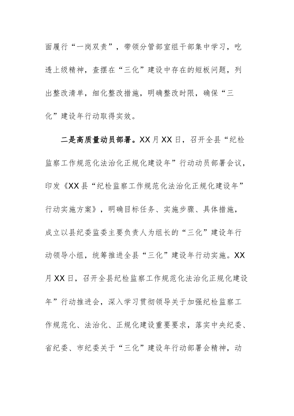 2025年关于开展“纪检监察工作规范化法治化正规化建设年”行动的汇报材料供参考开展“三化”建设年行动是深入贯彻落实领导、党中央重要要求,坚定拥护“两个确立”、坚决做到“两个维护”的具体体现。全省“纪检监察工作规范化法治化正规化建设年”行动动员部署会议后,XX县纪委监委深入学习贯彻领导关于加强纪检监察干部队伍建设的重要要求,XX同志在“纪检监察工作规范化法治化正规化建设年”行动动员部署会议上的讲话精神以及XX同志在全省“三化”建设年行动动员部署会议上的部署要求,按照《全省“纪检监察工作规范化法治化正规化建设年”行动实施方案》部署安排,结合全县实际,高站位谋划、强有力落实,推动开展全县“三化”建设年行动走深走实。一、高站位谋划部署,高标准推进落实一是高站位组织谋划。XX月XX日,召开县纪委常委会,第一时间传达学习领导关于加强纪检监察干部队伍建设的重要要求,中央纪委、省市纪委监委“三化”建设年行动动员部署会议精神,研究贯彻落实意见,部署开展全县纪检监察工作规范化法治化正规化建设年”行动,把“三化”建设年行动作为推进纪检监察工作高质量发展的主线,与纪检监察日常工作同部署、同推进、同落实,成立由主要负责人担任组长的“三化”建设年行动领导小组,下设办公室和工作专班统筹推进“三化”建设年行动实施。委主要领导靠前指挥、统筹部署,多次作出专门批示、到镇街纪工委、县管国有企业及职业学校等纪检监察机构调研指导,推动“三化”建设年行动深入开展;班子成员全面履行“一岗双责”,带领分管部室组干部集中学习,吃透上级精神,查摆在“三化”建设中存在的短板问题,列出整改清单,细化整改措施,明确整改时限,确保“三化”建设年行动取得实效。二是高质量动员部署。XX月XX日,召开全县“纪检监察工作规范化法治化正规化建设年”行动动员部署会议,印发《XX县“纪检监察工作规范化法治化正规化建设年”行动实施方案》,明确目标任务、实施步骤、具体措施,成立以县纪委监委主要负责人为组长的“三化”建设年行动领导小组,统筹推进全县“三化”建设年行动实施。XX月XX日,召开全县纪检监察工作规范化法治化正规化建设年”行动推进会,深入学习贯彻领导关于加强纪检监察工作规范化、法治化、正规化建设重要要求,落实中央纪委、省纪委、市纪委关于“三化”建设年行动部署会精神,动员全县纪检监察组织以严深细实的作风、精准有效的举措,深入推进“三化”建设,有力推动我县纪检监察工作高质量发展。三是高标准统筹推进。将“三化”建设年行动与纪检监察工作高质量发展统筹推进,建立“委领导+部室组+镇街纪工委”协调联动机制,对推进“三化”建设年行动情况进行调研指导,及时研究解决工作中遇到的困难和问题。坚持“一月一调度、一季度一通报”,定期调度推进情况,及时研究解决问题,推动各项任务落实落地。二、聚焦主责主业,统筹推进“三化”建设一是聚焦规范化建设,在工作机制上再优化。坚持把“三化”建设年行动作为推动纪检监察工作高质量发展的有力抓手,以纪检监察工作规范化建设为基础,全面提升纪检监察工作法治化、正规化水平。二是聚焦法治化建设,在制度执行上再严格。将“三化”建设年行动与开展深入贯彻中央八项规定精神学习教育结合起来,持续一体贯通深化正风肃纪反腐,既“由风查腐”,又“由腐纠风”。深化“室组地”联动,完善问题线索移送、问题线索研判、监督检查、审查调查、案件移送、以案促改等工作机制,健全办案工作流程和监督检查、审查调查、案件审理、案件管理等各项制度,严格依规依纪依法开展监督检查和审查调查,强化对制度执行情况的监督检查,确保纪检监察权始终在法治轨道上运行。三是聚焦正规化建设,在队伍建设上再强化。将“三化”建设年行动与干部队伍建设结合起来,坚持把ZZ标准放在首位,不断提高纪检监察干部ZZ判断力、ZZ领悟力、ZZ执行力。严格落实新时代党的组织路线,坚持好干部标准,健全干部培养选拔、轮岗交流机制,优化队伍结构,形成能者上、庸者下、劣者汰的良好局面。建立健全办案质量体系,完善办案相关制度,健全巡视巡察工作体制机制,深化对办案重...