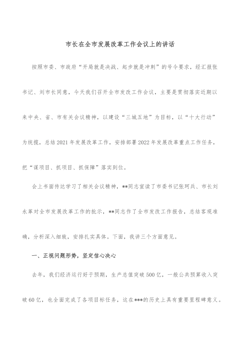 市长在全市发展改革工作会议上的讲话按照市委、市政府“开局就是决战、起步就是冲刺”的号令要求,经汇报张书记、刘市长同意,今天我们召开全市发改工作会议,主要是贯彻落实近期以来中央、省、市有关会议精神,以建设“三城五地”为目标,以“十大行动”为统揽,总结2021年发展改革工作,安排部署2022年发展改革重点工作任务,把“谋项目、抓项目、抓保障”落实到位。会上书面传达学习了相关会议精神,**同志宣读了市委书记张珂兵、市长刘永革对全市发展改革工作的批示,**同志作了全市发改工作报告,总结客观准确,分析深入细致,安排扎实具体。下面,我讲三个方面意见。一、正视问题形势,坚定信心决心去年,我们经济运行好于预期,生产总值突破500亿,一般公共预算收入突破60亿,也全面完成了各项目标任务,这在***的历史上具有重要里程碑意义。具体的工作成绩,前面郝爱龙同志的报告中,已进行了全面总结,我不再细说。在现代化建设进程中能够迈上新的台阶,取得这样的成绩,离不开各级各部门围绕中心、抓住抓重的拼搏实干。但是2021年我市第三季度重点工作评价排名全省第九,第四季度排名全省第12位,下滑三位,未完成市委、市政府“保九争八”的目标任务。张书记在正月初七召开的市委理论中心组学习会上提出了严重警告。刘市长在近三天连续召开的办公会上,提出了严厉警示和指示,要求今年每季度都要稳中有进。当前的发展形势不容乐观,必须引起我们的高度重视。从全省环境看,我们发展的势头已经落后。前天上午我们参加了全省经济运行调度会,聆听了任省长的重要讲话。任省长要求要“拔节育穗、蓄力起跳、后发赶超”,要“昂首挺进、互鉴同进、对标争进、担责勇进、以督促进”。这让我们深刻体会到省委、省政府大干项目、大抓发展的决心意志。***、**新区签订的都是几百亿的大项目,而**这几年没有落地一个10亿元以上的项目。虽然我们GDP绝对数完成502亿元,但仅比定西市500亿元高2亿元,与张掖市528亿元差距拉大到26亿元。这让我们深刻感受到与省内市州的明显差距,务必要保持慢进则退的高度清醒。如果再不加快发展,将会被甩的越来越远。从指标分析看,我们的短板弱项还很突出。因防范处置非法集资工作不力减0.09分。我们的招商引资成效扣1分排名倒数第4,省列重大项目完成情况扣0.2分排名倒数第2,专项债券资金使用扣0.25分排名倒数第2,规上工业增加值增量及增速扣0.2分排名倒数第6,工业固定资产投资增量及增速扣0.6分排名倒数第1。这些数字充分说明,经济总量小、工业弱、招商引资不力、谋划项目不够仍然是我们最大的弱项和短板。从自身工作看,还存在一些不容忽视的问题。一是政策研究不透。一些县区和部门对国家、省上政策研究不透,在市、县区项目库中,符合政策导向、能够吸引社会投资、前期工作扎实的大项目、好项目,如“一带一路”西部陆海新通道建设、西部大开发、长江经济带、成渝地区双城经济圈、“双碳”类的项目不多。二是项目储备不力。一些县区和部门对项目重视程度不够,储备项目严重不足。特别是债券项目方面,农业林业等行业项目进入清单项目数为零,自2020年以来农林项目没有争取到专项债券资金支持。三是推工业办法不多。“无工不富”,有的县区甚至忘记了抓工业。全市规上工业增加值增量及增速、中小微企业发展情况、工业固定资产投资增量及增速等3项指标退步,反映了我们抓工业办法不多、力度不强。四是招商引资效果不好。招商引资成效主要考核省外到位资金同比增长率,省级重大招商引资活动项目签约额,非省级节会项目签约额,项目资金到位率,项目开工率5项子指标,我市项目资金到位率、开工率偏低,导致招商引资成效长期排名靠后,失分较多。若不是腊月二十九,发改委的同志还守在兰州,在被约谈和表态的就是我们。针对当前形势和存在的问题,市委、市政府对今年工作提出的一些硬任务、硬要求,特别是刘市长在昨天下午政府常务会上明确提出:一是及时调整指标。对2022年全市主要经济调度目标进行调整,地区生产总值增长10%,一产、二产、三产增加值分别增长8.5%、9.5%、11%。工业增加值和规上工业增加值分别增长10%、14%,建筑业增加值增长6...