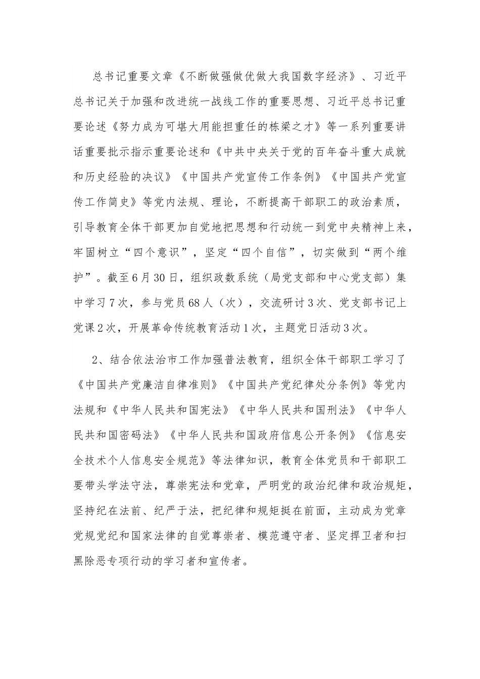 市政务服务数据管理局2022年工作汇报材料今年上半年,政数局在*市委市政府正确领导和上级有关部门指导以及相关部门的配合支持下,坚持以习近平新时代中国特色社会主义思想为指导,深入贯彻党的十九大及十九届历次全会精神和习近平总书记最新重要讲话重要指示精神,紧紧围绕省、*市“数字政府”改革建设和“放管服”改革工作要点,全面落实*市委“十大行动方案”和《*市政府2022年政府工作报告》各项工作任务,着力巩固党史学习教育成果,科学有序全力推进行政审批制度改革和“数字政府”建设工作,不断提高政务服务质量和效能,积极优化全市营商环境,取得了阶段性成效。现将上半年工作情况总结如下:一、主要措施及成效(一)弘扬伟大建党精神,坚定不移加强党的全面领导和党的建设。1、持续强化对党的创新理论学习。坚持把学习贯彻习近平新时代中国特色社会主义思想和习近平总书记重要讲话、重要指示批示精神作为头等大事和首要政治任务,用好“学习强国”平台和“十学讲话”“三法十条”等抓手,持续在学懂弄通做实上下功夫。旗帜鲜明的讲政治,讲学习,认真研究部署意识形态工作和落实主体责任,组织全体党员干部学习深入学习了习近平总书记对中央召开党史学习教育总结会作出的重要指示、习近平总书记在中共中央政治局召开党史学习教育专题民主生活会上的重要讲话、习近平总书记重要文章《不断做强做优做大我国数字经济》、习近平总书记关于加强和改进统一战线工作的重要思想、习近平总书记重要论述《努力成为可堪大用能担重任的栋梁之才》等一系列重要讲话重要批示指示重要论述和《中共中央关于党的百年奋斗重大成就和历史经验的决议》《中国共产党宣传工作条例》《中国共产党宣传工作简史》等党内法规、理论,不断提高干部职工的政治素质,引导教育全体干部更加自觉地把思想和行动统一到党中央精神上来,牢固树立“四个意识”,坚定“四个自信”,切实做到“两个维护”。截至6月30日,组织政数系统(局党支部和中心党支部)集中学习7次,参与党员68人(次),交流研讨3次、党支部书记上党课2次,开展革命传统教育活动1次,主题党日活动3次。2、结合依法治市工作加强普法教育,组织全体干部职工学习了《中国共产党廉洁自律准则》《中国共产党纪律处分条例》等党内法规和《中华人民共和国宪法》《中华人民共和国刑法》《中华人民共和国密码法》《中华人民共和国政府信息公开条例》《信息安全技术个人信息安全规范》等法律知识,教育全体党员和干部职工要带头学法守法,尊崇宪法和党章,严明党的政治纪律和政治规矩,坚持纪在法前、纪严于法,把纪律和规矩挺在前面,主动成为党章党规党纪和国家法律的自觉尊崇者、模范遵守者、坚定捍卫者和扫黑除恶专项行动的学习者和宣传者。3、夯实党建工作基础,增强党支部战斗堡垒作用。严格规范党支部“三会一课”、党员活动日、民主评议党员等党内政治生活制度,按时按标准做好党费收缴工作。积极开展了“创建国家森林城市绿化美化生态*”“我们的节日·春节”“我们的节日·元宵”“创建国家森林城市绿化美化生态*“我们的节日·端午”等一系列活动,进一步加强了干部职工之间交流互动,增进了同志间的友谊,进调动了干部职工的工作积极性和主动性,增强了党支部的凝聚力、创造力和战斗力。(二)深化“放管服”改革,大力提升政务服务水平。1、深化行政审批制度改革。加强部门沟通,积极协调相关单位持续推进行政审批改革,合理压缩行政审批办理时限,努力提升政务服务效率。协调住建、水利、市场监管、林业等部门承接并调整好*市直部门下放24项市级依申请权力事项和公共服务事项(其中下放16项、委托7项,明确职责1项);2、积极推进乡镇街道体制改革。积极配合我市相关部门乡镇街道体制改革工作,加大对乡镇简政放权的力度。组织相关部门将第一批县政务服务事项35项委托由乡镇实施,目前已召开了两次协调会议,完成了第一次、第二次征求意见稿。3、全力抓好重点民生实事。在巩固去年已确定的“跨省通办”事项167项和“跨域通办”事项281项的基础上,进一步征集有关部门对“跨省通办”工作方面的意见和建议,不断拓宽跨省跨域办业务范围...