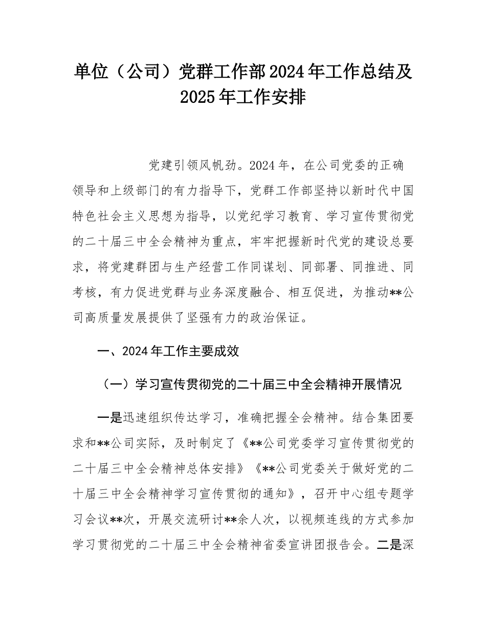 单位(公司)党群工作部2024年工作总结及2025年工作安排党建引领风帆劲。2024年,在公司党委的正确领导和上级部门的有力指导下,党群工作部坚持以新时代中国特色社会主义思想为指导,以党纪学习教育、学习宣传贯彻党的二十届三中全会精神为重点,牢牢把握新时代党的建设总要求,将党建群团与生产经营工作同谋划、同部署、同推进、同考核,有力促进党群与业务深度融合、相互促进,为推动**公司高质量发展提供了坚强有力的政治保证。一、2024年工作主要成效(一)学习宣传贯彻党的二十届三中全会精神开展情况一是迅速组织传达学习,准确把握全会精神。结合集团要求和**公司实际,及时制定了《**公司党委学习宣传贯彻党的二十届三中全会精神总体安排》《**公司党委关于做好党的二十届三中全会精神学习宣传贯彻的通知》,召开中心组专题学习会议**次,开展交流研讨**余人次,以视频连线的方式参加学习贯彻党的二十届三中全会精神省委宣讲团报告会。二是深入开展宣传宣讲,广泛兴起学习热潮。以党委会、支部“三会一课”等多种形式开展学习**次,将全会精神传达到全体党员,确保对象无遗漏、内容全覆盖。在网站、微信公众号和**平台均开设“学习贯彻党的二十届三中全会精神”专栏,转载中央媒体权威信息和公司相关资讯**篇次,集团公司挂点领导和公司党委书记在项目开展宣讲**次,公司领导班子在各支部开展宣讲**次,推动全会精神进基层、进项目、进一线。三是切实抓好贯彻落实,全力推动落地落实。坚持问题导向,结合省委巡视整改工作,开设“职工意见箱”,倾听职工心声,汇聚改革发展新动能。举办了为期**天的公司新时代中国特色社会主义思想读书班,将党的二十届三中全会精神作为重要学习内容,推动全会精神入脑入心。(二)党纪学习教育开展情况一是原原本本抓细学习研讨。坚持原原本本学、融会贯通学、联系实际学,召开举办党纪学习教育专题读书班**期,**公司两级党组织学习总书记关于全面加强党的纪律建设的重要论述**次,学习《条例》**次。**名领导班子成员和**名基层党组织书记讲授纪律党课,**人参加组织人事干部暨新提任干部、年轻干部、关键岗位干部纪律教育培训班。二是以案促学强化警示教育。用好典型案例“活教材”,深入学习《关于转发〈关于用好违纪行为典型案例的通知〉的通知》50个违纪行为典型案例,组织观看警示教育片**个,观看微视频**个。组织党员干部职工**人次参观**纪念园、**纪念堂、**陈列馆。在全司开展了违规收受茅台酒等高档烟酒、违规接受旅游、娱乐活动安排及违规吃喝问题、关于群众身边不正之风和腐败问题集中整治等相关工作,排查机关部门**个,违纪风险点数量**条,制定防范措施数量**条;党员干部违纪风险点排查**人,违纪风险点总数量**条,制定防范措施数**条。坚持立长远,印发了公司《经营管理规定》《安全生产管理提升行动方案》等文件**个,针对**案等系列整改工作,进行综合协调、跟踪调度和监督检查,确保真改实改、见底清仓。三是联系实际做实解读培训。开展了组织人事部门作风纪律专项教育工作,召开学习会议**次,讲授专题党课**次。举办了纪律教育培训班,**人参加培训。(三)省委巡视反馈问题等系列整改工作省委巡视反馈问题整改工作完成情况:根据省委巡视组反馈意见,及时协调各部门制定了公司党委关于省委巡视反馈意见的整改落实方案,明确整改原则与整改目标,成立巡视整改工作领导小组和办公室,按照动员部署、集中整改、巩固提升阶段推进,确定**个方面**项具体问题,制订**项整改措施,当前已完成**项,整改完成率达**%。制定了公司党委关于省委巡视意识形态工作专项检查反馈意见的整改落实方案,确定**个方面**项具体问题,制订**项整改措施,当前已完成**项,整改完成率达**。(四)党建与全面从严治党工作一是增强政治建设,召开党委会**次,“第一议题”学习总书记重要讲话、重要指示批示精神**篇,前置研究“三重一大”事项**个。二是加强政治理论学习。召开中心组学习会议**次,发放学习书籍**本,累计交流研讨**人次。三是明确党建任务。制定《**公司党委党建工作要点》,明确党建工作重点,细化工作举措,为全年...