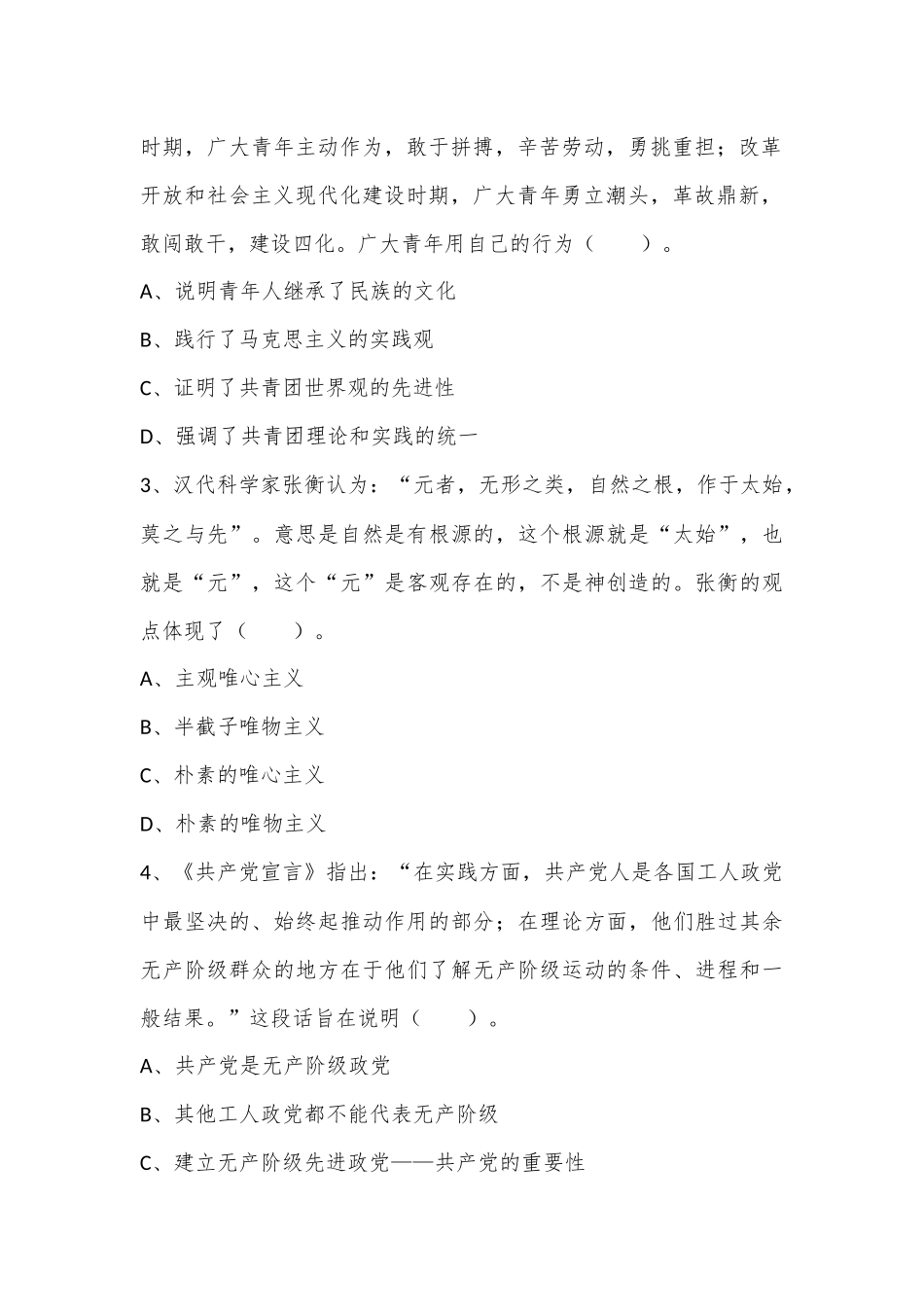 2022年吉林市秋季基层治理专干招聘考试《通用知识》精选题一、单项选择题。每小题后的四个备选答案中只有一个最符合题意的答案。1、2022年9月16日,国家主席习近平出席上海合作组织成员国元首理事会并发表重要讲话。习近平指出,当前,世界百年未有之大变局正在加速演进,世界进入新的动荡变革期。人类社会正站在十字路口,面临前所未有的挑战。新形势下,上海合作组织作为国际和地区事务中重要建设性力量,要勇于面对国际风云变幻,牢牢把握时代潮流。不断加强团结合作,推动构建更加紧密的上海合作组织命运共同体。这段话说明()。A、世界的联系就像国际组织更迭一样,面临着前所未有的挑战B、人们可以创造事物之间的联系,区域间合作组织就是这种创造的结果C、世界的联系具有主观性,动荡变革的原因是有些国家主动割裂这种联系D、世界是普遍联系的,永恒发展的,我们要在正确认识的基础上利用这种联系性2、2022年5月,在庆祝中国共产主义青年团成立100周年大会上,习近平指出,新民主主义革命时期,广大青年投身反帝反封建的工人运动、农民运动和学生运动,积极参加革命武装;社会主义革命和建设时期,广大青年主动作为,敢于拼搏,辛苦劳动,勇挑重担;改革开放和社会主义现代化建设时期,广大青年勇立潮头,革故鼎新,敢闯敢干,建设四化。广大青年用自己的行为()。A、说明青年人继承了民族的文化B、践行了马克思主义的实践观C、证明了共青团世界观的先进性D、强调了共青团理论和实践的统一3、汉代科学家张衡认为:“元者,无形之类,自然之根,作于太始,莫之与先”。意思是自然是有根源的,这个根源就是“太始”,也就是“元”,这个“元”是客观存在的,不是神创造的。张衡的观点体现了()。A、主观唯心主义B、半截子唯物主义C、朴素的唯心主义D、朴素的唯物主义4、《共产党宣言》指出:“在实践方面,共产党人是各国工人政党中最坚决的、始终起推动作用的部分;在理论方面,他们胜过其余无产阶级群众的地方在于他们了解无产阶级运动的条件、进程和一般结果。”这段话旨在说明()。A、共产党是无产阶级政党B、其他工人政党都不能代表无产阶级C、建立无产阶级先进政党——共产党的重要性D、只有共产党,才能领导人民进入共产主义社会5、近年来,我国科学家在科技领域取得了很多成就,例如“神舟”飞天、“嫦娥”奔月、“蛟龙”入海等,科学家取得的这些科技成就说明()。A、人的意识能够能动的认识世界B、科技是客观的、人脑是主观的C、科技是感性认识到理性认识的桥梁D、人们只有通过科技才能能动的认识世界6、“社会主义的本质,是解放生产力、发展生产力,消灭剥削、消除两极分化,最终达到共同富裕。”这句话反映了邓小平理论的首要问题是()。A、实现共同富裕B、科技是第一生产力C、追求人与人的平等D、什么是社会主义,怎样建设社会主义7、人的“眼睛”看到什么,人的“耳朵”听到什么,都离不开人的“心灵”想到什么,这说明没有心灵的创造,就没有人的存在。这段话说明()。A、心灵是认识自己的工具B、感觉器官无法认识外界事物C、心灵想到什么,就会感知到什么D、头脑的思维活动体现了人的主观能动性8、某企业积极探索数字化转型,通过互联网建立与消费者的直接联系,根据库存和销售数据及时调整产能,优化营销手段,提升服务体验,延展商业模式。2021年,在整个行业市场负增长的情况下,实现了逆势增长60%。数字化转型使该企业()。A、降低了销售成本B、增加了产品的价值C、改进了生产过程D、提高了劳动生产率9、关于按劳分配,下列说法正确的是()。A、按劳分配与计划经济体制相适应B、福利性分配等再次分配也属于按劳分配C、按劳分配是与公有制经济相适应的分配形式D、社会主义初级阶段,按劳分配适合所有的经济形式10、世界上不存在完全相同的政治制度,也不存在适用于一切国家的政权组织形式。国家的政权组织形式()。A、体现本国各个阶级的阶级意志B、是国外各种力量角力的结果C、是本国理论和实践的有机统一D、是无产阶级武装斗争的结果11、“十四五”时期是我国开启全面建设社会主义现代化国家新征程,向第二个百年奋斗目标进军的第一个五年。...