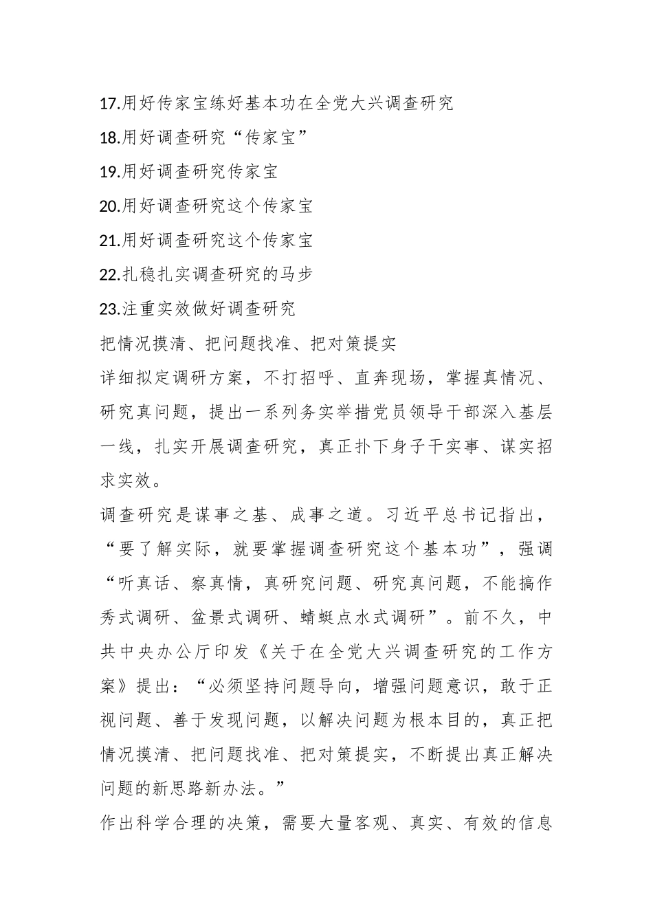 关于大兴调查研究主题研讨材料、心得体会汇编(23篇)1.把情况摸清、把问题找准、把对策提实2.把深入调查研究作为基本功3.别让“照本宣科式汇报”误导调查研究4.不唯上、不唯书、只唯实,才能见“真章”5.党员干部要用好调查研究这个传家宝6.调查研究要奔着问题去7.调查研究要反对“结论导向”8.调查研究要直奔问题去9.调查研究以解决问题为根本目的10.调查研究应少些被动安排11.紧扣“三大导向”狠抓调查研究12.如何做实调查研究这个基本功?13.下更大功夫把调查研究做深做实14.以闭环思维搞调查研究15.以高质量调查研究推动高质量发展16.用好传家宝练好基本功17.用好传家宝练好基本功在全党大兴调查研究18.用好调查研究“传家宝”19.用好调查研究传家宝20.用好调查研究这个传家宝21.用好调查研究这个传家宝22.扎稳扎实调查研究的马步23.注重实效做好调查研究把情况摸清、把问题找准、把对策提实详细拟定调研方案,不打招呼、直奔现场,掌握真情况、研究真问题,提出一系列务实举措党员领导干部深入基层一线,扎实开展调查研究,真正扑下身子干实事、谋实招求实效。调查研究是谋事之基、成事之道。习近平总书记指出,“要了解实际,就要掌握调查研究这个基本功”,强调“听真话、察真情,真研究问题、研究真问题,不能搞作秀式调研、盆景式调研、蜻蜓点水式调研”。前不久,中共中央办公厅印发《关于在全党大兴调查研究的工作方案》提出:“必须坚持问题导向,增强问题意识,敢于正视问题、善于发现问题,以解决问题为根本目的,真正把情况摸清、把问题找准、把对策提实,不断提出真正解决问题的新思路新办法。”作出科学合理的决策,需要大量客观、真实、有效的信息革命年代,为了准确摸清当时中国富农问题和商业情况,毛泽东同志抽出近1个月时间,与农民、手工业者、商人等深入谈心,掌握了大量第一手材料,写出5章、39节的《寻乌调查》。涉浅水者得鱼虾,涉深水者得蛟龙。对现实情况的掌握越是全面、准确,就越能为谋划工作、制定决策提供科学支撑。因此,到基层调查,要一下到底,寻求“源头活水”;既要抓点、搞好典型调查,也要注重调查研究对象的广泛性敢于“钻矛盾窝”了解实情,少看花瓶和盆景,多看看后院和角落。用好交换、比较、反复的方法论,力求准确、全面、深透地了解情况,才能为进一步开展工作打好基础。发现问题、找准问题,是解决问题的前提。如何啃下深度贫困这块硬骨头,打好脱贫攻坚战?从提出“突出重点、加强对特困村和特困户的帮扶”的“精准扶贫”理念,到要求“把扶贫开发、现代农业发展、美丽乡村建设有机结合起来”,再到强调“把‘两不愁三保障’各项措施落实到村、到户、到人”习近平总书记坚持访真贫、问真苦,走遍了全国所有集中连片特困地区,作出一系列重要部署。正是因为找准了导致深度贫困的主要原因,采取有针对性的脱贫攻坚举措,我们如期打赢了脱贫攻坚战,创造了减贫治理的中国样本实践证明,调查研究不仅要全面深入细致地了解实际情况更要善于分析矛盾、发现问题。既要总体分析面上的情况又要深入解剖麻雀,透过现象看本质,提炼出规律性认识。开展调查研究,根本目的是解决问题。不解决问题就是形式主义,对问题听之任之就会误党误国。衡量调查研究搞得好不好,不是看调查研究的规模有多大、时间有多长,也不是光看调研报告写得怎么样,关键要看调查研究的实效,看调研成果的运用,看能不能把问题解决好。就此而言,调研形成的建议必须兼顾需要和可能,提出切实可行的具体措施。拿出符合实际、可行性强的对策,真正实现“调”以务实、“研”以致用,才能让调查研究成果更好破解难题、推动工作。问题是时代的声音。练好调查研究基本功,把事情的真相和全貌调查清楚,把问题的本质和规律把握准确,把解决问题的思路和对策研究透彻,一锤接着一锤敲,一步紧跟一步行,把一个个“问题清单”变为“成果清单”,我们就一定能积小胜为大胜,用实际行动扎实推进中国式现代化。把深入调查研究作为基本功调查研究是我们党的传家宝。没有调查研究就没有发言权没有调查研究就没有决策权。近日,中共中央办公厅印发《关于在全党大兴调查研究的工作...