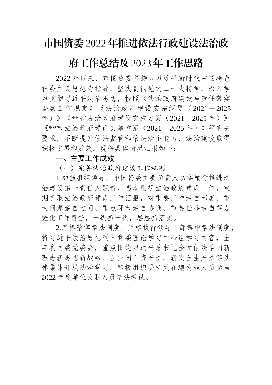 市国资委2022年推进依法行政建设法治政府工作总结及2023年工作思路2022年以来,市国资委坚持以习近平新时代中国特色社会主义思想为指导,坚决贯彻党的二十大精神,深入学习贯彻习近平法治思想,按照《法治政府建设与责任落实督察工作规定》《法治政府建设实施纲要(2021-2025年)》《**省法治政府建设实施方案(2021-2025年)》《**市法治政府建设实施方案(2021-2025年)》等有关要求,不断提升依法监管和依法治企能力,法治建设取得积极进展和成效。现将具体情况汇报如下:一、主要工作成效(一)完善法治政府建设工作机制1.加强组织领导。市国资委主要负责人切实履行推进法治建设第一责任人职责,高度重视法治政府建设工作,定期听取法治政府建设工作汇报,对重要工作亲自部署、重大问题亲自过问、重点环节亲自协调、重要任务亲自督办强化工作责任,一级抓一级,层层抓落实。2.严格落实学法制度。严格执行领导干部集中学法制度,将习近平法治思想列入党委理论学习中心组学习内容,全年利用委党委会,重点围绕习近平总书记全面依法治国新理念新思想新战略、企业国有资产法、新安全生产法等法律集体开展法治学习。积极组织委机关在编公职人员参与2022年度单位公职人员学法考试。3.开展依法治企工作调研。2022年初,为进一步了解市属国企法治建设现状,我委通过调查问卷、深入企业走访等形式对市属国有企业依法治企工作开展调研,根据调研结果撰写了《全面推进依法治企护航**国企高质量发展》调研报告,并据此印发了《**市国资委关于全面推进市属国有企业依法治企工作的指导意见》(*〔2022〕*号),将依法治企工作成效纳入对企业的经营业绩考核,通过考核进一步推进市属国企依法决策、依法经营、依法管理,全面提升市属国企的法治能力和水平。(二)依法全面履行政府职能1.做好规范性文件评估清理工作。一是扎实开展规范性文件清理工作。2022年4月,根据市司法局要求,对《2021年12月31日以前市政府规范性文件评估清理参考目录》中市国资委发布的规范性文件进行评估清理。二是推动委机关公平竞争审查工作落实落细。2022年10月,根据市公审联席办要求,对我委发布的现行有效的政策措施进行自查,均不存在限制竞争的内容。2.切实做好政府信息公开工作。按照市政府统一要求,进一步健全完善市国资委政府信息公开领导机构和工作机构,成立市国资委政府网站和政务新媒体建设与管理工作小组,并落实专人负责政府信息公开工作,利用市国资委网站以及微信公众号等载体作用,持续主动做好政府信息公开工作。今年以来,共上传政府公开信息***余条。3.持续优化提升营商环境。一是严格按照市委、市政府工作部署,着力推进优化营商环境条例相关文件精神落实落地。根据《**市人民政府办公室印发关于落实“六稳”“六保”帮助市场主体纾困解难若干措施的通知》(*〔2022〕*号),为帮助服务业领域困难行业恢复发展,渡过难关,我委于2022年4月出台了《**市国资委关于市属国有企业落实“六稳”“六保”帮助市场主体纾困解难有关事项的通知》(*〔2022〕*号),并制定了《**市属国有企业减免服务业小微企业和个体工商户租金的实施细则》,明确对承租市属国有企业自有经营性房产从事生产经营活动的非国有服务业小微企业和个体工商户,2022年度内可减免3个月租金。截至2022年10月底,共计减免***户小微企业和***户个体工商户房屋租金****万元。二是依法有序推进我市涉案企业合规第三方监督评估机制。共推荐**名市国资系统干部职工参选**市涉案企业合规第三方监督评估机制专业人员,并成功入选,促进我市涉案企业合规建设工作依法顺利开展,实现对企业犯罪的诉源治理,营造良好法治化营商环境。(三)强化行政决策行为规范监督1.推进行政决策科学化、民主化、法治化。严格执行《中共**市国资委委员会印发关于加强对“一把手”和领导班子监督的实施意见的通知》(*〔2021〕*号)《**市国资委关于印发〈**市国资监管提示工作规则〉和〈**市国资监管通报工作规则〉的通知》(*〔2021〕*号)《中共**市国资委委员会关于进一步规范市属国有企业贯彻落实“三重一大”决策制度实施意见》(*〔2020〕*号)等...