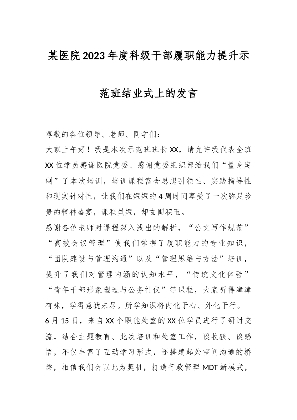 某医院2023年度科级干部履职能力提升示范班结业式上的发言尊敬的各位领导、老师、同学们:大家上午好!我是本次示范班班长XX,请允许我代表全班XX位学员感谢医院党委、感谢党委组织部给我们“量身定制”了本次培训,培训课程富含思想引领性、实践指导性和现实针对性,让我们在短短的4周时间享受了一次弥足珍贵的精神盛宴,课程虽短,却玄圃积玉。感谢各位老师对课程深入浅出的解析,“公文写作规范”“高效会议管理”使我们掌握了履职能力的专业知识,“团队建设与管理沟通”以及“管理思维与方法”培训,提升了我们对管理内涵的认知水平,“传统文化体验”“青年干部形象塑造与公务礼仪”等课程,大家听得津津有味,学得意犹未尽。所学知识将内化于心、外化于行。6月15日,来自XX个职能处室的XX位学员进行了研讨交流,结合主题教育、此次培训和处室工作,谈收获、谈感悟,不仅丰富了互动学习形式,还搭建起处室间沟通的桥梁,相信我们会以此为契机,打造行政管理MDT新模式,助推处室间融合协作新效能。作为科级干部,通过本次学习并结合工作实际,今后的工作中我将努力做到以下三个转变:第一,准确识变,锚定主题教育目标任务。“往深里走、往实里走、往心里走,把自己摆进去、把职责摆进去、把工作摆进去”……党的十八大以来,习近平总书记多次强调坚持“学思用贯通、知信行统一”的理论学习方法,为党员、干部夯实思想根基、强化理论武装提供了重要遵循。识变就是发现问题的过程,就现阶段“群众看病就医不够便利问题专项工作推进”的26条具体措施中,我们逐一解析提升门诊患者就医体验中6条举措,开展沉浸式调研,梳理每项工作流程,努力寻找根因所在。第二,积极应变,聚焦急难愁盼问题难点。为民办实事,解决人民群众急难愁盼问题,是学习贯彻习近平新时代中国特色社会主义思想主题教育的重要内容。以问题为导向解决问题,问计于实践,转变角色、夯实行政服务临床的理念,扎实推动各项工作部署落地生效。第三,主动求变,把握高质量发展主动权。科级干部是医院管理队伍中重要的执行层,求变即为创新,具体实践到工作中我们每个人均摆正位置,理解医院决策,学懂弄通为什么做?服从科室主任安排,敢于创新,勇于探索新的管理模式和方法,想方设法落实怎样做?并且对各项工作实现有计划、有落实、有督导、有改进的闭环管理,实现PDCA循环提升,有效提升工作质量。最后再次感谢各位领导和老师的辛勤付出和悉心指导。我们将在日常工作中学以致用,注重管理效能,以学促干,为患者就医提供更加优质高效的服务,不断把理论学习成果转化为推进医院高质量发展的具体行动和务实成效,为医院“三中心一试点”创建贡献力量,谢谢!