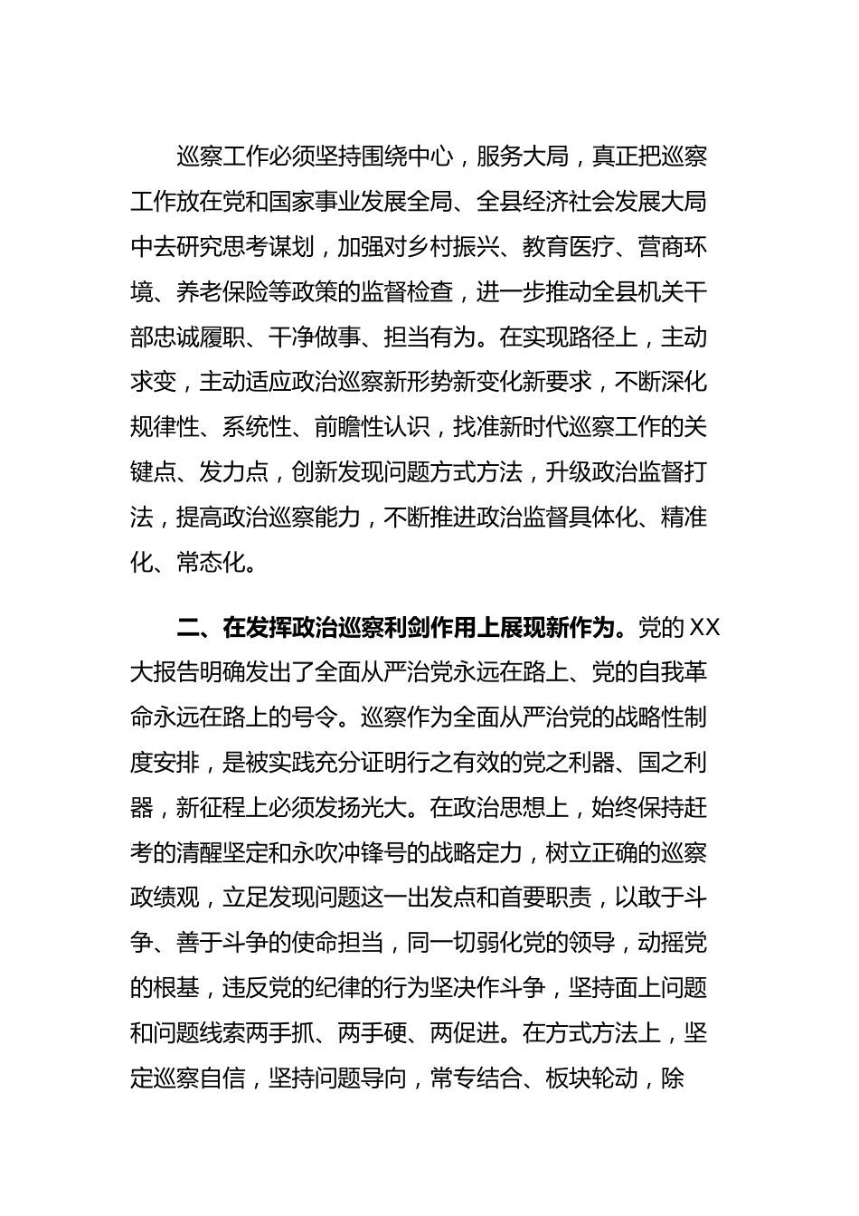 在习近平总书记来川视察重要讲话精神专题学习会上的发言两年来,习近平总书记两次来川视察并发表重要讲话,清晰指明了做好四川工作的总体要求、着力重点、突破路径和目标任务,把脉精准、针对性强,为治蜀兴川事业发展量身擘画了宏伟蓝图。作为中心工作的护航者、县域巡察工作的责任者,我将围绕总书记来川视察重要讲话精神,结合前期学习党的XX大精神和习近平总书记关于巡视巡察工作的重要论述,不断更新工作理念、创新巡察方法、增强斗争本领、规范工作流程,不断提升巡察规范化、法治化、正规化水平,充分发挥政治监督作用,为XX打造重庆都市圈北部副中心重要增长极,建设新时代“XXX”提供坚强政治保证。一、在深化政治巡察实现路径上开辟新赛道。巡察是政治巡察,根本任务是两个维护。推进新时代巡察工作,必须坚持政治巡察定位,自觉围绕中心,服务大局,督促县域各部门、各乡镇党组织和党员干部忠诚履职、担当尽责。在巡察职守上,以四个聚焦为着力点,紧紧围绕党的XX大精神、习近平总书记关于四川工作重要讲话和指示批示精神、省十二次党代会精神等,努力查找政治偏差,强化政治监督,确保党中央决策部署、省委市委工作要求、县委县政府重要安排落实落地。在工作重点上,不谋全局者,不足以谋一域。巡察工作必须坚持围绕中心,服务大局,真正把巡察工作放在党和国家事业发展全局、全县经济社会发展大局中去研究思考谋划,加强对乡村振兴、教育医疗、营商环境、养老保险等政策的监督检查,进一步推动全县机关干部忠诚履职、干净做事、担当有为。在实现路径上,主动求变,主动适应政治巡察新形势新变化新要求,不断深化规律性、系统性、前瞻性认识,找准新时代巡察工作的关键点、发力点,创新发现问题方式方法,升级政治监督打法,提高政治巡察能力,不断推进政治监督具体化、精准化、常态化。二、在发挥政治巡察利剑作用上展现新作为。党的XX大报告明确发出了全面从严治党永远在路上、党的自我革命永远在路上的号令。巡察作为全面从严治党的战略性制度安排,是被实践充分证明行之有效的党之利器、国之利器,新征程上必须发扬光大。在政治思想上,始终保持赶考的清醒坚定和永吹冲锋号的战略定力,树立正确的巡察政绩观,立足发现问题这一出发点和首要职责,以敢于斗争、善于斗争的使命担当,同一切弱化党的领导,动摇党的根基,违反党的纪律的行为坚决作斗争,坚持面上问题和问题线索两手抓、两手硬、两促进。在方式方法上,坚定巡察自信,坚持问题导向,常专结合、板块轮动,除《中国共产党巡视工作条例》规定的“12+N”种方法外,充分发挥“N”的创造空间,(借助大数据的手段来辅助巡察,利用大数据技术系统分析发现民政资金发放不到位、停发不及时等问题;利用网络查询资源帮助我们跳出被巡察单位发现相关问题线索的媒介)。在责任落实上,坚持巡视工作方针,压实被巡察单位主体责任,建立从巡察反馈、量化考核评估再到巡察“回头看”全链条、全周期的巡察管理体系,持续压实整改责任。同时,对内建立巡察工作考评体系,倒逼各巡察组发现问题、规范巡察程序。三、在推动深化政治监督格局上提升新效能。深化拓展巡察综合监督作用,推动各类监督贯通协调、优势互补,一体发力,聚力攻坚。在巡察办与巡察组的协作互助上,要发挥巡察办在巡察机构的中枢系统作用,将一线调研、巡中指导督导等掌握的一手资料一手信息转化为解决问题的“金钥匙”;发挥巡察办统筹协调作用,帮助巡察组解决巡察中的难题,以组办合力共同推进巡察工作高质量发展。在巡察机构与其他部门的协作互助上,树立整体作战、集体巡察的工作理念,加强巡察监督与其他监督的贯通融合,建立系统集成、协同高效的监督体系。用好用活县委巡察机构与县纪委监委、县委组织部、县委政法委等9单位建立的协作配合制度。探索巡察与人大、民主、群众、舆论等监督协调互补,最大限度凝聚监督合力。在巡察质效综合评估运用上,完善现有量化考核质效评估体系,综合运用人大、政协监督评估县直部门履职成效,邀请审计、财政等县级相关专业部门加强对被巡察单位的巡察整改质效评估,做到多角度、全方位进行评估,广纳评估建...