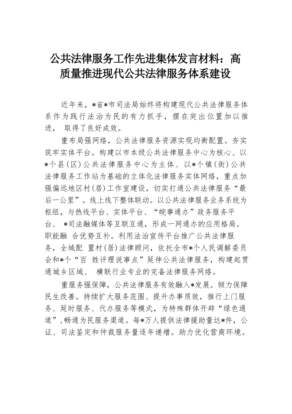 公共法律服务工作先进集体发言材料:高质量推进现代公共法律服务体系建设近年来,*省*市司法局始终将构建现代公共法律服务体系作为践行法治为民的有力抓手,摆在突出位置加以推进,取得了良好成效。重布局强网络,公共法律服务资源实现均衡配置。夯实筑牢实体平台。构建以市本级公共法律服务中心为核心、以*个县(区)公共法律服务中心为主体、以*个镇(街)公共法律服务工作站为基础的立体化法律服务实体网络,重点加强偏远地区村(居)工作室建设,切实打通公共法律服务“最后一公里”。线上线下整体联动。以公共法律服务业务系统为枢纽,与热线平台、实体平台、“皖事通办”政务服务平台、*司法融媒体等互联互通,形成一网通办的应用格局。职能融合优势互补。利用法治宣传平台推广公共法律服务,全域配置村(居)法律顾问,依托全市*个人民调解委员会和*个“百姓评理说事点”延伸公共法律服务,构建起贯通城乡区域、横联行业专业的完备法律服务网络。重服务强保障,公共法律服务有效融入*发展。倾力保障民生改善。持续扩大服务范围、提升办事质效,推行上门服务、延时服务、代办服务等模式,为特殊群体开辟“绿色通道”,畅通为民服务渠道。每*万人提供法律援助量达*件,公证、司法鉴定和仲裁服务量逐年递增。助力优化营商环境。成立律师维权团、知识产权仲裁调解中心和公证服务中心,指导法律服务行业深度参与知识产权保护、刑事合规指导、行政争议化解等工作。建立涉企法治问题摸排机制,开展公共法律服务“大走访、解难题、优供给”活动,得到民营企业一致好评。主动对接区域协作。分别与*市、*经济区*地市签订框架协议,建立跨域公共法律服务协作机制,组建“*公证行业互助合作协调小组”,*仲裁委加入*经济区仲裁机构联盟,*公共法律服务区域影响力不断扩大。重机制强基础,公共法律服务内生动力持续激发。优化细化制度体系。将公共法律服务体系建设纳入*“十四五”规划和乡村振兴等重要战略,出台*市公共法律服务体系建设三年规划,分领域制定具体方案,为公共法律服务高质量发展提供制度保障。抓紧抓实执业监管。扛牢监督管理主体责任,制度化实施专项检查,重点加强事中事后监管,畅通群众投诉举报渠道,对侵害群众利益等问题依法实行快查严处,持续加压规范全市法律服务行业。建优建强法治队伍。全市律师、公证员、仲裁员等队伍规模连续多年稳定增长,常态化开展业务培训和技能竞赛,持续提升队伍履职能力。将公共法律服务工作经费纳入同级财政预算,建立经费动态增长机制,经费保障有效满足发展需求。