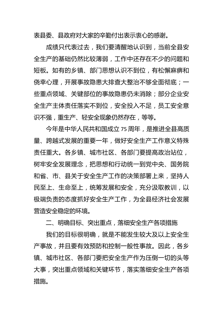 在2024年县安委会、减灾委全体(扩大)会暨全国“两会”期间安全防范工作布置会上的讲话同志们:刚才,我们集中观看了警示教育片,传达学习了习近平总书记关于安全生产工作的重要指示、批示精神以及上级有关文件、会议精神;各专委会书面汇报了2023年度工作总结暨2024年工作计划;分管同志宣读了2023年先进集体和先进个人的表彰决定,在此向获得先进的单位和个人表示祝贺,希望大家再接再厉、再创佳绩;**同志对2023年安全生产工作进行了总结、对2024年工作进行了部署,我完全赞同,请大家认真学习领会,全力抓好贯彻落实。下面,我就做好当前安全生产工作再强调三点意见。一、肯定成绩、正视问题,牢固树立安全发展理念2023年,在县委的坚强领导下,全县上下严格落实安全生产责任制,打好安全生产专项整治三年行动“收官战”,抓实应急管理、安全生产、防汛抗旱、森林防灭火、防灾减灾等工作,全年未发生较大以上安全生产事故,全县安全形势保持总体平稳。来之不易、值得肯定,这些成绩的取得,是大家共同努力、团结奋斗的结果,受县委书记委托,我代表县委、县政府对大家的辛勤付出表示衷心的感谢。成绩只代表过去,我们要清醒地认识到,当前全县安全生产的基础仍然比较薄弱,工作中还存在不少的问题和短板。如有的乡镇、部门思想认识不到位,有松懈麻痹和侥幸心理,开展事故隐患大排查大整治不够全面彻底;一些重点领域、关键部位的事故隐患仍未消除;部分企业安全生产主体责任落实不到位,安全投入不足,员工安全意识不强,重生产、轻安全现象仍然存在,等等。今年是中华人民共和国成立75周年,是推进全县高质量、跨越式发展的重要一年,做好安全生产工作意义特殊责任重大。各乡镇、城市社区、各部门要提高政治站位,树牢安全发展理念,把思想和行动统一到党中央、国务院和省、市、县关于安全生产工作的决策部署上来,坚持人民至上、生命至上,统筹发展和安全,充分汲取教训,以极端负责的态度抓好安全生产工作,为全县经济社会发展营造安全稳定的环境。二、明确目标、突出重点,落细安全生产各项措施我们的目标很明确,就是不能发生较大及以上安全生产事故,并且要有效预防和控制一般性事故。因此,各乡镇、城市社区、各部门要把安全生产作为压倒一切的头等大事,突出重点领域和关键环节,落实落细安全生产各项措施。一是要强化分析研判。只有精准的研判才能科学制定出更有效的防范措施。当前,正处于企业生产活跃期、项目建设加速期、交通运输繁忙期、人员流动高峰期;安全生产“脆弱期、爬坡期、过坎期”的阶段性特征没有变,自然灾害“灾种多、灾害频、灾损重”的区域性特点没有变,应急能力“起步晚、基础弱、底子薄”的总体性状况没有变,安全生产面临严峻形势。各乡镇、城市社区、各部门要结合本辖区、本行业实际,针对企业全面复工复产、项目建设快速推进的工作特点,深入分析研判当前安全生产风险,真正把各类风险因素搞清楚,把各项安全防范工作抓精准、抓主动、抓到位。二是要强化排查整治。隐患不排查不化解就是事故。我多次提到海恩法则(每一起严重事故的背后,必然有29次轻微事故、300起未遂先兆以及1000起事故隐患),目的就是强调每一起事故的发生都是由很多的隐患积累造成的。县安委办要牵头,组织10个专委会以及各乡镇、城市社区,集中力量深入危化品、非煤矿山、消防、道路交通、自建房、城镇燃气、建筑施工、食品药品等重点领域、重点行业开展拉网式、地毯式的安全隐患大排查,做到不留盲区、不留死角。针对发现的安全隐患,要建立问题清单,进行台账式管理、清单式销号,严格按照责任、措施、资金、时限和预案“五落实”的要求,督促闭环整改到位。能够马上整改的,必须立即整改;一时整改不了又无法保证安全的,要派专人盯紧看牢并做好预防事故的应急措施;整改无望的,要坚决停产停工直至取缔关闭,做到不安全不生产。关于危化品和道路交通领域我再点一下。危化品领域,我们既要发展,更要安全,请县应急管理局牵头,相关部门配合,针对危化品生产、经营、使用、运输和储存各个环节开展隐患排查整治,园区内的企业要一个一个过,同时也要加快生态基础...