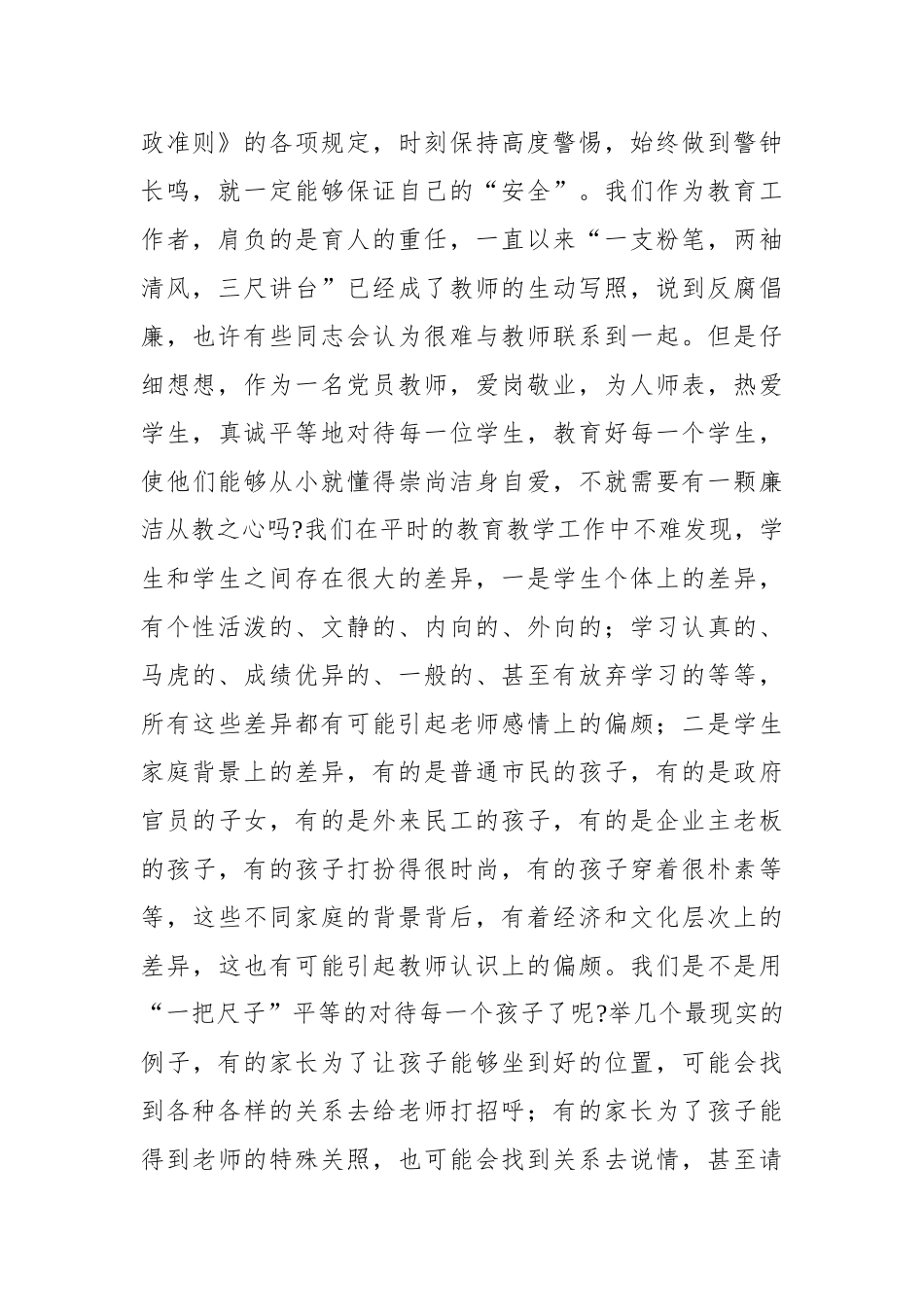 党风廉政党课讲稿汇编(19篇)目录【篇一】党风廉政党课讲稿...................................1【篇二】党风廉政党课讲稿.................................10【篇三】党风廉政党课讲稿.................................15【篇四】党风廉政党课讲稿.................................24【篇五】党风廉政党课讲稿.................................29【篇六】党风廉政党课讲稿.................................42【篇七】党风廉政党课讲稿.................................50【篇八】党风廉政党课讲稿.................................59【篇九】党风廉政党课讲稿.................................65【篇十】党风廉政党课讲稿.................................70【篇十一】党风廉政党课讲稿..............................75【篇十二】党风廉政党课讲稿..............................92【篇十三】党风廉政党课讲稿..............................97【篇十四】党风廉政党课讲稿............................107【篇十五】党风廉政党课讲稿............................108【篇十六】党风廉政党课讲稿............................118【篇十七】党风廉政党课讲稿............................120【篇十八】党风廉政党课讲稿............................126【篇十九】党风廉政党课讲稿............................135【篇一】党风廉政党课讲稿同志们:为贯彻落实《中国共产党党员领导干部廉洁从政若干准则》,切实加强对党员干部的反腐倡廉教育,提高新形势下反腐倡廉教育的针对性和实效性,按照我校党风党纪学习宣传教育活动的安排,对党员教师进行以“增强制度意识,争做执行表率”为主题的廉政教育,切实提高党员教师的思想政治素质,增强防腐拒变的能力。今天,我讲的题目是《贯彻落实廉政准则,争当廉洁从教表率》。随着新时期党建工作特别是反腐倡廉建设的不断深入,党中央审时度势,及时修订了《中国共产党党员领导干部廉洁从政若干准则》。《廉政准则》是规范党员领导干部的重要基础性法规,其中的8个方面“禁止”和52个“不准”,涵盖了行政权力行使中极易滋生腐败的各个领域,包括党员领导干部私自从事营利性活动的问题、违规干预和插手市场经济活动问题、浪费挥霍等干部作风问题,可以说,《准则》明确了哪里是“不能入”的禁区,哪些是不能触的“高压线”。从某种意义上说,《廉政准则》的发布和实施,在对党员领导干部违纪行为惩处的同时,更重要的还是警示、教育和保护,最大程度地使党员领导干部少违纪违法甚至是不违纪违法。只要我们自觉遵守《廉政准则》的各项规定,时刻保持高度警惕,始终做到警钟长鸣,就一定能够保证自己的“安全”。我们作为教育工作者,肩负的是育人的重任,一直以来“一支粉笔,两袖清风,三尺讲台”已经成了教师的生动写照,说到反腐倡廉,也许有些同志会认为很难与教师联系到一起。但是仔细想想,作为一名党员教师,爱岗敬业,为人师表,热爱学生,真诚平等地对待每一位学生,教育好每一个学生,使他们能够从小就懂得崇尚洁身自爱,不就需要有一颗廉洁从教之心吗?我们在平时的教育教学工作中不难发现,学生和学生之间存在很大的差异,一是学生个体上的差异,有个性活泼的、文静的、内向的、外向的;学习认真的、马虎的、成绩优异的、一般的、甚至有放弃学习的等等,所有这些差异都有可能引起老师感情上的偏颇;二是学生家庭背景上的差异,有的是普通市民的孩子,有的是政府官员的子女,有的是外来民工的孩子,有的是企业主老板的孩子,有的孩子打扮得很时尚,有的孩子穿着很朴素等等,这些不同家庭的背景背后,有着经济和文化层次上的差异,这也有可能引起教师认识上的偏颇。我们是不是用“一把尺子”平等的对待每一个孩子了呢?举几个最现实的例子,有的家长为了让孩子能够坐到好的位置,可能会找到各种各样的关系去给老师打招呼;有的家长为了孩子能得到老师的特殊关照,也可能会找到关系去说情,甚至请客送礼;有的老师因为接受了家长的吃请,不得不去按家长的意思办;有的老师为了点蝇头小利,向学生推销资料摊派辅导用书;有...