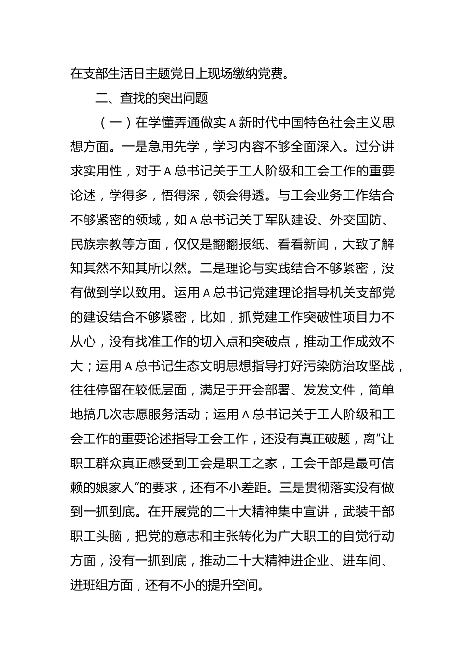 关于在2023年上半年民主生活会个人对照检查材料根据《关于开好2023年上半年党员领导干部民主生活会的通知》要求,我积极参加×××党组理论学习中心组专题学习研讨会,聚焦省委巡视边巡边改问题整改,深入学习A新时代中国特色社会主义思想和党的二十大精神等,学习了原文原著,进行了研讨交流,提高了思想认识;深入征求意见,开展谈心谈话,广泛征求意见建议,对照党员标准深刻剖析了自身存在的问题。联系自己的思想和工作实际,进行了对照检查,认真剖析思想根源,明确了努力方向和整改措施。一、边巡边改问题整改情况深入贯彻落实巡视组《关于做好边巡边改工作的通知》精神,对照提出的5个方面的问题,立足工作职责,立即行动,举一反三,深刻查摆,坚决整改到位。针对理论学习中心组学习,积极参与,认真学习,深入研讨交流,提升自我。针对严肃和规范党的组织生活,作为市总工会机关支部书记,按照党的组织生活规范流程,严格落实组织生活。针对中层干部轮岗,及时按程序组织搞好轮岗工作。针对开展警示教育,积极组织党员干部到党群服务中心参加学习,个人也做到认真学、用心学。针对党费收缴管理,严格按照规定要求在支部生活日主题党日上现场缴纳党费。二、查找的突出问题(一)在学懂弄通做实A新时代中国特色社会主义思想方面。一是急用先学,学习内容不够全面深入。过分讲求实用性,对于A总书记关于工人阶级和工会工作的重要论述,学得多,悟得深,领会得透。与工会业务工作结合不够紧密的领域,如A总书记关于军队建设、外交国防、民族宗教等方面,仅仅是翻翻报纸、看看新闻,大致了解知其然不知其所以然。二是理论与实践结合不够紧密,没有做到学以致用。运用A总书记党建理论指导机关支部党的建设结合不够紧密,比如,抓党建工作突破性项目力不从心,没有找准工作的切入点和突破点,推动工作成效不大;运用A总书记生态文明思想指导打好污染防治攻坚战,往往停留在较低层面,满足于开会部署、发发文件,简单地搞几次志愿服务活动;运用A总书记关于工人阶级和工会工作的重要论述指导工会工作,还没有真正破题,离“让职工群众真正感受到工会是职工之家,工会干部是最可信赖的娘家人”的要求,还有不小差距。三是贯彻落实没有做到一抓到底。在开展党的二十大精神集中宣讲,武装干部职工头脑,把党的意志和主张转化为广大职工的自觉行动方面,没有一抓到底,推动二十大精神进企业、进车间、进班组方面,还有不小的提升空间。(二)在严格落实意识形态责任制方面。一是在抓意识形态工作上,往往注重在重大节日、重大活动的关键节点上真抓实干,平时抓得不紧、抓得不严;二是抓意识形态对象多为机关党员干部,面向全市职工的意识形态活动偏少。三是开展意识形态活动形式单一,会议形式偏多。(三)在严格党的组织生活制度方面。一是联系党员思想、工作和生活实际不紧,针对性不强。没有用心去谋划好每一次难得的组织生活,随意性和主观性的现象较为普遍。组织生活联系党员主观世界,解决思想问题不够。二是把组织生活作为一种任务,尤其与业务工作冲突时两者结合不够。三是参加组织生活被动应付,缺乏自觉性。(四)在落实全面从严治党“一岗双责”方面。一是真抓实干作风有所消减。抓工作求实效的韧劲不足,有时存在“重部署、轻落实,重形式、轻实效,重宏观、轻微观”的现象,比如有些工作安排给相关业务部室后就不闻不问。一是调查研究不够深入,推动工作缺少管用实招。没有挤出足够时间到基层调研,身上还没沾上“泥土味”,手头缺乏开展工作的第一手资料。如,中央鼓励非公企业发展的若干措施出台前后,非公企业有哪些需求?还需在哪些方面加大措施等?再如,我市众多企业面临“用工难”“技工荒”问题,有哪些破解措施?二是工作满足于以往经验,用创新引领工作办法不多。开展工作习惯于从以往经验中“找答案”,用创新思维谋划工作不够积极主动。如,在信访维稳工作上,没有积极主动地排查不稳定因素,为领导决策提供有价值的参考依据。再如,组织职工开展文化体育活动,不管职工喜欢不喜欢,办来办去,总是那么几样。三是落实工作抓细、抓实、抓长不够,一些工作出现...