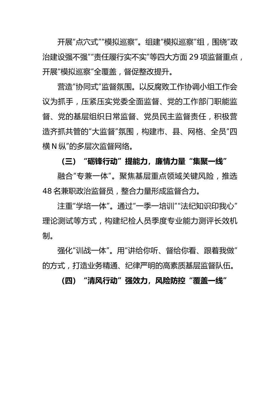 XX国企“五力齐下”打造基层廉政建设工作体系工作报告中国XX集团XX有限公司XX分公司(简称:XXXX)以监督执纪为抓手,创新开展“护航行动”“筑网行动”“砺锋行动”“清风行动”“赋能行动”,“五力齐下”探索实践“一线监督法”,努力打造“警示防控有强度有深度,监督执纪有力度有温度”的基层党风廉政建设工作体系,为公司“小而美”发展愿景提供坚强政治保障。一、“五力齐下”打通监督“最后一公里”(一)“护航行动”夯定力,品牌理念“传递一线”塑造纪检品牌形象。坚持在管理上从严、在监督上从严、在查处上从严,在教育上从暖、在提醒上从暖、在谈话中从暖,使纪检工作既“有力度”又“有温度”。探索研判政治生态。明确“责任履行”“政治生活”等五大方面政治生态评估维度,运用“一调二谈三看四评”工作法,在调研评估基础上形成政治生态分析机制。创新生态构建“三步法”。巩固良好政治生态“三步法”,从根源上解决基层问题、惠及员工,为持续构建和巩固风清气正的政治生态奠定坚实基础。(二)“筑网行动”聚合力,监督探头“延伸一线”做深做透“项目式”政治监督。聚焦重点专项监督项目,落实好“三个一”监督规定动作,推动主责单位压实责任。开展“点穴式”“模拟巡察”。组建“模拟巡察”组,围绕“政治建设强不强”“责任履行实不实”等四大方面29项监督重点,开展“模拟巡察”全覆盖,督促整改提升。营造“协同式”监督氛围。以反腐败工作协调小组工作会议为抓手,压紧压实党委全面监督、党的工作部门职能监督、党的基层组织日常监督、党员民主监督责任,积极营造齐抓共管的“大监督”氛围,构建市、县、网格、全员“四横N纵”的多层次监督网络。(三)“砺锋行动”提能力,廉情力量“集聚一线”融合“专兼一体”。聚焦基层重点领域关键风险,推选48名兼职政治监督员,整合力量形成监督合力。注重“学培一体”。通过“一季一培训”“法纪知识印我心”理论测试等方式,构建纪检人员季度专业能力测评长效机制。强化“训战一体”。用“讲给你听、督给你看、跟着我做”的方式,打造业务精通、纪律严明的高素质基层监督队伍。(四)“清风行动”强效力,风险防控“覆盖一线”开展“三下三上”专题调研。优化基层联系点制度,坚持带着热心下去,把基层的呼声反馈上来;带着职责下去,把基层的隐患查摆出来;带着虚心下去,把基层的经验传递上来,督促市县两级纪检干部做实“约谈入格”“警示入格”“监督入格”三个入格全覆盖。开展“五项维度”风险排查。聚焦“用人双向选择权”“奖金二次分配权”等五大方面授权内容,重点对基层网格26项权力、责任清单,确保网格“微权力”规范运行。营造“四微四常”廉洁氛围。以“微巡讲”“微学堂”“微关怀”“微阵地”的“四微四常”活动为主线,开展系列纪律教育和警示教育,用“小载体”做实“大廉洁”。(五)“赋能行动”激活力,支撑服务“保障一线”制度为“先”,全面压实“两个责任”。制定下发《全面从严治党主体责任清单》及工作任务,做深做实监督责任。考核为“重”,科学优化考评体系。完善纪律检查工作考评细则,将考评结果应用到党支部纪检委员年度绩效考核实行末位排名和约谈制度,持续强化督责考责力度。提质为“要”,建立支撑保障机制。“一表”厘清任务,制定印发纪律检查工作要点,明确市县两级四大方面40项重点工作任务清单,促进各党支部纪律检查工作落到实处。“一册”强化指导,编制XXXX党支部纪检工作手册,提升基层纪检工作规范化、制度化、标准化水平。“一平台”提质增效,优化纪检工作流平台五个模块11项纪检工作流程,提高基层纪检工作的质量和效率。二、“三全”大监督格局初步构建(一)“全组织”覆盖,基层监督“系统性”逐步显现XXXX抽调人员并组建“模拟巡察”“四风八规”等专项监督组10余个。厘清市县两级四大方面40项监督重点工作任务清单,“项目式”“点穴式”“协同式”推动基层监督,市、县、网格多层次监督网络逐步构建。(二)“全场景”渗透,基层监督“精准性”明显增强制定覆盖“党支部规范化建设”“选人用人”等“全场景”市县两级政治监督工作手册指引15份,优化...