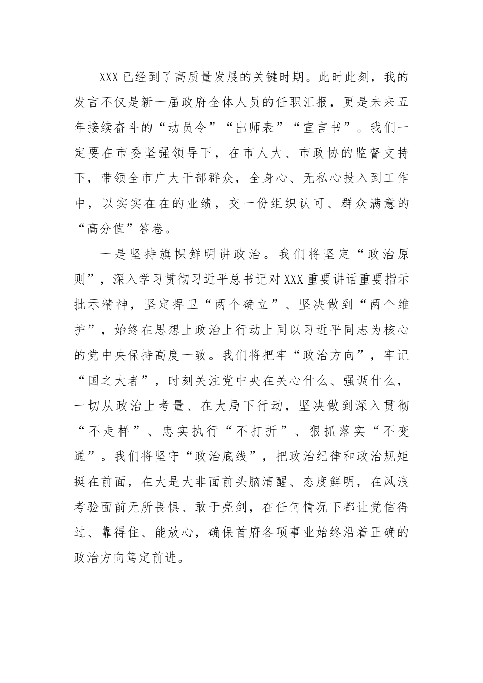 在当选市长后的表态发言各位代表、同志们:刚才,大会选举产生了新一届市政府领导班子,选举我担任市长,我们深知,这是全体代表对我们的高度信任,更是全市人民对我们的深情重托。在这个庄严的时刻,我代表新一届市政府班子,向全体代表和全市人民表示衷心的感谢和崇高的敬意!一年前,我接过市长的“接力棒”,在市委的坚强领导下,沿着历届政府班子励精图治的足迹,薪火相传、接续奋斗,无论是疫情防控的日夜奋战、还是推进项目的全员出击,无论是城市建设管理中快速路的通车、“断头路”的打通、老旧小区的改造,还是民生保障领域大气污染的治理、教育医疗“软硬件”的完善、房地产遗留问题的解决,点点滴滴、时时处处,都展示了全市上下“走在前、作表率”的奋斗激情、都体现了广大干部奋发有为的拼搏精神,时刻激励着我不忘初心、继续前行。我为自己能够继续融入到这片充满生机活力、前景美好光明的热土,与勇于担当、甘于奉献的广大首府干部,共同为345万全市人民服务,感到无比荣幸和自豪。XXX已经到了高质量发展的关键时期。此时此刻,我的发言不仅是新一届政府全体人员的任职汇报,更是未来五年接续奋斗的“动员令”“出师表”“宣言书”。我们一定要在市委坚强领导下,在市人大、市政协的监督支持下,带领全市广大干部群众,全身心、无私心投入到工作中,以实实在在的业绩,交一份组织认可、群众满意的“高分值”答卷。一是坚持旗帜鲜明讲政治。我们将坚定“政治原则”,深入学习贯彻习近平总书记对XXX重要讲话重要指示批示精神,坚定捍卫“两个确立”、坚决做到“两个维护”,始终在思想上政治上行动上同以习近平同志为核心的党中央保持高度一致。我们将把牢“政治方向”,牢记“国之大者”,时刻关注党中央在关心什么、强调什么,一切从政治上考量、在大局下行动,坚决做到深入贯彻“不走样”、忠实执行“不打折”、狠抓落实“不变通”。我们将坚守“政治底线”,把政治纪律和政治规矩挺在前面,在大是大非面前头脑清醒、态度鲜明,在风浪考验面前无所畏惧、敢于亮剑,在任何情况下都让党信得过、靠得住、能放心,确保首府各项事业始终沿着正确的政治方向笃定前进。二是坚持一张蓝图绘到底。我们将按照党中央为我们确定的战略定位和行动纲领,把“生态优先、绿色发展”作为开展一切工作的鲜明导向;紧紧抓住自治区党委、政府“支持XXX实施强首府工程”的重大机遇,把“率先实现高质量发展”作为坚定目标;严格落实市委“争创三个城市、打造四个区域中心、推动融入四大经济圈、建设五宜城市、培育六大产业集群”目标要求,把政府5年目标全部具化、把1年任务全部量化,把扩大投资作为高质量发展的“第一动力”,把重大项目作为“第一抓手”,把招商引资作为“第一选择”,把培育市场作为“第一前提”,把优化环境作为“第一基础”,全力增强“进”的韧劲、全力夯实“稳”的基础、不断创造“好”的业绩,努力在“强首府”的大局中开拓创新、久久为功。三是坚持务实担当负责任。我们要继续发扬“无私忘我”的工作精神,紧紧盯住“首府”和“区域中心”这2个定位,用“跳起摸高”的姿态谋发展,用“进位赶超”的决心抓落实,“功成不必在我、功成必定有我”;我们要继续发扬“一抓到底”的奋斗精神,引进项目从“签约”盯到“投产”,服务企业从“生产”盯到“流通”,培育产业从“链条”盯到“集群”,保障民生从“需求”盯到“享受”,只要做就一定要见效果,“干就干成、干就干好”;我们要继续发扬“攻坚克难”的实干精神,该担的责必须担、该破的题必须破,不怕难、不畏难、敢攻难,以抓铁有痕的“执行力”和舍我其谁的“精气神”,持续推动一批保障发展的大事要事,攻克一批阻碍前行的急事难事,让首府各项事业天天都有新进展、月月都有新突破、年年都有新变化。四是坚持一心为民谋福祉。我们将坚持“投入向民生倾斜”。始终保持民生领域投入力度只增不减,把更多的时间精力投入到民生上,更多的资源力量保障到民生上,用政府的“负重前行”换取群众的“岁月静好”。我们将坚持“需求向群众问计”。一切工作的出发点和落脚点都要放在群众身上,群众“埋怨什么”就去解决什...