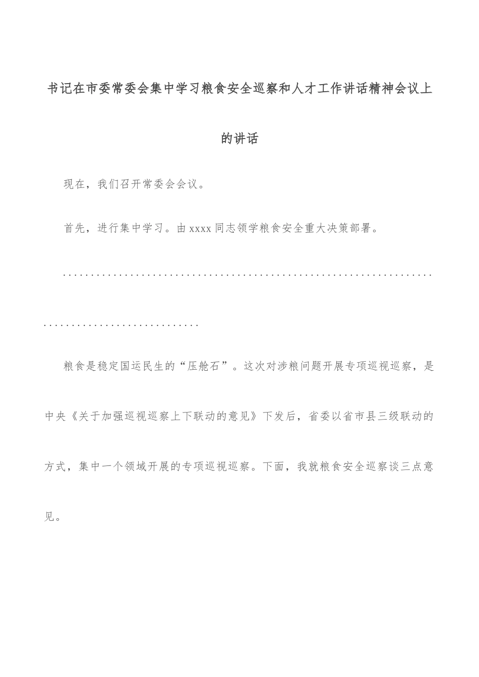 书记在市委常委会集中学习粮食安全巡察和人才工作讲话精神会议上的讲话现在,我们召开常委会会议。首先,进行集中学习。由xxxx同志领学粮食安全重大决策部署。..............................................................................................粮食是稳定国运民生的“压舱石”。这次对涉粮问题开展专项巡视巡察,是中央《关于加强巡视巡察上下联动的意见》下发后,省委以省市县三级联动的方式,集中一个领域开展的专项巡视巡察。下面,我就粮食安全巡察谈三点意见。一是深刻认识粮食问题专项巡察的重大意义。习近平总书记指出,“悠悠万事,吃饭为大”“民为国基,谷为民命”“十几亿人口要吃饭,这是我国最大的国情”。十八大以来,以习近平同志为核心的党中央始终把粮食安全作为治国理政的头等大事,特别是去年疫情发生以来,中央更是把“保粮食能源安全”作为“六保”任务之一,放在更加突出的位置。围绕粮食购销领域开展专项巡视,是贯彻落实习近平总书记重要讲话和重要指示批示精神的实际行动,是净化粮食购销领域政治生态的现实需要,是推动健全粮食监管长效机制的必然要求。各级各部门要深入学习贯彻习近平总书记关于国家粮食安全的重要论述,坚决扛起维护粮食安全的政治责任,认真落实新形势下国家粮食安全战略,以高度的政治自觉、思想自觉和行动自觉,坚决抓好粮食安全各项任务落实,为保障国家粮食安全作出xxxx贡献。二是全力做好专项巡察的各项准备。开展涉粮问题专项巡视巡察,是对粮食工作的一次阶段性全面检阅,昨天,省委第十巡视组召开了对徐州市开展涉粮问题专项巡视巡察工作动员会议,主要目的就是及时发现影响粮食安全的腐败问题、排除粮食领域的风险隐患,督促被巡视巡察党组织切实扛起粮食安全政治责任。各级各部门要从讲政治、讲规矩、讲纪律的高度,坚决服从巡察组的调度安排,准确把握涉粮问题专项巡视巡察监督重点,全面准确提供相关工作资料,为巡察组了解真实情况、全面开展工作,创造良好环境、提供便利条件。要强化标本兼治,把涉粮问题专项巡察作为推动改革、促进发展的一次重要契机,压实工作责任,强化工作举措,坚持举一反三、由点及面,统筹推进问题整改与长效机制建立,切实筑牢全县粮食安全防线。三是抓实事关粮食安全的各项举措。粮食安全是一项需要久久为功的民生工程。要稳定粮食产能,加强水利设施和农业节水重大工程建设,加大高标准农田建设力度,全面落实粮食生产政策举措。要提升调控能力,落实好粮食补贴政策,加强粮食仓储设施建设及升级改造,推动构建统一高效的粮食储备体系,确保全县18家粮食应急供应网点、6家应急加工企业安全运转、兜牢底线。县粮安考核办要切实履行好牵头职责,认真梳理粮食安全责任制考核中存在的短板和问题,协调各考核成员单位做好衔接配合,加强督查督办,增强工作的主动性、有效性,力争今年粮安考核取得更好成绩,为实现“两个争做”,夯实高质量发展基础提供坚实保障。下面,由xxxx同志领学《全省海外引才工作推进会讲话提纲》。..............................................................................................习近平总书记强调要“聚天下英才而用之”。去年我们人才工作考核是第xx位,今年我们坚持问题导向,把人才工作摆在突出位置,做了大量卓有成效的工作,但海外人才作为市对县考核的重要部分,我县仅有xx名申报至省,横向对比xxxx40多名,差距很大。下面,我就海外引才工作谈三点意见。一是倍加珍惜人才“回流”的机遇。近期,中央时隔11年再次召开人才工作会议,习近平总书记在中央人才工作会议上发表重要讲话,阐明了人才对于党和国家事业发展的基础性、战略性和决定性作用,为做好新时代人才工作指明了前进方向,提供了根本遵循。新冠肺炎疫情发生后,全球人才流动格局发生了一些有利于我国“聚才”的变化,全球科技型小微企业和初创企业成为裁员重灾区,我国向心力、吸引力不断提高,海外人才“回流”趋势显现,海外高端人才回国意愿强烈。区域之间的竞争,归根结底是人才竞争。必须牢牢把握住海外人才“回流”机遇,搭建充分施展才华的舞台,健全相关...