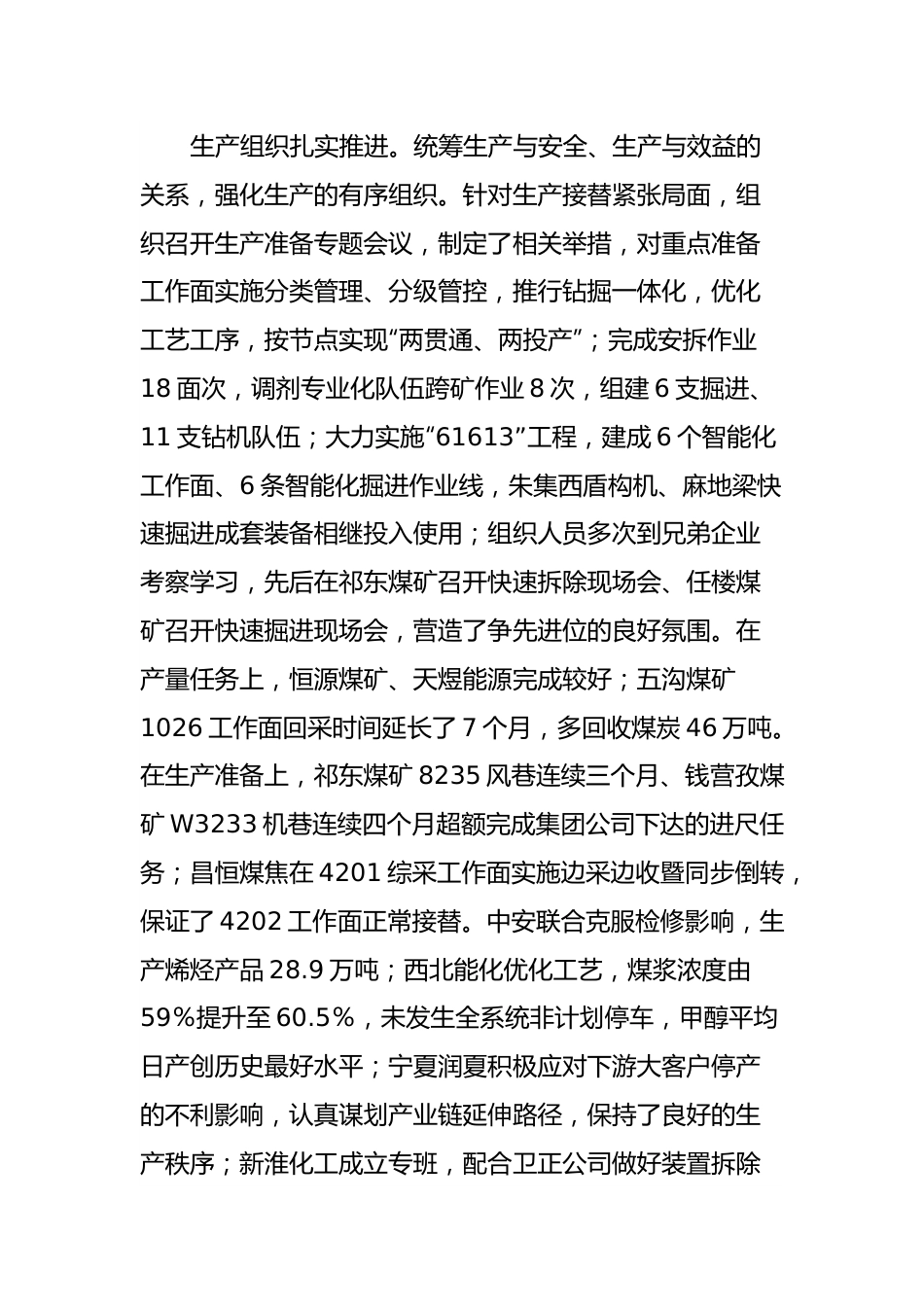 在集团公司下半年经营分析会上的讲话一、客观看待上半年成绩,增强工作底气1-6月份,面对疫情防控压力和煤炭市场高位运行利好形势,集团公司上下认真落实上级重大决策部署,保持定力、勇担使命,扎实推进年度各项任务安排,企业稳中向好的态势更加显现。回顾上半年工作,我们严把重点要项,狠抓任务落实,企业运营效果基本达到预期。主要体现在:一是安全形势总体平稳。切实把安全工作摆在突出位置。持续学习习近平总书记关于安全生产的重要论述,宣传贯彻落实安全工作“15条”硬措施,不间断开展“强严保”“学抓强”“工人违章、干部反省”“安全生产月”等系列活动,深入推进安全生产大排查,全面实施安全驻矿包保督导,组织开展安全应急培训、演练共203场次,切实做到从严管理。按照治理体系制度化、现代化的要求,组织对安全、生产、技术、重大灾害治理等安全管理制度进行全面梳理,制定修订相关制度66项,不断规范月度安全工作例会、总工程师例会、突敏信息“日分析”会等机制,管控重大风险302项、突敏信息603项。针对疫情防控变化,创新安全检查方式,实施“远程+”视频安全生产标准化管理体系检查,实行“回放式”检查以及关键工序的核查验证,检查更贴近现场、更注重过程、更直观反映问题,创新做法也得到国家矿山安全监察局充分认可。二是生产组织扎实推进。统筹生产与安全、生产与效益的关系,强化生产的有序组织。针对生产接替紧张局面,组织召开生产准备专题会议,制定了相关举措,对重点准备工作面实施分类管理、分级管控,推行钻掘一体化,优化工艺工序,按节点实现“两贯通、两投产”;完成安拆作业18面次,调剂专业化队伍跨矿作业8次,组建6支掘进、11支钻机队伍;大力实施“61613”工程,建成6个智能化工作面、6条智能化掘进作业线,朱集西盾构机、麻地梁快速掘进成套装备相继投入使用;组织人员多次到兄弟企业考察学习,先后在祁东煤矿召开快速拆除现场会、任楼煤矿召开快速掘进现场会,营造了争先进位的良好氛围。在产量任务上,恒源煤矿、天煜能源完成较好;五沟煤矿1026工作面回采时间延长了7个月,多回收煤炭46万吨。在生产准备上,祁东煤矿8235风巷连续三个月、钱营孜煤矿W3233机巷连续四个月超额完成集团公司下达的进尺任务;昌恒煤焦在4201综采工作面实施边采边收暨同步倒转,保证了4202工作面正常接替。中安联合克服检修影响,生产烯烃产品28.9万吨;西北能化优化工艺,煤浆浓度由59%提升至60.5%,未发生全系统非计划停车,甲醇平均日产创历史最好水平;宁夏润夏积极应对下游大客户停产的不利影响,认真谋划产业链延伸路径,保持了良好的生产秩序;新淮化工成立专班,配合卫正公司做好装置拆除工作,强化现场监管,拆除进度超过80%,厂区重大安全环保风险全面消除。钱营孜电厂持续强化文明生产,超额完成发电任务。创元、新源、恒力等电厂保持了安全运行。恒泰公司顺应市场,及时调整产品结构,实现稳健运营。供应公司克服疫情影响,按照物资保供清单排定的时间节点,安排专人盯守,有力保障了矿井生产物资供应。销售公司加强市场研判,合理组织煤炭发运,努力完成保供任务,为矿井生产创造良好条件。皖煤国贸聚焦核心业务,做实物流贸易,实现增盈创效。三是政策牵引效果显现。集团公司完善政策体系,落实“以市场为导向、以效益为中心”的管理思想,抓住关键指标,突出绩效考核以利润为主以及“市场化挣工资、透明化算工资”的导向,引导基层单位聚焦聚力提质增效。省内矿井强化“煤质就是效益”意识,完成原煤灰分39.28%,比计划下降1.51个百分点,同比下降1.99个百分点,实现煤质增收;祁东、任楼、恒源、五沟等矿认真落实精煤战略,在原煤产量同比减少的情况下,精煤产量同比增加6.7万吨,精煤回收率同比提高了5个百分点,洗精煤产量超计划30万吨,实现结构优化增收。各单位加大修旧利废、自制加工力度,积极调剂闲置物资。机械总厂、设备租赁公司、供应公司、销售公司发挥自身优势,推进外部创效。相关部门统筹配合,上半年争取政策资金6.3亿元。四是资金链条更趋稳健。积极把握国家信贷政策导向,着力调结构、降负债,通过强化贷款接续、...
