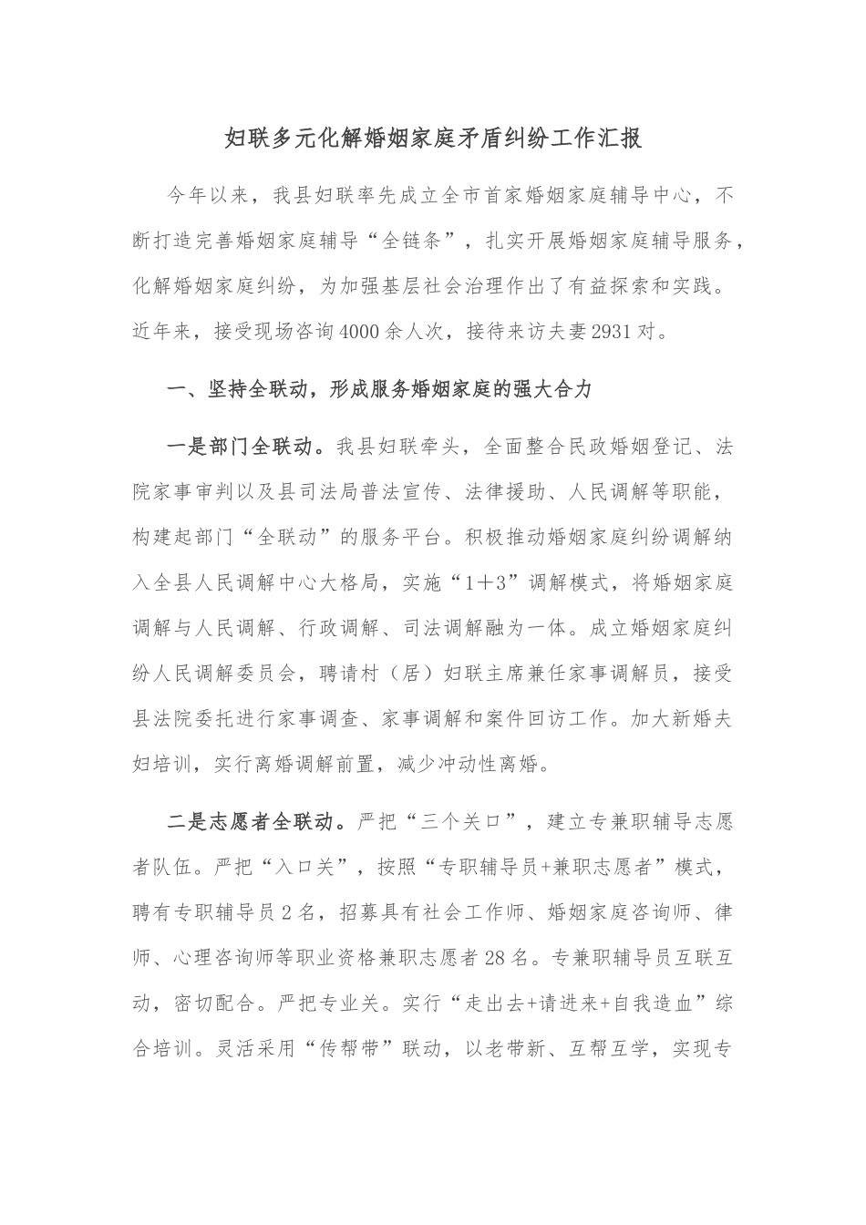 妇联多元化解婚姻家庭矛盾纠纷工作汇报今年以来,我县妇联率先成立全市首家婚姻家庭辅导中心,不断打造完善婚姻家庭辅导“全链条”,扎实开展婚姻家庭辅导服务,化解婚姻家庭纠纷,为加强基层社会治理作出了有益探索和实践。近年来,接受现场咨询4000余人次,接待来访夫妻2931对。一、坚持全联动,形成服务婚姻家庭的强大合力一是部门全联动。我县妇联牵头,全面整合民政婚姻登记、法院家事审判以及县司法局普法宣传、法律援助、人民调解等职能,构建起部门“全联动”的服务平台。积极推动婚姻家庭纠纷调解纳入全县人民调解中心大格局,实施“1+3”调解模式,将婚姻家庭调解与人民调解、行政调解、司法调解融为一体。成立婚姻家庭纠纷人民调解委员会,聘请村(居)妇联主席兼任家事调解员,接受县法院委托进行家事调查、家事调解和案件回访工作。加大新婚夫妇培训,实行离婚调解前置,减少冲动性离婚。二是志愿者全联动。严把“三个关口”,建立专兼职辅导志愿者队伍。严把“入口关”,按照“专职辅导员+兼职志愿者”模式,聘有专职辅导员2名,招募具有社会工作师、婚姻家庭咨询师、律师、心理咨询师等职业资格兼职志愿者28名。专兼职辅导员互联互动,密切配合。严把专业关。实行“走出去+请进来+自我造血”综合培训。灵活采用“传帮带”联动,以老带新、互帮互学,实现专业技能的共同提升。严把考核关。制定《婚姻家庭辅导中心工作流程》《婚姻家庭辅导志愿者行为规范》《婚姻辅导服务记录管理制度》《调解档案管理制度》等多项制度,建立月上报、季督查、年考核的常态化考评机制,确保婚姻辅导工作规范有序、扎实高效。二、坚持全链条,健全服务婚姻家庭的长效机制秉承“牵手是爱,放手是情”的服务宗旨,打破只对离婚关口辅导的局限,加强预防教育与事后服务并举,创新“3+3”工作法,实施“全链条”婚姻家庭辅导服务。一是离婚前干预抢抓“三步”。问卷分流,对当事人婚姻情况进行初步判断;进行“一对一”专业辅导;跟踪回访,巩固服务成效。通过离婚调适辅导,帮助当事人理性面对婚姻家庭中的矛盾,正确看待婚姻的意义、担任的角色和责任,减少离婚对孩子及家庭成员的伤害,维护家庭关系稳定。对于无法维系婚姻关系的家庭,为其提供心理疏导和法律帮助,帮助当事人解决好财产分割、子女抚养、老人赡养等问题,明确双方的权利和义务,最大限度地减少离婚对孩子和家庭的影响。二是婚前引导走好“三步”。为新人解读夫妻双方权利和义务;组织签订《珍爱婚姻》承诺书;举行“新婚加油站”辅导培训。通过婚恋辅导,帮助当事人做好进入婚姻状态的准备,梳理紧张心理,增强家庭观念、责任意识和法律意识,正确处理婚姻家庭生活中可能出现的各种问题。帮助当事人提高婚姻家庭问题应对能力,维护健康、文明、幸福、和谐的婚姻家庭关系。三是婚姻守护落实好“三步”。做好婚姻幸福学宣传培训,定期举办“幸福婚姻大讲堂”;利用幸福家庭驿站,提前介入化解婚姻家庭矛盾;婚姻家庭维权服务联合联动,县妇联、婚姻家庭辅导中心、村(社区)妇女儿童维权站三级发力,共同为“幸福家庭”护航。启动婚姻家庭辅导公益项目,进一步引导家庭成员树立正确的婚恋观、家庭观、人生观。常态化开展家庭教育指导培训、关爱女性健康公益巡讲、心理健康与情绪管理公益讲座等。开通服务热线,开展咨询指导,宣传文明、科学、理性的婚恋观,弘扬新时代文明新风,积家庭小安为社会大安,以家庭和谐促社会稳定。三、坚持全覆盖,构建服务婚姻家庭的立体网络婚姻辅导中心成立以来,**县不断延伸服务触角,拓展服务范围,构建起“1+2+8”婚姻家庭辅导服务体系。辅导范围从协议离婚扩大到诉讼离婚,从离婚辅导扩大到新婚辅导,从中心现场辅导扩大到幸福驿站前置辅导,从主动介入扩大到预约寻求辅导,服务范围不断延伸,构建起覆盖全县的婚姻家庭服务立体网络。一是1处县级婚姻家庭辅导中心。即**县婚姻家庭辅导中心,为群众免费提供专业婚姻辅导及心理咨询服务,对必要的婚姻进行挽回,对无法挽回的婚姻做好心灵安抚及对未成年人的保障。对新婚夫妻进行和谐家庭理念、健康保健等辅导培训。在创新社会治理中积...