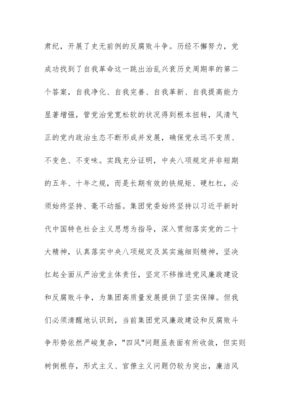 国企党委书记在开展深入贯彻xxx精神学习教育专题读书班上的研讨发言材料文稿同志们:习近平总书记深刻指出:"党的作风是党的形象,关系人心向背,关系党的生死存亡。"xxx,无疑是新时代共产党人作风建设的一张"金色名片",是全面从严治党征程上的"第一枪"。在全党范围内开展深入贯彻xxx精神学习教育,这是以习近平同志为核心的党中央,站在新时代新征程党和国家事业发展全局的战略高度所作出的重大决策部署。作为党的二十大以来的首次党内集中教育,它既是贯彻落实党的二十大精神的关键举措,也是推进党的自我革命、全面从严治党的必然要求,对于全面贯彻党的二十大精神,稳步推进中国式现代化,有着重大而深远的意义。自本次学习教育启动以来,集团党委高度重视,迅速行动,召开了动员部署会,印发了详尽的实施方案,有序组织集中学习,并开展了专题研讨。通过这一系列举措,引导党员干部进一步增强政治自觉、思想自觉与行动自觉,以永远在路上的坚韧与执着,持之以恒正风肃纪,坚定不移地推进全面从严治党。接下来,我谈几点个人体会,供同志们参考交流。一、定盘子谋全局,把准作风建设"方向盘"作风建设,是党的建设的永恒主题,也是全面从严治党的重要内容。党的十八大以来,以习近平同志为核心的党中央,从制定和落实xxx破题,持之以恒正风肃纪,开展了史无前例的反腐败斗争。历经不懈努力,党成功找到了自我革命这一跳出治乱兴衰历史周期率的第二个答案,自我净化、自我完善、自我革新、自我提高能力显著增强,管党治党宽松软的状况得到根本扭转,风清气正的党内政治生态不断形成并发展,确保党永远不变质、不变色、不变味。实践充分证明,xxx并非短期的五年、十年之规,而是长期有效的铁规矩、硬杠杠,必须始终坚持、毫不动摇。集团党委始终坚持以习近平新时代中国特色社会主义思想为指导,深入贯彻落实党的二十大精神,认真落实xxx及其实施细则精神,坚决扛起全面从严治党主体责任,坚定不移推进党风廉政建设和反腐败斗争,为集团高质量发展提供了坚实保障。但我们必须清醒地认识到,当前集团党风廉政建设和反腐败斗争形势依然严峻复杂,"四风"问题虽表面有所收敛,但实则树倒根存,形式主义、官僚主义问题仍较为突出,廉洁风险防控也存在不少薄弱环节。由此可见,全面从严治党永远在路上,党的自我革命亦永远在路上。开展深入贯彻xxx精神学习教育,是巩固拓展作风建设成果、推进全面从严治党的重要举措。集团各级党组织务必切实提高政治站位,深刻认识开展学习教育的重大意义,将其作为当前一项重要政治任务,摆上突出位置,精心组织实施,确保学习教育取得实实在在的成效。要深刻领悟"两个确立"的决定性意义,增强"四个意识"、坚定"四个自信"、做到"两个维护",不断提高政治判断力、政治领悟力、政治执行力。以学习教育为契机,进一步增强贯彻落实xxx精神的思想自觉、政治自觉、行动自觉,以钉钉子精神持之以恒纠治"四风",坚决打好作风建设攻坚战、持久战,为集团高质量发展筑牢坚实的作风根基。二、理路子明方向,筑牢作风建设"压舱石"作风问题,本质上是党性问题。开展深入贯彻xxx精神学习教育,必须把学习贯彻习近平新时代中国特色社会主义思想作为首要任务,深刻领悟习近平总书记关于加强党的作风建设的重要论述,深刻把握xxx精神的核心要义、精神实质、丰富内涵和实践要求,不断提高党性修养,筑牢信仰之基、补足精神之钙、把稳思想之舵。(一)要在学深悟透上下功夫。秉持读原著、学原文、悟原理的态度,认真学习《习近平关于加强党的作风建设论述摘编》,深入学习xxx及其实施细则精神,以及习近平总书记关于国有企业改革发展和党的建设的重要论述。深刻领会其中蕴含的立场观点方法,精准把握党中央推进作风建设的坚定决心和鲜明态度,切实把思想和行动统一到党中央决策部署上来,做到学有所思、学有所悟、学有所得。(二)要在融会贯通上下功夫。将学习贯彻xxx精神与学习贯彻党的二十大、二十届三中全会精神紧密结合,与学习贯彻习近平新时代中国...