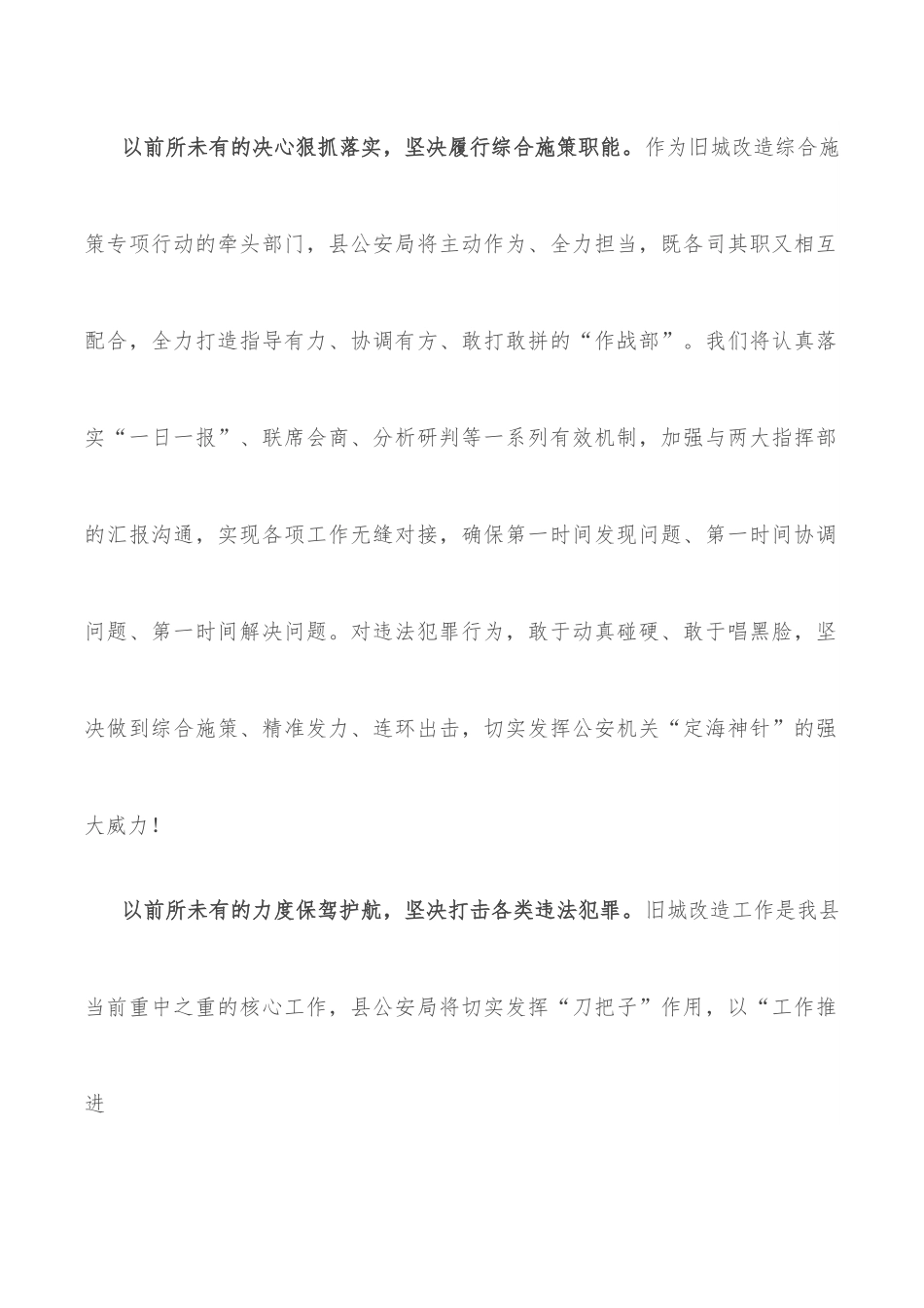 全县老旧小区改造誓师大会上的表态发言(6篇)县公安局政委在全县旧城改造征迁誓师大会上的表态发言公安局作为政府职能部门,全力推进旧城改造房屋征迁工作,义不容辞、责无旁贷。下面,我代表县公安局作如下表态:以前所未有的站位统一思想,坚决执行县委县政府决策部署。县公安局将牢固树立“抢先一拍、快走一步”的责任感和紧迫感,旗帜鲜明讲政治,全心全意护发展,并以贯彻落实此次会议精神为契机,进行再动员、再部署,把认识和行动统一到县委县政府的决策部署上来,聚全警之力、集全警之智,保证本系统工作人员率先签约、率先腾空,认真做好包干联系征迁网格工作,并坚决完成其他各项任务。以前所未有的决心狠抓落实,坚决履行综合施策职能。作为旧城改造综合施策专项行动的牵头部门,县公安局将主动作为、全力担当,既各司其职又相互配合,全力打造指导有力、协调有方、敢打敢拼的“作战部”。我们将认真落实“一日一报”、联席会商、分析研判等一系列有效机制,加强与两大指挥部的汇报沟通,实现各项工作无缝对接,确保第一时间发现问题、第一时间协调问题、第一时间解决问题。对违法犯罪行为,敢于动真碰硬、敢于唱黑脸,坚决做到综合施策、精准发力、连环出击,切实发挥公安机关“定海神针”的强大威力!以前所未有的力度保驾护航,坚决打击各类违法犯罪。旧城改造工作是我县当前重中之重的核心工作,县公安局将切实发挥“刀把子”作用,以“工作推进到哪里、警务就跟进到哪里”为要求,提前介入、主动参与、依法履职,全面搜集情报信息,依法维护现场秩序,为旧城改造顺利推进提供贴身保护。同时,我们将紧密结合*专项斗争行动,对涉及的黄赌毒违法犯罪行为开展严厉打击整治。对无理取闹、造谣生事、恶意阻扰征迁、煽动群众滋事、扰乱公共秩序等各类违法犯罪行为,予以从重从快打击。特别是对在背后煽动滋事的黑恶势力,想尽一切办法、穷尽一切措施,深挖细查,坚决打击,全力为旧城改造工作顺利推进营造安全稳定的治安环境。“喊破嗓子不如甩开膀子”!县公安局将一个声音、一以贯之、一抓到底地贯彻落实好县委、县政府的决策部署,忠诚履职、攻坚克难、全警参与、全力以赴,拿出决胜意志和雷霆手段,全面助力旧城改造,为城市建设保驾护航!县建设局局长在全县旧城改造征迁誓师大会上的表态发言我县聚全县之力实施这次大规模的旧城改造,开启城市建设新篇章。县建设局作为主要责任部门,责无旁贷,一定率先冲锋,坚决打好攻坚战:高速度完成签约。建设系统涉及这次房屋征迁的*名干部职工,在*月*日前将*%完成签约,率先腾空;全系统*处公房和直管公房在*月底前全面腾空。同时,根据包干联系征迁网格专项行动要求,竭力做好协同工作,直至网格内征迁户*%签约、腾空。高质量加快回建。早日建好高品质的安置集聚区,让征迁群众畅享品质生活是我们建设人的心愿和使命。在项目规划上,以建设全县最好的住宅小区为目标,坚持高起点、高标准、高品质规划设计,确保配套齐全、环境优美;在施工力量上,选优建设团队,采用EPC模式,引进大型央企、国企等实力雄厚的公司;在建设标准上,执行绿色建筑二星级标准,确保成为省标化示范工程;在建设速度上,务必在规定时间内完成建设任务,交付时间只提前不延后。高要求实施监管。加强质量监督,引进最先进的BIM技术,实现项目精细化、信息化管理。加强职能监督,加大对项目重点环节、重点部位以及重要材料监管,严格把关,确保工程施工质量与安全。加强社会监督,通过邀请人大代表、政协委员视察,聘请“两代表一委员”担任监督员,设立居民定期回访日等载体和措施,形成全方位监督机制。高效率提供服务。在推进旧城改造过程中,凡是涉及建设局的审批环节,尽可能缩短办件时限,当天能办完的事绝不拖到第二天。同时,强化与其他部门的协作,共同解决旧城改造过程中遇到的问题和困难,确保征迁户早日安居,真正把县城打造成最美温泉养生名城。各位领导、同志们,我们建设系统全体干部职工将在县委、县政府的坚强领导下,秉持创新精神、担当责任、百姓情怀,以永不懈怠的精神状态和一往无前的奋斗姿态,高效高质做好各项工作,当好...
