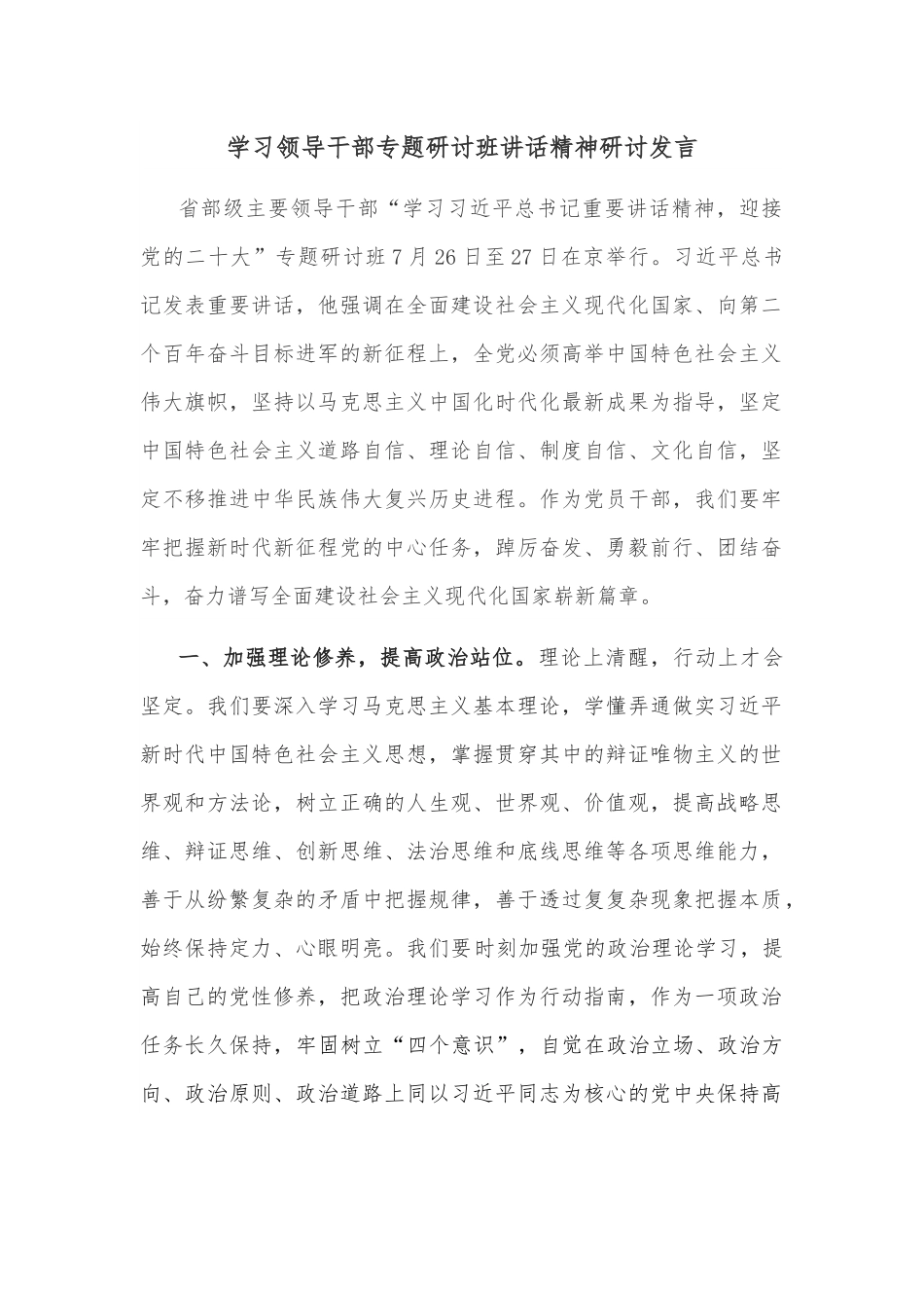 学习领导干部专题研讨班讲话精神研讨发言省部级主要领导干部“学习习近平总书记重要讲话精神,迎接党的二十大”专题研讨班7月26日至27日在京举行。习近平总书记发表重要讲话,他强调在全面建设社会主义现代化国家、向第二个百年奋斗目标进军的新征程上,全党必须高举中国特色社会主义伟大旗帜,坚持以马克思主义中国化时代化最新成果为指导,坚定中国特色社会主义道路自信、理论自信、制度自信、文化自信,坚定不移推进中华民族伟大复兴历史进程。作为党员干部,我们要牢牢把握新时代新征程党的中心任务,踔厉奋发、勇毅前行、团结奋斗,奋力谱写全面建设社会主义现代化国家崭新篇章。一、加强理论修养,提高政治站位。理论上清醒,行动上才会坚定。我们要深入学习马克思主义基本理论,学懂弄通做实习近平新时代中国特色社会主义思想,掌握贯穿其中的辩证唯物主义的世界观和方法论,树立正确的人生观、世界观、价值观,提高战略思维、辩证思维、创新思维、法治思维和底线思维等各项思维能力,善于从纷繁复杂的矛盾中把握规律,善于透过复复杂现象把握本质,始终保持定力、心眼明亮。我们要时刻加强党的政治理论学习,提高自己的党性修养,把政治理论学习作为行动指南,作为一项政治任务长久保持,牢固树立“四个意识”,自觉在政治立场、政治方向、政治原则、政治道路上同以习近平同志为核心的党中央保持高度一致,毫不含糊、不打折扣、表里如一,经得起任何考验,而且落实到实际工作中和一言一行中。二、强化担当精神,自觉履行使命。中国共产党101年的辉煌历史证明,担当精神是共产党人的魂,是脊梁精神。在革命战争年代,担当是为民族独立和人民解放抛头颅洒热血,前赴后继,在所不辞;在今天,担当就是要把人民对美好生活的向往作为奋斗目标,对党和人民负责、为党和人民担责。切实履行职责,对本职工作要常怀一颗感恩之心,一心奉献给人民事业,要把服务一线作为践行“不忘初心、牢记使命”的主考场,把解决人民群众反应的问题作为践行“不忘初心、牢记使命”的主阵地,要倍加珍惜组织的信任,深入实际、深入基层、深入群众,千方百计为一线排忧解难。作为一名党员干部,我们要牢记肩负的责任,自觉站在党和人民的立场上想问题、办事情、干工作,在自己的岗位上尽心尽力,认真履职,不推卸责任,努力完成好每件工作,敢于直面问题,矛盾面前不躲闪,挑战面前不畏惧,困难面前不退缩,在关键时刻和危急关头豁得出来、顶得上去、经受住考验,始终保持无私无畏的胆气和魄力,做一个无愧于组织、无愧于家庭、无愧于他人、无愧于自己的人。三、不断自我革命,提高综合素质。打铁必须自身硬。如何才能做到自身过硬?习近平总书记多次强调,就是要敢于进行自我革命,敢于刀刃向内,敢于刮骨疗伤,敢于壮士断腕,防止祸起萧墙。10年来,我们坚定信心、迎难而上,一仗接着一仗打,攻克了一个又一个难关、取得了一个又一个胜利。在指导思想上,我们坚持把马克思主义基本原理同中国具体实际相结合、同中华优秀传统文化相结合,形成了习近平新时代中国特色社会主义思想,实现了马克思主义中国化新的飞跃。在发展实践上,经过党的十八大以来在理论和实践上的创新突破,我们成功推进和拓展了中国式现代化。今天,党团结带领中国人民又站在了一个新的历史起点,踏上了实现第二个百年奋斗目标新的赶考之路。新的赶考之路,必然会面临许多具有新的历史特点的伟大斗争,必须准备付出更为艰巨、更为艰苦的努力,我们要时刻保持“永远在路上”的清醒与自觉,一日三省吾身,不断自我革命,努力提升自己综合素质,走好新时代的赶考之路。号角已吹响奋进正当时。只有不断加强理论修养、强化担当精神、不断自我革命,全面提升自己综合素质,才能解决好群众的烦心事、揪心事、糟心事,以优异的成绩迎接党的二十大的胜利召开。