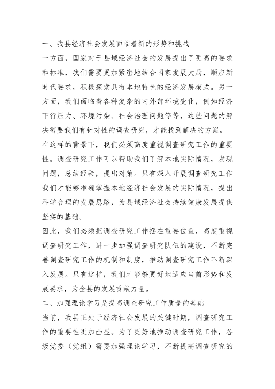 XX县党委全面落实《关于在全党大兴调查研究的工作方案》动员会上的讲话同志们:近日,中共中央办公厅印发了《关于在全党大兴调查研究的工作方案》。我们召开这次会议,就是要提高认识、加强落实,为深入学习贯彻习近平新时代中国特色社会主义思想,全面贯彻落实XX大精神,在我县大兴调查研究工作,推动全面建设社会主义现代化国家开好局起好步。近年来,我县发展进入新时代,面临着各种新的问题和挑战。作为县委的领导班子,我们必须深入了解实际情况,把握发展方向,提出切实可行的解决方案,为推动县域经济社会持续健康发展提供有力支持。在这个过程中,调查研究工作的重要性不言而喻。调查研究是我们党的传家宝是决策、实施、推广各项工作的重要前提和基础。习近平总书记曾强调指出,没有调查就没有发言权,没有调查就没有决策权,调查研究是谋事之基、成事之道。因此,我们必须高度重视调查研究工作,深入领会习近平总书记的重要论述,提高做好调查研究工作的思想自觉和政治自觉今天,我们在这里,就是要从实际出发,为大家讲解我们如何在全县范围内大兴调查研究,为县域经济社会发展提供有力支持。下面,我讲几点意见。一、我县经济社会发展面临着新的形势和挑战一方面,国家对于县域经济社会的发展提出了更高的要求和标准,我们需要更加紧密地结合国家发展大局,顺应新时代要求,积极探索具有本地特色的经济发展模式。另一方面,我们面临着各种复杂的内外部环境变化,例如经济下行压力、环境污染、社会治理问题等等,这些问题的解决需要我们有针对性的调查研究,才能找到解决的方案。在这样的背景下,我们必须高度重视调查研究工作的重要性。调查研究工作可以帮助我们了解本地实际情况,发现问题,总结经验,提出对策。只有深入开展调查研究工作我们才能够准确掌握本地经济社会发展的实际情况,提出科学合理的发展思路,为县域经济社会持续健康发展提供坚实的基础。因此,我们必须把调查研究工作摆在重要位置,高度重视调查研究工作,进一步加强调查研究队伍的建设,不断完善调查研究工作的机制和制度,推动调查研究工作不断深入发展。只有这样,我们才能够更好地适应当前形势和发展要求,为全县的发展贡献力量。二、加强理论学习是提高调查研究工作质量的基础当前,我县正处于经济社会发展的关键时期,调查研究工作的重要性更加凸显。为了更好地推动调查研究工作,各级党委(党组)需要加强理论学习,不断提高调查研究的思想自觉和政治自觉。首先,我们要认真学习习近平总书记关于调查研究的重要论述,深刻理解调查研究对于全面建设社会主义现代化国家的重要意义。要认识到调查研究是一项基础性、全局性战略性的工作,需要各级干部深入基层,了解实际情况,把调查研究与制定政策、解决问题紧密结合起来,真正把调查研究工作贯彻到实践中去。其次,我们要注重理论学习的深度和广度。可以通过理论学习中心组学习、读书班等形式,选取相关调查研究方面的专题进行深入学习,注重学习方法的改进和提高。同时还要注意拓宽理论学习的广度,了解当前国内外的研究动态和趋势,对比其他地区、其他国家的调查研究经验,吸取有益经验和方法。最后,要营造良好的学习氛围,加强调查研究工作的宣传和培训,提高调查研究工作的专业化水平。可以通过举办经验交流会、组织实地观摩等形式,加强干部之间的交流和沟通,推动调查研究工作的不断提高。通过理论学习中心组学习、读书班等,加强理论学习习近平总书记关于调查研究的重要论述,提高调查研究的思想自觉、政治自觉。三、提高行动自觉进一步提高调查研究工作的实效性和针对性首先,我们需要加强与群众的联系。只有了解群众的真实需求和实际情况,才能做出具有针对性的调查研究,并提出切实可行的解决方案。可以通过走访社区、企业、学校等基层单位,与群众面对面交流,听取群众意见和建议。也可以通过开展问卷调查等方式,收集群众的意见和反馈全面了解情况。其次,我们要注重实践,不断总结和提炼实践经验。只有将调查研究的理论知识转化为实际行动,才能不断提高调查研究的实效性和针对性。可以通过制定调查研究计划、实地调查、数据分...