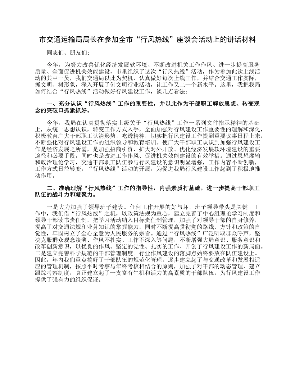 市交通运输局局长在参加全市“行风热线”座谈会活动上的讲话材料同志们、朋友们;今年,为努力改善优化经济发展软环境、不断改进机关工作作风、进一步提高服务质量、全面促进机关效能建设,市里组织了这次“行风热线”活动,作为参加此次上线活动的其中一员,我们交通局以此为契机,认真做好每次上线工作,并结合交通工作实际,抓文明、树形象,深入开展了创文明行业活动,让工作又上一个新水平。这里,我把我局如何结合“行风热线”活动做好行风建设工作,谈几点看法:一、充分认识“行风热线”工作的重要性,并以此作为干部职工解放思想、转变观念的突破口抓紧抓好。今年,我局在认真贯彻落实上级关于“行风热线”工作一系列文件指示精神的基础上,从统一思想认识,转变工作方式入手,全面加强对行风建设工作重要性的理解和深化,积极教育广大干部职工认清形势,吃透精神,切实把行风建设工作提到重要议事日程上来,不断强化对行风建设工作的组织领导和教育培训。使广大干部职工认识到加强行风建设工作是经济发展之所需,是加强招商引资、扩大对外开放、优化经济发展软环境建设的重要途径和必要手段,同时也是改进工作作风、促进机关效能建设的有效举措。通过思想灌输和政治理论学习,交通干部职工队伍参与行风建设的意识明显增强,工作内容不断创新,工作方式日益转变,“行风热线”活动的开展,为促进我局行风建设工作起到了积极地推动作用。二、准确理解“行风热线”工作的指导性,内强素质打基础,进一步提高干部职工队伍的战斗力和凝聚力。一是大力加强了领导班子建设。任何工作开展的好与坏,班子领导带头是关键。工作中,我们借“行风热线”之机,以政策法规为重心,建立完善了中心组理论学习制度和领导干部读书责任制,把学习活动纳入目标责任制管理,加强了对领导干部的自身修养,提高了对交通法规和业务知识的掌握能力。同时不断提高贯彻党的路线、方针和政策的自觉性,牢固树立了全心全意为人民服务的宗旨。通过“行风热线”广泛听取群众呼声,坚决克服群众观念淡薄、作风不扎实、工作不深入等问题,不断增强大局意识、服务意识和改革创新意识,以优良的作风、坚定的党性、扎实的工作、开创了行风建设工作的新局面。二是建立完善科学规范的干部管理制度。行业作风建设的落脚点始终要放在队伍建设上。因此,年内我们重点搞好了干部队伍的规范化管理,逐步建立起了与交通改革和发展相适应的管理机制,按照平时考察与年终考核相结合的原则,加强了对干部的动态管理,建立跟踪考察制度,真正建立起了一支富有生机和活力的高素质的干部队伍,为行风建设工作提供了强有力的组织保证。三、正确把握“行风热线”工作的实践性,听群众心声、为群众服务,全面提高廉政勤政工作水平。每次上线以后,我们总是把群众提到的问题逐一统计、反复讨论、举一反三,并把廉政工作作为今年本局行风工作的要点抓紧抓好。一是抓好了各项制度的修订完善。针对热线中群众提出的问题,我们坚持以此为切入点,找准自身工作中存在的不足,从健全规章制度入手,以深入实施“民心工程”为契机,进一步落实党风廉政建设责任制,压缩各项庆典活动和会议事项,严格费用管理,重点抓好了公务接待、行政用车和电话通讯管理等廉政工作的焦点现象,采取“三管”齐下(管耳朵、管嘴、管腿)的管理方法,把各项非生产性费用开支压减到了最低。二是抓好了自律意识。形成了一级管一级、一级监督一级、级级关联、层层监督的制约管理模式,领导干部率先垂范,对亲属、子女及身边工作人员“约法三章”,严禁利用职务便利为亲属、子女及工作人员谋取私利。严格控制工程分包、材料采购、工程计量支付、人事管理等重点环节,对工程建设项目实行了招投标制度。特别针对工程施工运作资金大、容易出现管理漏洞的实际情况,我们严格规范了控制程序,积极抓好了优质廉政工程建设,强化对工程建设的廉政防范举措,使廉政建设贯穿到工程建设的每一个环节,堵塞了管理漏洞,有效避免了职务犯罪行为和腐败现象的发生。我的发言完毕,谢谢大家!