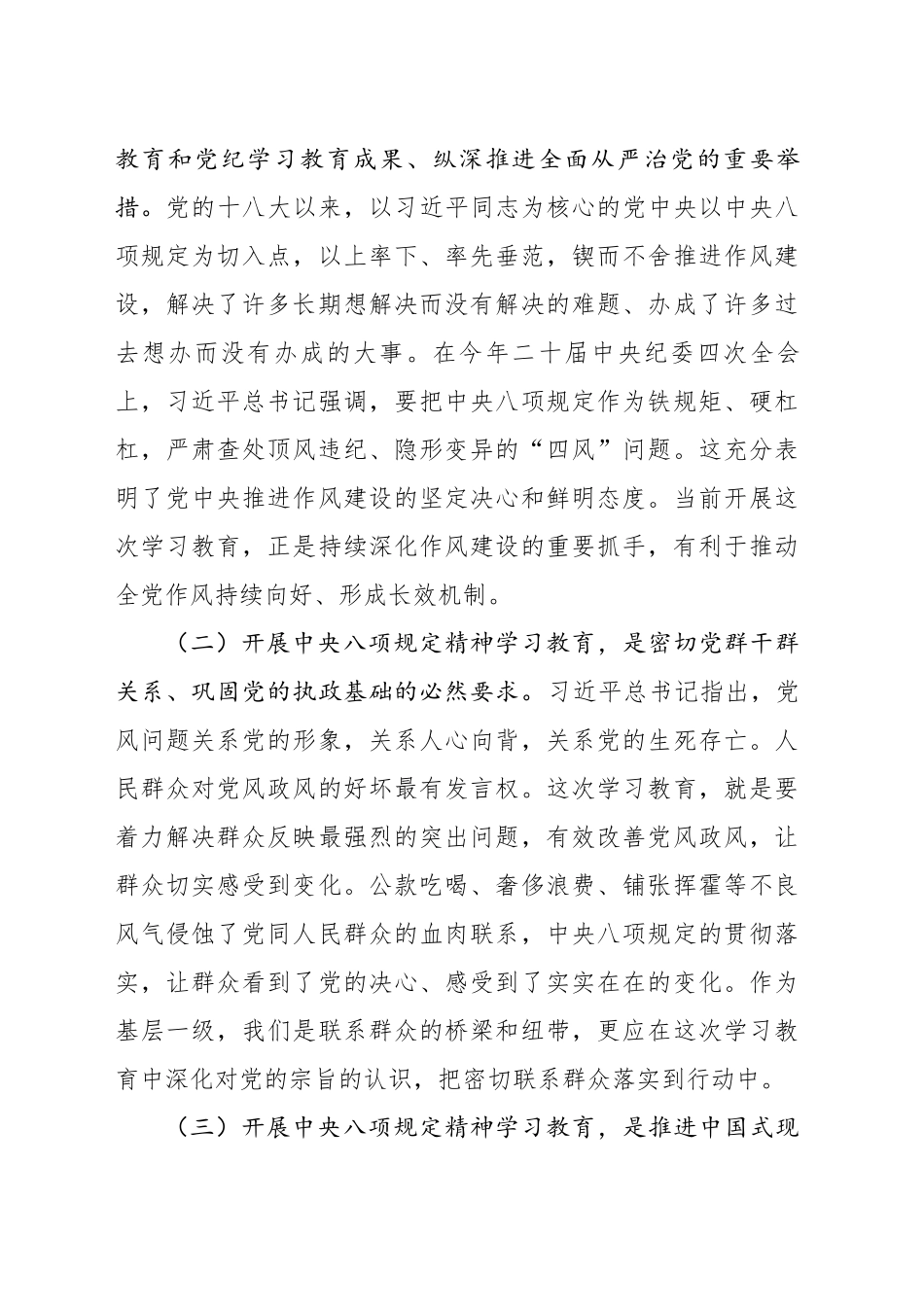 深入贯彻xxx学习教育专题党课讲稿:严守xxx精神,争做新时代合格党员同志们:今天,我们组织这次党课学习,主题是“严守xxx精神,争做新时代合格党员”。近日,中共中央办公厅印发《关于在全党开展深入贯彻xxx精神学习教育的通知》,对全党开展深入贯彻xxx精神学习教育作出部署安排。习近平总书记高度重视这项工作,亲自谋划确定学习教育主题,发表重要讲话、作出重要指示,为开展学习教育指明了方向。作为基层党员,我们要深刻认识开展这次学习教育的重大意义,坚定拥护“两个确立”、坚决做到“两个维护”,切实把思想和行动统一到习近平总书记、党中央决策部署上来,以高度的政治自觉、思想自觉、行动自觉把学习教育落到实处。下面,我结合支部的实际,就贯彻xxx精神学习教育的认识及如何更好践行等方面,与大家交流探讨。一、深刻认识开展深入贯彻xxx精神学习教育的重大意义(一)开展xxx精神学习教育,是巩固拓展主题教育和党纪学习教育成果、纵深推进全面从严治党的重要举措。党的十八大以来,以习近平同志为核心的党中央以xxx为切入点,以上率下、率先垂范,锲而不舍推进作风建设,解决了许多长期想解决而没有解决的难题、办成了许多过去想办而没有办成的大事。在今年二十届中央纪委四次全会上,习近平总书记强调,要把xxx作为铁规矩、硬杠杠,严肃查处顶风违纪、隐形变异的“四风”问题。这充分表明了党中央推进作风建设的坚定决心和鲜明态度。当前开展这次学习教育,正是持续深化作风建设的重要抓手,有利于推动全党作风持续向好、形成长效机制。(二)开展xxx精神学习教育,是密切党群干群关系、巩固党的执政基础的必然要求。习近平总书记指出,党风问题关系党的形象,关系人心向背,关系党的生死存亡。人民群众对党风政风的好坏最有发言权。这次学习教育,就是要着力解决群众反映最强烈的突出问题,有效改善党风政风,让群众切实感受到变化。公款吃喝、奢侈浪费、铺张挥霍等不良风气侵蚀了党同人民群众的血肉联系,xxx的贯彻落实,让群众看到了党的决心、感受到了实实在在的变化。作为基层一级,我们是联系群众的桥梁和纽带,更应在这次学习教育中深化对党的宗旨的认识,把密切联系群众落实到行动中。(三)开展xxx精神学习教育,是推进中国式现代化的有力保障。当前,我们正处在实现中华民族伟大复兴的关键时期,面对国内外复杂严峻的形势任务,党员干部的作风直接关系到各项事业能否顺利推进。xxx精神的有效贯彻落实,有助于纠正形式主义、官僚主义问题,端正党风政风,带动社会风气好转,为中国式现代化建设营造风清气正的政治生态和社会环境。开展这次学习教育,就是要进一步激发全党担当作为、干事创业的精气神,把更多精力用在推动发展、服务群众上,以良好作风保障改革发展稳定各项任务的落实。二、全面理解xxx精神的核心要义(一)区分好xxx与xxx精神的关系与区别我们有些同志,特别是刚参加工作不久的年青同志,对xxx与xxx精神了解不够,学习不足,以为这两个名词是一回事。实际上,他们是两个有所区别的概念。xxx是指是指2012年12月4日,中共中央政治局召开会议,审议通过的《中央政治局关于改进工作作风、密切联系群众的八项规定》。因为其主要内容有八条,所以简称“xxx”或“八项规定”。这一规定明确要求以政治局为表率,以上率下,主要包括改进调查研究、精简会议活动、精简文件简报、规范出访活动、改进警卫工作、改进新闻报道、严格文稿发表、厉行勤俭节约八个方面的具体内容。2017年10月27日,十九届中央政治局首次会议又审议通过了《中共中央政治局贯彻落实xxx的实施细则》,进一步细化了相关要求。而“xxx精神”的内涵则更为广泛。配合八项规定,中央还制定出台了厉行节约等多项重要党内法规,包括《党政机关厉行节约反对浪费条例》《党政机关国内公务接待管理规定》《关于党政机关停止新建楼堂馆所和清理办公用房的通知》《...