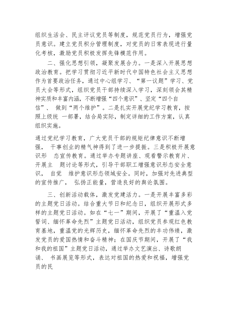 某局党建工作交流发言材料尊敬的各位领导、同志们:大家好!非常荣幸能在这里就我局的党建工作与大家进行交流。在当前全面从严治党的新形势下,党建工作对于推动xx事业发展具有至关重要的作用。我局始终坚持以习近平新时代中国特色社会主义思想为指导,紧密围绕中心工作,扎实推进党建工作,取得了一定的成效。现将具体情况汇报如下:一、加强组织建设,筑牢党建基础。一是优化党组织设置。根据工作需要和党员分布情况,合理调整党组织设置,确保党组织覆盖到局的各个部门和工作环节。我们设立了xx个党支部,选优配强党支部书记和委员,明确职责分工,形成了较为完善的党组织架构,为党建工作的顺利开展提供了有力保障。二是加强党员队伍建设。严格党员发展程序,按照“控制总量、优化结构、提高质量、发挥作用”的总要求,积极培养和发展政治素质高、工作能力强的优秀青年和业务骨干加入党组织。近年来,共发展党员xx名,为党组织注入了新鲜血液。三是强化党员教育培训。通过集中学习、专题讲座、在线学习等多种方式,组织党员深入学习党的理论方针政策和业务知识,不断提升党员的政治素质和业务能力。今年以来,累计开展各类培训xx场次,培训党员xx人次。四是加强党员日常管理。严格执行“三会一课”、主题党日、组织生活会、民主评议党员等制度,规范党员行为,增强党员意识。建立党员积分管理制度,对党员的日常表现进行量化考核,激励党员积极发挥先锋模范作用。二、强化思想引领,凝聚发展合力。一是深入开展思想政治教育。把学习贯彻习近平新时代中国特色社会主义思想作为首要政治任务,通过中心组学习、“第一议题”学习、党员大会等形式,组织党员干部持续深入学习,深刻领会其精神实质和丰富内涵,不断增强“四个意识”、坚定“四个自信”、做到“两个维护”。二是扎实开展党纪学习教育,按照上级统一部署,结合局实际,制定详细的工作方案,认真组织实施。通过党纪学习教育,广大党员干部的规矩纪律意识不断增强,干事创业的精气神得到了进一步提振。三是积极开展意识形态宣传教育。通过举办专题讲座、观看警示教育片、开展主题讨论等形式,引导干部职工增强意识形态安全意识,自觉维护意识形态领域安全。同时,加强对先进典型的宣传推广,弘扬正能量,营造良好的舆论氛围。三、创新活动载体,激发党建活力。一是开展丰富多彩的主题党日活动。结合重大节日和纪念日,组织开展形式多样的主题党日活动。如在“七一”期间,开展了“重温入党誓词、缅怀革命先烈”主题党日活动,组织党员参观红色教育基地,重温党的光辉历史,缅怀革命先烈的丰功伟绩,激发党员的爱国热情和奋斗精神;在国庆节期间,开展了“我和我的祖国”主题党日活动,通过举办文艺演出、诗歌朗诵、书画展览等形式,表达对祖国的热爱和祝福,增强党员的民族自豪感和使命感。二是注重主题党日活动与业务工作相结合。开展了“党员先锋岗”“党员示范窗口”等创建活动,引导党员在工作中亮身份、当先锋、作表率,充分发挥党员的先锋模范作用。通过这些活动的开展,不仅丰富了党员的组织生活,也增强了党组织的凝聚力和战斗力。三是推进党建与业务深度融合。坚持党建工作与业务工作同谋划、同部署、同推进、同考核,制定出台了《关于推进党建与业务深度融合的通知》,明确了融合的目标任务和具体措施。在工作中,找准党建工作与业务工作的结合点,将党建工作贯穿于业务工作的全过程,通过开展“党建+项目建设”“党建+服务企业”“党建+乡村振兴”等活动,推动党建工作与业务工作相互促进、共同发展。四是建立健全党员领导干部联系基层制度。每位党员领导干部联系xx个基层部门,定期深入基层开展调研指导,帮助解决实际问题。同时,组织党员干部开展志愿服务活动,积极参与文明城市创建、环境整治、扶贫帮困等工作,为群众办实事、解难题,以实际行动践行党的宗旨。四、加强党风廉政建设,营造风清气正政治生态。一是落实党风廉政建设责任制。局党组切实履行党风廉政建设主体责任,将党风廉政建设工作纳入全局工作总体布局,与业务工作同部署、同落实、同检查、同考核。制定了《党风廉政建设责任清单》,明...
