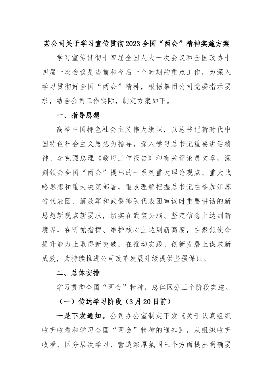 某公司关于学习宣传贯彻2023全国“两会”精神实施方案学习宣传贯彻十四届全国人大一次会议和全国政协十四届一次会议是当前和今后一个时期的重点工作,为深入学习贯彻好全国“两会”精神,根据集团公司党委指示要求,结合公司工作实际,制定方案如下。一、指导思想高举中国特色社会主义伟大旗帜,以总书记新时代中国特色社会主义思想为指导,深入学习总书记重要讲话精神、李克强总理《政府工作报告》和有关评论员文章,深刻领会全国“两会”提出的一系列重大理论观点、重大战略思想和重大决策部署,重点理解把握总书记在参加江苏省代表团、解放军和武警部队代表团审议时重要讲话的新思想新观点新要求,切实在武装头脑、坚定信念上达到新境界,在听党指挥、维护核心上达到新高度,在聚焦使命提升能力上取得新突破,在推动实践、创新发展上谋求新成效,为持续推进公司改革发展升级提供坚强保证。二、总体安排学习贯彻全国“两会”精神,总体区分三个阶段实施。(一)传达学习阶段(3月20日前)一是下发通知。公司办公室制定下发《关于认真组织收听收看和学习全国“两会”精神的通知》,从组织收听收看、区分层次学习、营造浓厚氛围三个方面提出明确要求。二是收听收看。组织全体职工同步收听收看会议盛况,跟进学习主流媒体的新闻报道、报告摘登和相关评论社论依托“***”开展新闻日评和体会交流,并利用公司**平台、微信公众号等载体,及时反映公司学习动态。三是动员部署。参加集团公司学习贯彻全国“两会”精神视频会议,制定印发《**公司学习宣传贯彻全国“两会”精神实施方案》,安排部署学习宣传贯彻全国“两会”精神工作。(二)专题学习阶段(4月上旬前)一是党委中心组专题学。公司党委中心组成员要坚持先学一步、学深一层,采取个人自学、集中学习、专题研讨等方式,深入学习总书记在会议期间的系列重要讲话和李克强总理《政府工作报告》等内容,切实以“两会”精神为指导抓好年度工作谋划,深刻总结公司改革发展特别是3年改革发展以来的实践经验,运用理论成果推动公司在新的起点上持续高质量发展。二是班子成员下沉讲。利用联系点帮带时机,组织党委班子成员为分公司传达“两会”精神,教育引导广大职工群众主动对标总书记重要讲话精神和《政府工作报告》部署,把“两会”精神融入到全年工作谋划中,落实到日常工作实践中,进一步强化忧患意识,进一步明确目标任务,进一步坚定必胜信心,以钉钉子的钻劲,咬定青山不放松的韧劲,从正在抓的工作抓起,从正在干的事情干起,一步一个脚印,扎扎实实地推动学习贯彻走深走实。(公司各工作组自行组织)三是党校专家来公司讲。邀请市委党校专家到公司围绕深入学习贯彻总书记全国“两会”重要讲话精神,解读年政府工作报告要点和扎实做好**发展工作等三个方面,为公司全体职工作辅导报告,教育引导广大职工群众积极落实党中央、国务院高质量发展的“首要任务”,聚焦公司业务发展任务,时刻保持勇争一流的状态,坚决打赢年度目标任务。四是理论骨干穿插讲。公司机关业务部门,梳理总书记重要讲话精神和《政府工作报告》关键词,在公司公众号开设“两会”学习专题栏目,制作名词解释小卡片和应知应会“口袋书”,发放到每名员工手中,由青年理论骨干利用集会、**的时间,以通俗的语言、易懂的词语讲解关键词、知识点,并利用点滴时间翻一翻、记一记、考一考,帮助员工坚定信心决心,牢固树立“四个意识”,坚决扞卫“两个确立”,自觉强化“四个自信”,始终做到“两个维护”。五是全体员工自主学。编印全国“两会”精神学习资料汇编,公司党委中心组成员,党员干部和职工群众要把全国“两会”精神纳入个人自学计划,切实用好“学习强国指导员工通过阅读文章、视听学习、发表观点、知识答题等形式跟进学、拓展学、持久学。注重发挥典型示范引领作用,广泛开展向**站和先进典型学习活动,用身边人身边事影响和带动广大职工群众把思想和行动向全国“两会”聚焦。(三)深化学习阶段(4月中旬到年底)坚持学以致用、用以促学,将学习融入实践、进入工作,不断把学习贯彻引向深入。在联系思想实际、凝聚认知认同上,把学习全国“两会”...