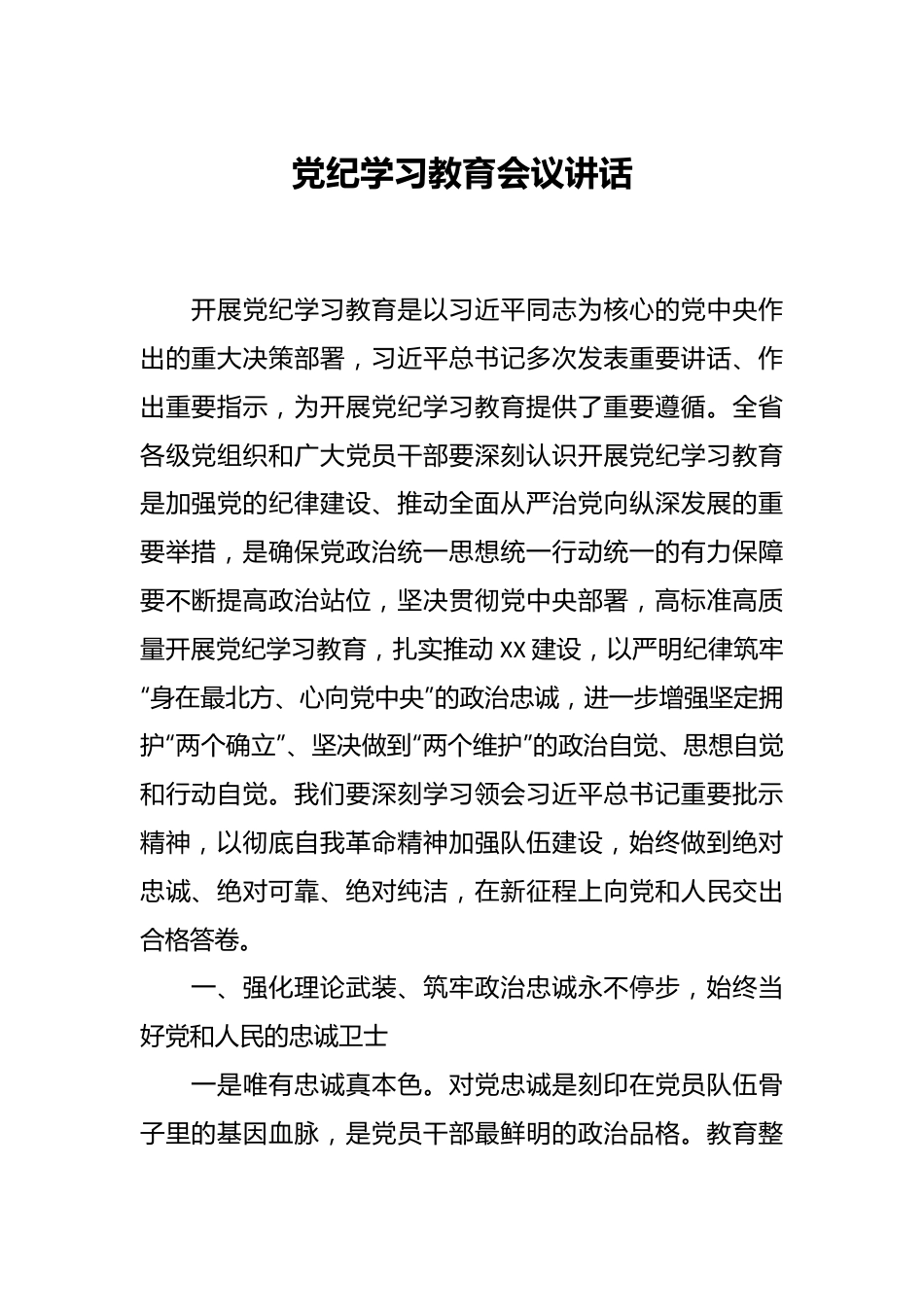党纪学习教育会议讲话开展党纪学习教育是以习近平同志为核心的党中央作出的重大决策部署,习近平总书记多次发表重要讲话、作出重要指示,为开展党纪学习教育提供了重要遵循。全省各级党组织和广大党员干部要深刻认识开展党纪学习教育是加强党的纪律建设、推动全面从严治党向纵深发展的重要举措,是确保党政治统一思想统一行动统一的有力保障要不断提高政治站位,坚决贯彻党中央部署,高标准高质量开展党纪学习教育,扎实推动XX建设,以严明纪律筑牢“身在最北方、心向党中央”的政治忠诚,进一步增强坚定拥护“两个确立”、坚决做到“两个维护”的政治自觉、思想自觉和行动自觉。我们要深刻学习领会习近平总书记重要批示精神,以彻底自我革命精神加强队伍建设,始终做到绝对忠诚、绝对可靠、绝对纯洁,在新征程上向党和人民交出合格答卷。一、强化理论武装、筑牢政治忠诚永不停步,始终当好党和人民的忠诚卫士一是唯有忠诚真本色。对党忠诚是刻印在党员队伍骨子里的基因血脉,是党员干部最鲜明的政治品格。教育整顿中,我们把铸就政治忠诚作为首要目标,强化理论武装抓实党性教育,党员干部坚定拥护“两个确立”、坚决做到“两个维护”的政治自觉显著增强。对党忠诚贵在始终、重在践行。新征程上,党员干部要传承红色基因,旗帜鲜明讲政治、赤心向党铸忠诚。二是以强化理论武装筑牢忠诚之基。政治上的坚定源于理论上的清醒。经过主题教育和教育整顿的思想淬炼,越来越感觉到,习近平新时代中国特色社会主义思想博大精深,是立足时代之基、回答时代之问、引领时代之变的科学真理,必须常学常新、温故知新、入脑入心。带着感情、满怀崇敬,把学懂弄通做实习近平新时代中国特色社会主义思想作为必修课、首修课、终身课,全面系统学、严肃认真学,学出更加纯粹的忠诚、学出更加坚定的信仰学出更加强烈的担当。突出重点、以学促干,深学细悟习近平总书记关于党的自我革命的重要思想、全面从严治党以及党员工作的重要论述,真正弄清楚我们党为什么要自我革命的道理所在、想明白为什么能自我革命的底气所在领会透怎样推进自我革命的实践要求,运用好“六个必须坚持”的世界观和方法论,将党员工作高质量发展的思路举措搞得更加科学、更加严密、更加有效。三是以坚定理想信念彰显忠诚之志。理想信念是共产党人的根和魂,是党员干部安身立命之本,只有理想信念坚定,对党忠诚才有理性基础。要时刻牢记我们入党时面对鲜红党旗立下的誓言,经常问一问自己是谁、要干什么继承发扬党员机关因党而生、为党而战的优良传统和作风坚守初心、勇担使命,做到一句誓言、一生作答。不断锤炼党性修养经常同习近平总书记重要讲话重要指示批示精神和党中央要求对标,拿党章党规党纪扫描,深刻汲取习近平总书记关于党的自我革命的重要思想中蕴含的坚定理想信念、加强党性锻炼、提升精神境界和道德水平的思想营养,自觉传承伟大建党精神,传承焦裕禄精神、红旗渠精神、大别山精神,持续修好共产党人的“心学”,真正从思想上正本清源、固本培元,做到铁心跟党走、九死而不悔。四是以做到“两个维护”检验忠诚之效。党员干部对党忠诚是具体的、实践的,必须体现在履职尽责的行动和实效上。始终把贯彻习近平总书记重要讲话重要指示批示精神特别是关于河南工作的重要要求,作为头等大事和政治要件来抓,建立健全专班推进、专人负责、专题监督工作机制,重点加强对实施黄河流域生态保护和高质量发展、南水北调后续工程高质量发展、中部地区崛起等国家重大战略的全过程监督,推动条条落实、件件落地、事事见效。严明政治纪律和政治规矩,聚焦政治忠诚、政治安全、政治责任、政治立场和党内政治生活强化监督,及时发现、着力解决“七个有之”问题,坚决防止领导干部成为利益集团和权势团体的代言人、代理人。始终相信组织、依靠组织服从组织,在组织面前当“透明人”、不当“两面人”,任何时候任何情况下都同党中央同心同德。二、锤炼能力作风、强化履职担当永不停歇,始终当好正风肃纪反腐的英勇战士一是最是担当见风骨,最是斗争显精神。教育整顿中我们注重把提振精气神与提升能力本领结合起来,抓好结合融合,深...