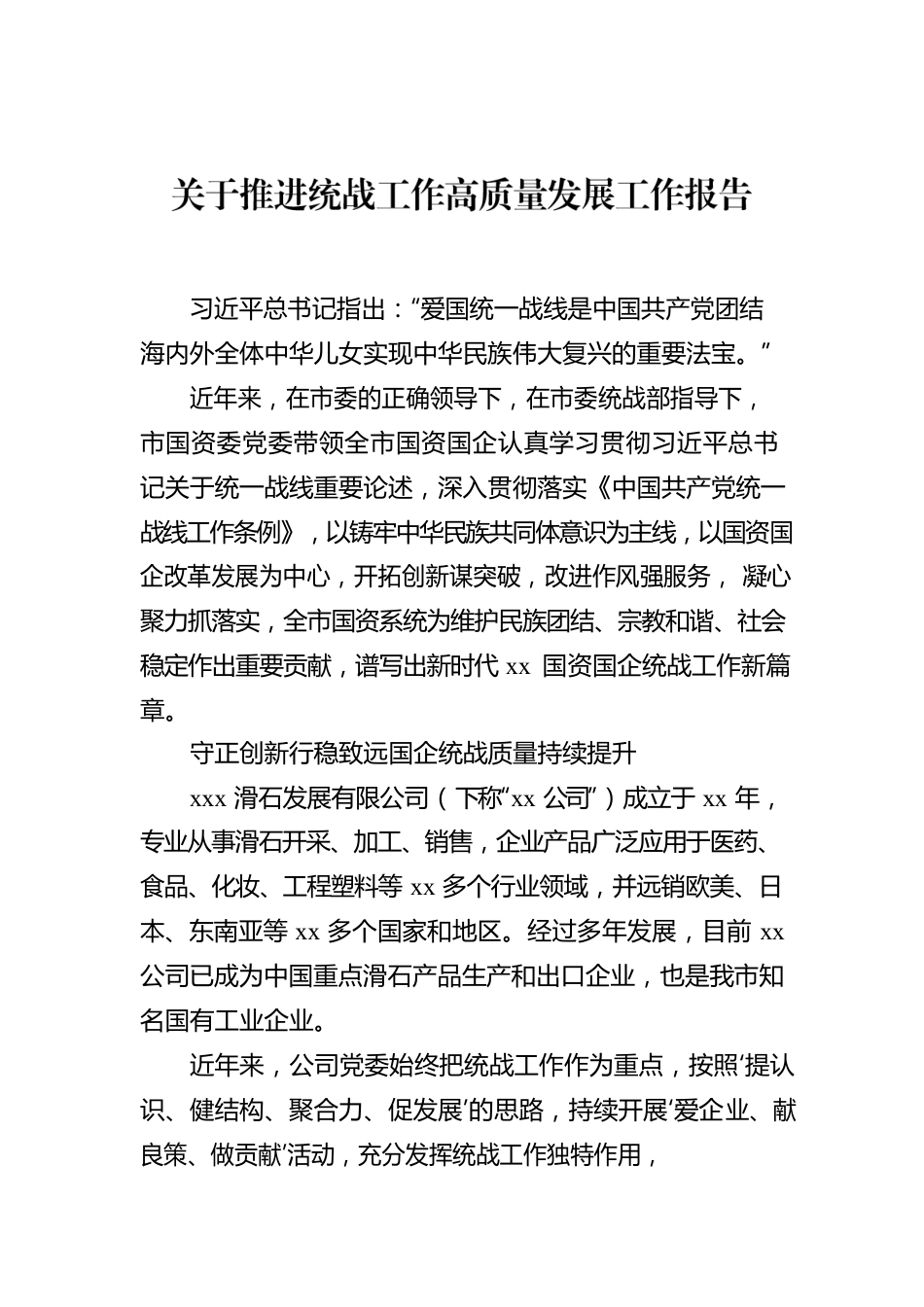 习近平总书记指出:“爱国统一战线是中国共产党团结海内外全体中华儿女实现中华民族伟大复兴的重要法宝。”近年来,在市委的正确领导下,在市委统战部指导下,市国资委党委带领全市国资国企认真学习贯彻习近平总书记关于统一战线重要论述,深入贯彻落实《中国共产党统一战线工作条例》,以铸牢中华民族共同体意识为主线,以国资国企改革发展为中心,开拓创新谋突破,改进作风强服务,凝心聚力抓落实,全市国资系统为维护民族团结、宗教和谐、社会稳定作出重要贡献,谱写出新时代xx国资国企统战工作新篇章。守正创新行稳致远国企统战质量持续提升xxx滑石发展有限公司(下称“xx公司”)成立于xx年,专业从事滑石开采、加工、销售,企业产品广泛应用于医药、食品、化妆、工程塑料等xx多个行业领域,并远销欧美、日本、东南亚等xx多个国家和地区。经过多年发展,目前xx公司已成为中国重点滑石产品生产和出口企业,也是我市知名国有工业企业。近年来,公司党委始终把统战工作作为重点,按照‘提认识、健结构、聚合力、促发展’的思路,持续开展‘爱企业、献良策、做贡献’活动,充分发挥统战工作独特作用,凝聚人心士气。作为外贸企业,公司产品每进入一个国家和地区,公司员工都及时与当地华人商会取得联系,广交朋友,通过商会的牵线搭桥迅速打开国际市场。在长期的经贸交流中,伴随着“xx产”滑石的市场版图不断扩大,xx人与全球各地的客户也逐渐从合作伙伴变为朋友,他们成为xx乃至中国与世界交流的桥梁。xx年初,新冠肺炎疫情在国内暴发,口罩等防疫物资紧缺。知悉情况后,xx公司的多个海外客户立即行动,在所在国家和地区大量购入防疫物资寄给该公司。其中一家日本企业因为批量购买困难和物流不便,两次发动员工分散购买防疫物资后,再派人从日本乘飞机送至上海,然后将物资寄到xx。外国客户寄来的防疫物资解决了我们的燃眉之急。在那段艰难时期,我们不仅不缺乏防疫物资,还有一些富余捐赠给其他兄弟企业,并为公司后来迅速实现复工复产打下坚实基础。滴水之恩当涌泉相报。疫情在国内得到有效控制后,在全球各地又开始暴发。xx人迅速在我市采集大批防疫物资,捐赠给xx、xx、xx、xx、xx等国客户。xx公司总裁法比先生说:“疫情在xxx的暴发造成防疫物资紧缺,口罩价格不仅贵,而且根本就买不到,多亏中国朋友送来的这些防疫物资。”为了做好统战工作,xx公司充分发挥“爱企业、献良策、做贡献”等统战活动品牌作用,邀请统战成员代表参加或列席职代会、党代会、青年座谈会等,广泛听取他们的意见和建议,持续提升企业管理水平。针对公司龙胜矿区位于少数民族自治地区,地处偏僻、周边村民出路少收入低的实际情况,公司与矿区周边x个村民小组共同出资成立滑石加工公司,开展“村企共建”活动,为周边村民提供就业岗位。近年来,公司累计帮助矿区周边xxx多人就近就业,实现企业获利、村里获益、村民受惠的多方共赢,构建良好矿地和谐环境。xx公司在统战工作中取得的明显成效,只是全市国资国企推进统战工作的一个缩影。近年来,全市国资国企始终注重强化政治引领,全面统筹推进,着力构建大统战工作格局,积极帮助支持民营经济发展,助力少数民族地区精准脱贫和乡村振兴,为xx统战工作高质量发展作出重要贡献。发挥统战法宝作用推动国资国企改革发展基层统战工作是统战工作的重要基础,国有企业是统战工作的重要阵地和经济统战的重要战场。今年以来,在市国资委党委带领下,全市各国企党组织特别是党组织主要负责人切实提高政治站位,始终把加强统一战线作为政治任务抓实抓牢。该委积极组织引导国资国企统一战线人士深入学习贯彻习近平新时代中国特色社会主义思想,开展红色基地现场体验主题教育实践活动,切实把思想政治引领成果转化为助推国资国企经济发展的强大动力。在促进民族团结方面,市国资委坚持铸牢中华民族共同体意识这一主线,深入开展民族团结进步创建工作进机关、进企业、进社区、进乡村活动;充分发挥国资国企人才荟萃的优势,组织统一战线各界人士,紧紧围绕国资国企发展的重大问题开展考察调研,动员党外人士为国资国企深化改革、扩大开放、促进发展、保持稳定积极...