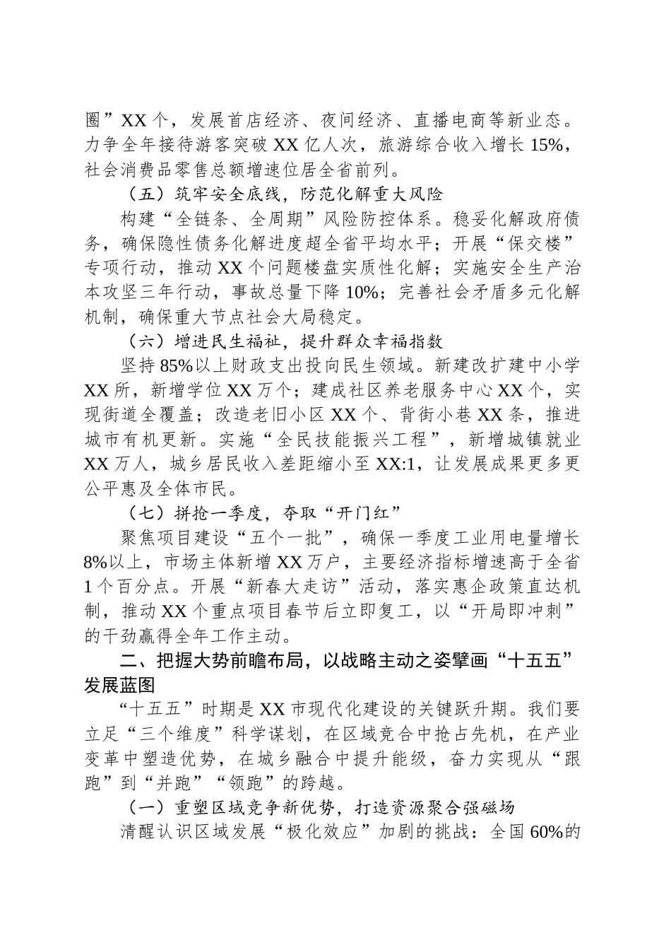 在市第十六届人民代表大会第三次会议开幕式上的讲话各位代表、同志们:在全市人民的热切期盼中,XX市第十六届人民代表大会第三次会议今天隆重开幕!我代表中共XX市委,向大会的召开表示热烈祝贺!向全体人大代表和与会同志致以诚挚问候!2025年是“十四五”规划收官冲刺之年,更是“十五五”蓝图谋篇奠基之年。站在承前启后的历史节点,我们要以习近平新时代中国特色社会主义思想为指引,深入贯彻党的二十大精神,全面落实省委“四高四争先”决策部署,以“拼抢赶超”的奋进姿态打好收官战,以“前瞻布局”的战略思维擘画新篇章,在现代化建设新征程中奋力谱写重振XX辉煌的壮丽答卷!一、锚定目标加压奋进,以决战决胜之势打好“十四五”收官战过去四年,全市上下锚定“建强副中心、形成增长极”目标,坚持稳中求进工作总基调,统筹推进疫情防控和经济社会发展,在产业转型、城乡融合、生态保护、民生改善等领域取得突破性进展。当前,“十四五”进入收官冲刺阶段,我们要坚持目标导向、问题导向、结果导向相统一,以“七项攻坚行动”确保交出高分答卷。(一)强化政策赋能,激活发展内生动力抢抓国家扩大内需战略机遇,精准把握政策导向和资金投向,建立“政策研究—项目策划—资金争取”全链条机制。聚焦扩大有效投资、激发消费潜力、化解债务风险三大领域,推动中央预算内投资、地方政府专项债、政策性金融工具协同发力,力争全年争取资金规模突破XX亿元。通过政策红利转化,确保固定资产投资增长8%以上,社会消费品零售总额突破XX亿元,切实将政策势能转化为发展实效。深化政银企对接合作,设立XX亿元产业引导基金,重点支持科技创新、绿色低碳等领域,形成“政策+资本”双轮驱动格局。(二)攻坚重大项目,夯实转型升级根基深化“转作风、大攻坚、建新功”专项行动,实施“三个一批”项目全周期管理。确保宁德时代XX基地二期6月底前全面达产,三期四期10月前开工建设,打造全国领先的新能源产业集群;推动百万吨乙烯项目5月底前主体工程全面施工,同步布局下游高端化工产业链,形成千亿级石化产业基地;实现呼南高铁焦洛平段3月底前控制性工程动工,全年完成交通基础设施投资XX亿元,构建“米字形”综合交通枢纽。通过100个省市重点项目建设,带动工业投资增长12%,战略性新兴产业占比提高2个百分点,为经济转型注入强劲动能。(三)优化企业服务,筑牢经济运行底盘实施“万人助万企”2.0升级行动,完善政企“早餐会”、问题“直通车”机制,全年解决企业诉求XX件以上。分类施策推动企业提质增效:对XX家重点企业实行“一企一策”精准扶持,建立产业链“链长制”,推动上下游协同发展;设立XX亿元产业纾困基金,帮扶短期困难企业稳定生产、渡过难关;支持XX家高成长性企业实施技术改造和数字化转型,培育“单项冠军”“隐形冠军”。力争全年新增规上工业企业XX家,培育“专精特新”企业XX家,高新技术企业突破XX家,构建大中小企业协同发展新格局。(四)激发消费潜能,释放市场增长活力实施文旅文创融合战略,打造“颠覆性创意、沉浸式体验年轻化消费”新场景。推进隋唐XX城国家遗址公园3A级景区创建,建设“古都文化体验走廊”;培育“XX制造”国潮品牌XX个,举办国际消费品博览会;布局“一刻钟便民生活圈”XX个,发展首店经济、夜间经济、直播电商等新业态。力争全年接待游客突破XX亿人次,旅游综合收入增长15%,社会消费品零售总额增速位居全省前列。(五)筑牢安全底线,防范化解重大风险构建“全链条、全周期”风险防控体系。稳妥化解政府债务,确保隐性债务化解进度超全省平均水平;开展“保交楼”专项行动,推动XX个问题楼盘实质性化解;实施安全生产治本攻坚三年行动,事故总量下降10%;完善社会矛盾多元化解机制,确保重大节点社会大局稳定。(六)增进民生福祉,提升群众幸福指数坚持85%以上财政支出投向民生领域。新建改扩建中小学XX所,新增学位XX万个;建成社区养老服务中心XX个,实现街道全覆盖;改造老旧小区XX个、背街小巷XX条,推进城市有机更新。实施“全民技能振兴工程”,新增城镇就业XX万人,城乡居民收入差距缩小至XX:1,让发展成果更多更公平惠及全...