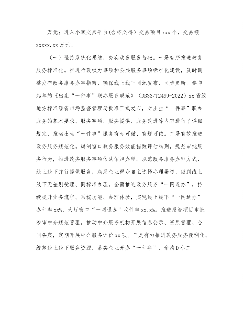 审管办2022年上半年工作总结和下半年工作思路(区县)今年以来,区审管办以数字化改革为总牵引,紧紧围绕政务服务标准化规范化便利化等核心工作,统筹政务服务和公共资源交易服务线上线下服务资源,全力激发市场活力,打造一流营商环境。2022年x月,《xx区打好“缩、减、控”组合拳全市率先“清零”建设工程公开招标项目投标保证金底数》在市府办《xx政务信息》刊登,获常务副市长xxx批示。x月,《xx区上线“云上交易”国有资产数字平台》在省委办公厅《xx信息》(每日简报)刊登,获副省长高兴夫批示。行政服务中心获得x月份全市窗口行业“流动红旗”。一、上半年工作总结上半年,区行政服务中心香积寺路大厅和绍兴路大厅共受理各类办件xxxxxx件,办结xxxxxx件,办结率xx.xx%;累计接待群众xx.x万余人次,接听咨询电话xxxxx个;收到锦旗xx面、表扬信xx封。交易中心建设工程进场交易项目xx个,交易总额xx.xx亿元,节约资金x.xx亿元;缴退保证金xx笔,涉及金额xxxx.x万元;进场拍卖房产共成交xx处,总成交金额xxxx.xx万元;政采云全省一张网商品上架审核通过xxxxxx件;完成政府集中采购项目x个,交易额xxx.xx万元;进入小额交易平台(含招必得)交易项目xxx个,交易额xxxxx.xx万元。(一)坚持系统化思维,夯实政务服务基础。一是有序推进政务服务标准化。推进行政权力事项和公共服务事项标准化建设,及时调整发布政务服务办事指南,确保线上线下同源发布、同步更新。参与起草的《出生“一件事”联办服务规范》(DB33/T2499-2022)xx省级地方标准经省市场监督管理局批准正式发布,对出生“一件事”联办服务的基本要求、服务事项、服务提供、服务改进等内容进行了详细规定,推动出生“一件事”服务有标可循、有规可依。二是有效推进政务服务规范化。编制窗口政务服务效能指数评估细则,规范审批服务行为,推进政务服务事项依法依规办理。规范政务服务办理方式,线上线下并行提供服务,满足企业群众自主选择办理渠道,做到线上线下无差别受理、同标准办理。全面推进政务服务“一网通办”,持续提升业务流程、系统功能、办理体验,实现线上线下“一网通办”办件率xx%,大厅窗口“一网通办”收件率xx.x%。推进投资项目审批涉审中介规范管理,推动中介服务机构开展信息公示、资质管理、合同备案,定期开展中介服务评价xx项。三是有力推进政务服务便利化。统筹线上线下服务资源,落实企业开办“一件事”、亲清D小二队伍建设,“亲清在线”受理线上咨询xxxxx件。会同区市场监管局等多部门推出个体工商户“歇业一件事”联办,推进因受疫情冲击而被迫暂停经营的个体工商户以歇业登记代替注销登记,帮助市场主体渡过难关,降低市场主体存续成本,为后续复工复产创造有利条件。“xCall”应用小程序创新推出“远程视频踏勘”应用场景,实现卫健部门的医疗机构择址勘察、公共场所承诺发证后复查,市场监管部门的医疗器械变更等业务“云上办”“跑零次”。疫情期间累计通过“xCall”办理线上踏勘业务xx件,有效保障业务办理不受影响。(二)坚持数字化思维,强化交易服务能力。一是承办市区联动攻坚项目。作为市区联动攻坚项目签约单位,负责承办“推广数字见证系统示范应用”项目,研究制定《推广数字见证系统示范应用联动攻坚项目工作方案》。协助市审管办推进数字见证系统提升完善及应用、《公共资源交易数字见证管理服务规范》市标制定两项主线工作,在全市范围内推广应用数字见证系统及服务管理工作规范。目前市级地方标准已成功立项。二是规范限额以下小额交易。在完成xx区小额公共资源交易平台建设的基础上,根据xx个街道的实际情况,按照数字见证工作要求,有序推动各街道小额开评标场地监控、电脑等硬件部署,以及小额平台、各街道开评标场地监控与数字见证系统的对接工作。结合平台试运行情况,向各街道征集平台使用过程中的意见建议,对平台功能作进一步优化提升。目前,xx个街道已按照数字见证相关要求完成硬件安装及软件对接工作。三是编制政府采购交易手册。携手区财政局,在政府集中采购目录及标准基础上,结合政采云平台各品目操作细则,按不同预算金额、采购方式及组织形式,修订x...