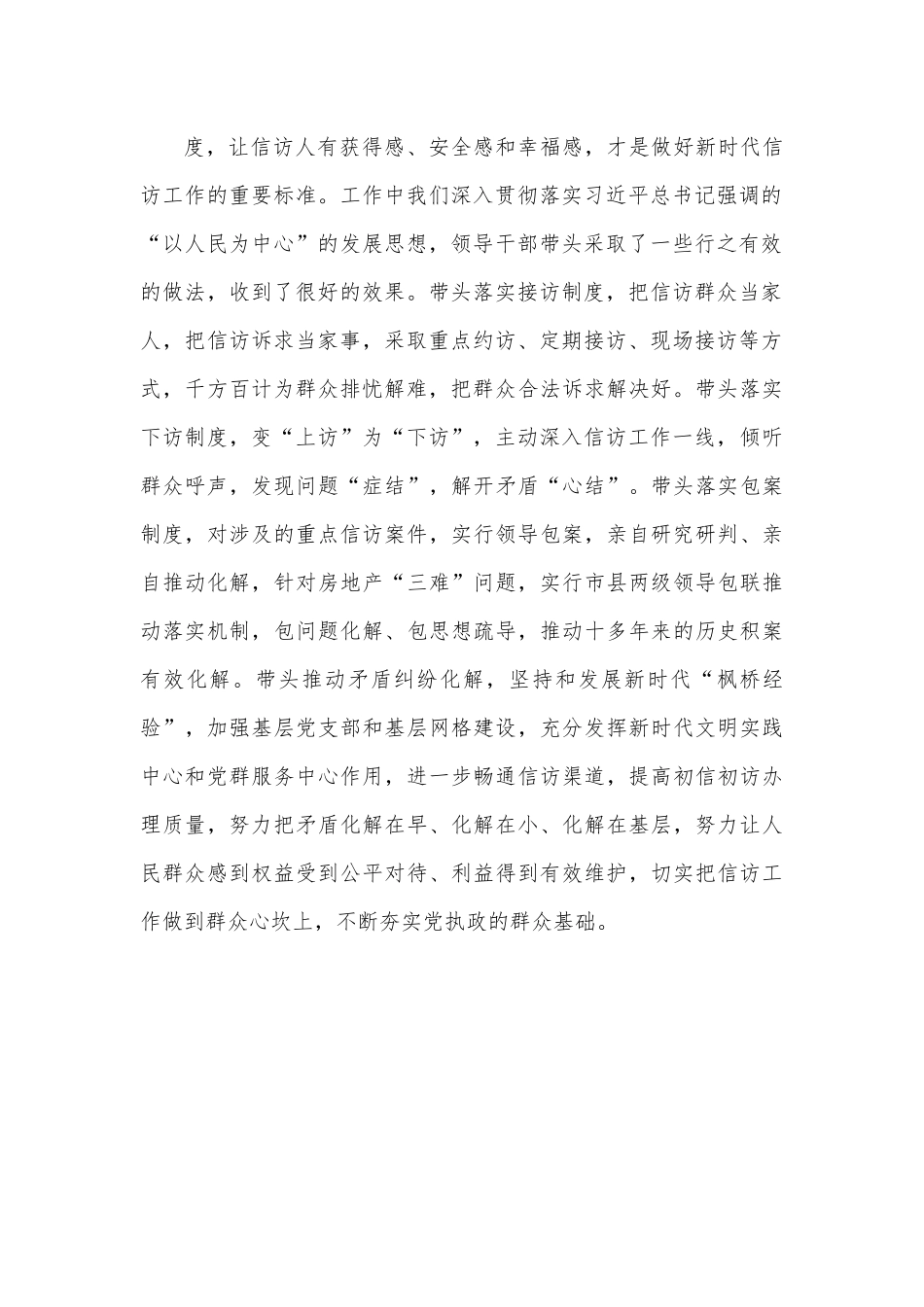 在党委中心组学习《信访工作条例》时的发言材料《信访工作条例》(以下简称《条例》)就做好新时代信访工作的体制机制、职责任务、处理程序、监督体系等定下了“硬制度”、立起了“铁规矩”。学习好、贯彻好、落实好《条例》应从四个方面领会和把握。一是树牢政治思维,确保正确政治方向。《条例》指出,坚持党的全面领导,把党的领导贯彻到信访工作各方面和全过程,确保正确政治方向,这充分体现了党中央对信访工作的高度重视。党的十八大以来,党中央对信访工作作出一系列重大决策部署,习近平总书记就加强和改进人民信访工作作出一系列重要指示批示,为做好新时代信访工作提供了根本遵循。当前,信访工作面临着许多新情况新问题,我们必须从政治高度把握信访工作的重要性,坚持从政治上看、从政治上办,主动适应形势变化和任务需要,深入贯彻习近平总书记关于加强和改进人民信访工作的重要思想,把党的领导作为信访工作的最高原则和最大优势,全面加强党对信访工作的领导,不断提升信访工作的规范化、法治化、制度化水平,以实际行动忠诚拥护“两个确立”,做到“两个维护”,确保信访工作方向正确。二是树牢民本思维,践行党的群众路线。《条例》指出,信访工作是党的群众工作的重要组成部分,是党和政府了解民情、集中民智、维护民利、凝聚民心的一项重要工作,是各级机关、单位及其领导干部、工作人员接受群众监督、改进工作作风的重要途径。说到底,信访工作是送上门来的群众工作,人民信访为人民,信访工作应当有温度,让信访人有获得感、安全感和幸福感,才是做好新时代信访工作的重要标准。工作中我们深入贯彻落实习近平总书记强调的“以人民为中心”的发展思想,领导干部带头采取了一些行之有效的做法,收到了很好的效果。带头落实接访制度,把信访群众当家人,把信访诉求当家事,采取重点约访、定期接访、现场接访等方式,千方百计为群众排忧解难,把群众合法诉求解决好。带头落实下访制度,变“上访”为“下访”,主动深入信访工作一线,倾听群众呼声,发现问题“症结”,解开矛盾“心结”。带头落实包案制度,对涉及的重点信访案件,实行领导包案,亲自研究研判、亲自推动化解,针对房地产“三难”问题,实行市县两级领导包联推动落实机制,包问题化解、包思想疏导,推动十多年来的历史积案有效化解。带头推动矛盾纠纷化解,坚持和发展新时代“枫桥经验”,加强基层党支部和基层网格建设,充分发挥新时代文明实践中心和党群服务中心作用,进一步畅通信访渠道,提高初信初访办理质量,努力把矛盾化解在早、化解在小、化解在基层,努力让人民群众感到权益受到公平对待、利益得到有效维护,切实把信访工作做到群众心坎上,不断夯实党执政的群众基础。三是树牢法治思维,将信访纳入法治化轨道。《条例》指出,各级机关、单位应当按照诉讼与信访分离制度要求,将涉及民事、行政、刑事等诉讼权利救济的信访事项从普通信访体制中分离出来,由有关政法部门依法处理。根据信访事项性质的不同,区分建议意见类、检举控告类、申诉求决类事项,分别明确受理办理程序,保证合理合法诉求依照法律规定和程序就能得到合理合法的结果。从制度层面,明确实施诉讼和信访分离制度,有利于更好地把涉及民商事、行政、刑事等诉讼权利救济的信访事项从普通信访体制中分离出来,更好地推动信访事项、矛盾纠纷的化解。在实际工作中,坚持依法依规,对已经或者依法应当通过行政复议、仲裁、诉讼等法定途径解决的投诉请求,在接访环节从严把关审核,耐心教育引导信访群众依法向有关政法机关提出相关诉求,按照法律法规规定的程序处理;对收到的群众涉法涉诉信件,及时转同级政法主管单位依法处理;支持各级政法机关建立完善联合接访、分别设立窗口等接访机制,依法处理涉法涉诉信访事项。四是树牢创新思维,推动新时代信访工作高质量发展。《条例》指出,地方党委和政府应当根据信访工作形势任务,健全信访工作联席会议规章制度,建立健全信访分析研判、重大信访问题协调处理、联合督查等工作机制,提升联席会议工作科学化、制度化、规范化水平。好的制度在于执行,推动信访工作适应新形势新任务...