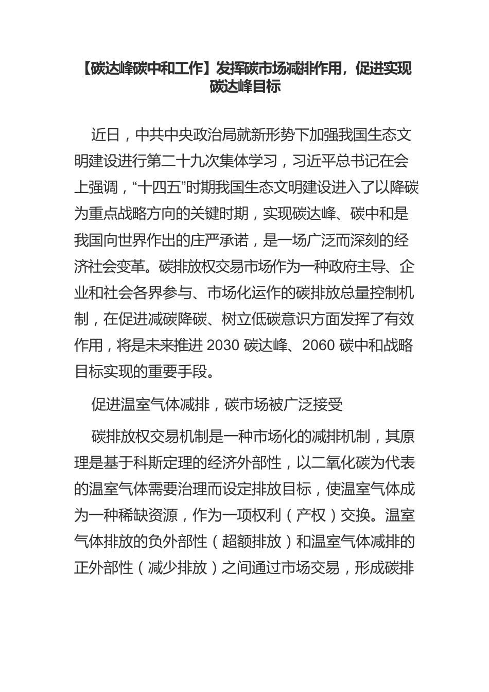 【碳达峰碳中和工作】发挥碳市场减排作用,促进实现碳达峰目标近日,中共中央政治局就新形势下加强我国生态文明建设进行第二十九次集体学习,习近平总书记在会上强调,“十四五”时期我国生态文明建设进入了以降碳为重点战略方向的关键时期,实现碳达峰、碳中和是我国向世界作出的庄严承诺,是一场广泛而深刻的经济社会变革。碳排放权交易市场作为一种政府主导、企业和社会各界参与、市场化运作的碳排放总量控制机制,在促进减碳降碳、树立低碳意识方面发挥了有效作用,将是未来推进2030碳达峰、2060碳中和战略目标实现的重要手段。促进温室气体减排,碳市场被广泛接受碳排放权交易机制是一种市场化的减排机制,其原理是基于科斯定理的经济外部性,以二氧化碳为代表的温室气体需要治理而设定排放目标,使温室气体成为一种稀缺资源,作为一项权利(产权)交换。温室气体排放的负外部性(超额排放)和温室气体减排的正外部性(减少排放)之间通过市场交易,形成碳排放权交易市场,从而使得碳排放权交易成为市场经济框架下解决碳排放问题效率显著的方式。1997年12月《联合国气候变化框架公约》缔约方在日本京都召开第三次缔约方大会,149个缔约方通过了《京都议定书》,建立了以促进全球减少温室气体排放为目的的温室气体排放权(减排量)市场交易机制,二氧化碳(CO2)、甲烷(CH4)、氧化亚氮(N2O)、氢氟碳化物(HFCs)、全氟碳化物(PFCs)及六氟化硫(SF6)为公约纳入的6种要求减排的温室气体。从对全球升温的贡献百分比来说,二氧化碳由于含量较多,所占的比例也最大,因此温室气体交易往往以每吨二氧化碳当量(tCO2e)为计量单位,统称为“碳交易”。其交易市场称为“碳市场”。《京都议定书》中规定了三种减排机制,即清洁发展机制、联合履行、排放交易,这三种都允许联合国气候变化框架公约缔约方国与国之间,进行减排单位的转让或获得,但具体的规则与作用有所不同。根据以上三种机制,碳交易被区分为配额型交易和项目型交易,配额型交易指的是碳排放总量控制下产生的排放配额单位的交易,如欧盟碳市场的欧盟排放配额、广东碳市场的广东碳配额,主要是在碳排放总量控制下控排企业、设施等超额排放和减排量的交易。项目型交易指的是因进行减排项目所产生的减排量单位的交易,如清洁发展机制项目活动获得“排放减量权证”、自愿减排项目获得的“自愿减排量”、中国核证自愿减排项目获得的“核证减排量”。随着全球变暖等气候问题成为全球治理的关注焦点,2015年第21届联合国气候变化大会通过《巴黎协定》之后,配额型的碳市场作为控制温室气体的市场化治理手段越来越被重视和使用,全球已有39个国家、18个省和州、6个城市建立了不同层级的碳市场。目前欧盟碳市场是全球最大的碳市场。从试点到全国,碳市场建设有序进行我国早在2011年开始就着手建设碳排放权交易试点市场。国家发展改革委于2011年10月29日印发《关于开展碳排放权交易试点工作的通知》,确定在北京市、天津市、上海市、重庆市、湖北省、广东省及深圳市开展碳排放权交易试点。2012年6月13日,国家发展改革委印发《温室气体自愿减排交易活动管理暂行办法》,确定了中国核证自愿减排量交易机制。2013年开始,各试点碳市场陆续开始启动运行,在碳市场机制建设、碳排放权分配、碳金融产品创新方面开展了诸多探索。至2020年底,全国各试点碳市场共覆盖电力、钢铁、水泥等20余个行业近3000家重点排放单位,碳配额总成交量4.6亿吨,总成交金额105亿元。随着试点碳市场机制的不断成熟,建设全国碳市场的呼声也越来越高。2017年12月18日,国家发展改革委印发《全国碳排放权交易市场建设方案(发电行业)》,首次提出在发电行业率先启动全国碳排放交易体系。这标志着全国碳市场建设的正式启动。2018年6月,应对气候变化工作职能由国家发展改革委划转至生态环境部,碳市场的工作也随之转隶到生态环境部。2020年12月25日,生態环境部发布《碳排放权交易管理办法(试行)》。12月29日,生态环境部编制发布《2019—2020年全国碳排放权交易配额总量设定与分配实施方案(发电行业)》,汇总形成了《纳入2019—2020年全国碳排放权...
