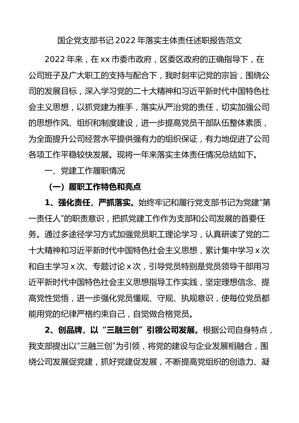 国企党支部书记2022年落实主体责任述职报告范文2022年来,在xx市委市政府,区委区政府的正确指导下,在公司班子及广大职工的支持与配合下,我时刻牢记党的宗旨,围绕公司的发展目标,深入学习党的二十大精神和习近平新时代中国特色社会主义思想,以抓党建为推手,落实从严治党的责任,切实加强公司的思想作风、组织和制度建设,进一步提高党员干部队伍整体素质,为全面提升公司经营水平提供强有力的组织保证,有力地促进了公司各项工作平稳较快发展。现将一年来落实主体责任情况总结如下。一、党建工作履职情况(一)履职工作特色和亮点1、强化责任,严抓落实。始终牢记和履行党支部书记为党建“第一责任人”的职责意识,把抓党建工作作为支部和公司发展的首要任务。通过多途径学习方式加强党员职工理论学习,认真研读了党的二十大精神和习近平新时代中国特色社会主义思想,累计集中学习x次和自主学习x次、专题讨论x次,引导党员特别是党员领导干部用习近平新时代中国特色社会主义思想指导工作实践,坚定理想信念、提高党性觉悟,进一步强化党员懂规、守规、执规意识,使每位党员都能用党的纪律严格约束自己,自觉做合格党员。2、创品牌,以“三融三创”引领公司发展。根据公司自身特点,我支部提出以“三融三创”为引领,将党的建设与企业发展相融合,围绕公司发展促党建,抓好党建促发展,不断提高党组织的创造力、凝聚力和战斗力,推动公司走上科学化、制度化、规范化的发展之路。(1)将党建工作融入公司治理,创城建战斗堡垒。把党的领导融入公司治理各环节,把企业党组织内嵌到公司治理结构之中。将党建工作纳入公司章程,实行公司董事长、党支部书记“一肩挑”,明确和落实党组织在公司法人治理结构中的法定地位。紧紧围绕发展与治理目标,将党建工作重心与公司中心任务“两心合一”,执行以党管人、管制度、不断完善各项制度,不断加强与推进项目建设与公司发展,形成了党建工作服务公司发展、促进公司治理的格局。今年公司各项工作取得了较大的进展,2022年公司共实现融资约x亿元,完成营业收入约x亿元,缴纳各项税费约x万元,上交财政款项约x万元。承建各层面项目x个,总投资约x亿元,完成项目固定投资约x亿元,投入项目建设资金x亿元,为xx市和xx区城市建设发展作出了应有的贡献,充分发挥了城市建设的排头兵和主力军作用。(2)将党建工作融入项目建设,创城建优质工程。在公司推行“一线工作法”,引导和鼓励党员职工在工程建设一线争先创优,选派优秀党员担任项目建设责任人,党员骨干带领先锋突击队,在城市建设的主战场发挥作用,让党旗在项目建设工地高高飘扬。在重大项目推进中,党员发扬了吃苦耐劳,冲锋在前的精神,强化责任,敢于担当,带领项目组成员,加快施工进度,积极协调解决项目建设存在的问题,强化攻坚力度,强力推进项目建设。x个xx省层面重大统筹推进项目按时完成了任务目标,其中路网一期工程的高新区横三路已完成投资约x万元,完成年度投资任务的x%,预计年内完成投资任务,xx省重大督查项目也均按时间节点完成任务目标,xx污水集污干管工程已建设完工,xx市第二污水处理厂及配套管网建设项目一期工程年内实现开工建设。x个市层面重大项目今年计划完成投资x万元,目前已完成投资约x万元,完成率为x%,预计今年内完成投资任务。x个xx区项目,均按计划推进。棚户区改造的主战场中,公司支部采取成立项目党小组的方式,将党员下沉到项目建设的现场,以党员示范带动助推项目建设,在棚户区改造项目攻坚中,公司党员更是发挥党的先锋作用,仅用两个月时间就破解了多年来久拖不结的历史遗留问题,使x个棚户区建设攻坚战“大拆迁、大打违、大建设”的各项指标任务实现“全线飘红”,实现了“x个100%”目标,成为了xx市“三个年一活动”的一面旗帜,得到了市委、市政府主要领导的肯定和赞扬。(3)将党建工作融入文化建设,创城建先锋团队。发挥支部的政治引领作用与促进企业文化建设紧密结合,打造与党建活动相融合的企业文化体系。一是在公司内部打造党建企业文化走廊,营造公司浓厚的企业文化氛围。加强对党建企业文化的宣传,把区委的最新指导思想以...