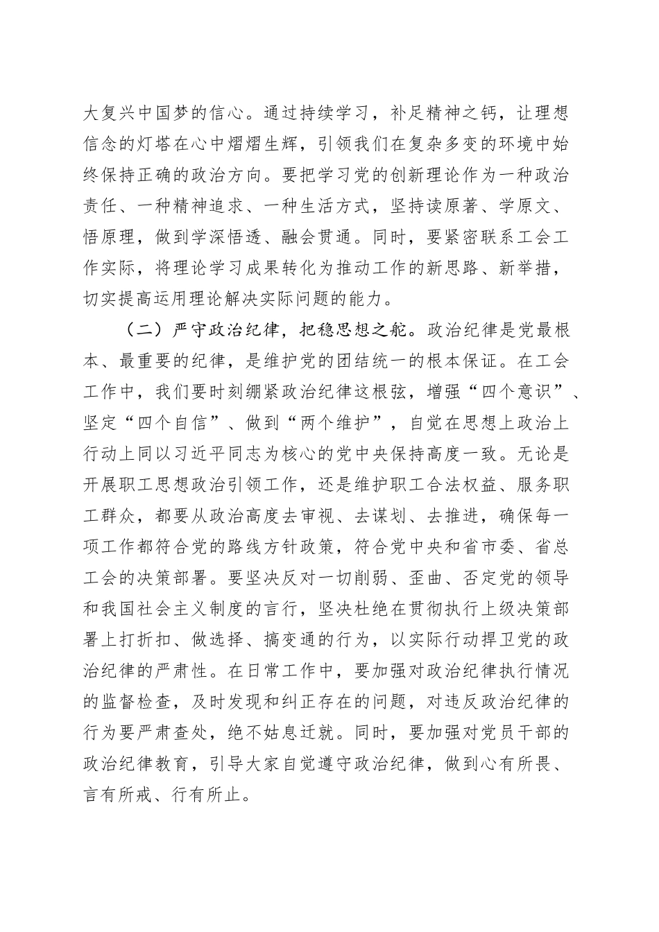 以“清风劲节守初心”之态,铸工会担当之魂——学习习近平总书记关于加强党的作风建设重要论述专题党课报告同志们:党的作风建设,关乎党的形象,系于人心向背,是党在长期奋斗历程中积累的宝贵财富,亦是党保持先进性与纯洁性的关键所在。习近平总书记关于加强党的作风建设的重要论述,高屋建瓴、内涵深邃,为我们指明了前进方向、提供了根本遵循。市总工会肩负着引领职工听党话、跟党走,维护职工合法权益,助力全市发展大局等重任,更应将作风建设摆在突出位置,以优良作风汇聚起推动工会事业高质量发展的磅礴力量。借此交流机会,我围绕学习习近平总书记关于加强党的作风建设重要论述,结合工会工作实际,与大家共同探讨、深入交流。一、以“吾日三省吾身”的自觉,常扫思想灰尘,校准党性坐标(一)强化理论武装,筑牢信仰之基。理论上的清醒是政治上坚定的前提。习近平新时代中国特色社会主义思想,是当代中国马克思主义、二十一世纪马克思主义,蕴含着丰富的立场观点方法。我们要以如饥似渴的学习态度,深入研读党的经典著作,系统学习党的创新理论,深刻领悟其核心要义、精神实质、丰富内涵与实践要求,在学思践悟中不断坚定对马克思主义的信仰,对中国特色社会主义的信念,对实现中华民族伟大复兴中国梦的信心。通过持续学习,补足精神之钙,让理想信念的灯塔在心中熠熠生辉,引领我们在复杂多变的环境中始终保持正确的政治方向。要把学习党的创新理论作为一种政治责任、一种精神追求、一种生活方式,坚持读原著、学原文、悟原理,做到学深悟透、融会贯通。同时,要紧密联系工会工作实际,将理论学习成果转化为推动工作的新思路、新举措,切实提高运用理论解决实际问题的能力。(二)严守政治纪律,把稳思想之舵。政治纪律是党最根本、最重要的纪律,是维护党的团结统一的根本保证。在工会工作中,我们要时刻绷紧政治纪律这根弦,增强“四个意识”、坚定“四个自信”、做到“两个维护”,自觉在思想上政治上行动上同以习近平同志为核心的党中央保持高度一致。无论是开展职工思想政治引领工作,还是维护职工合法权益、服务职工群众,都要从政治高度去审视、去谋划、去推进,确保每一项工作都符合党的路线方针政策,符合党中央和省市委、省总工会的决策部署。要坚决反对一切削弱、歪曲、否定党的领导和我国社会主义制度的言行,坚决杜绝在贯彻执行上级决策部署上打折扣、做选择、搞变通的行为,以实际行动捍卫党的政治纪律的严肃性。在日常工作中,要加强对政治纪律执行情况的监督检查,及时发现和纠正存在的问题,对违反政治纪律的行为要严肃查处,绝不姑息迁就。同时,要加强对党员干部的政治纪律教育,引导大家自觉遵守政治纪律,做到心有所畏、言有所戒、行有所止。(三)勇于自我反思,净化思想之源。“金无足赤,人无完人。”我们每一位党员干部都要以“君子检身,常若有过”的态度,时常反思自己的思想和行为。反思自己在对待职工群众的态度上是否热情周到,在处理职工诉求时是否积极主动、公正公平;反思自己在工作中是否存在敷衍塞责、推诿扯皮的现象,是否真正做到了尽职尽责;反思自己在廉洁自律方面是否坚守底线,有无违反党纪国法的苗头性、倾向性问题。通过深刻的自我反思,查找出思想上的污垢和行为上的偏差,及时加以清洗和纠正,不断净化自己的思想和灵魂。要建立健全自我反思的长效机制,定期开展自我批评,将自我反思融入到日常工作和生活中,形成习惯、化为自觉。同时,要虚心接受他人的批评意见,有则改之,无则加勉,在不断反思和改进中实现自我提升。二、以“绝知此事要躬行”的务实,力戒形式主义,夯实工作根基(一)深入基层调研,掌握真实情况。“纸上得来终觉浅,绝知此事要躬行。”工会工作的对象是广大职工群众,只有深入基层、深入一线,才能真正了解职工的所思所想所盼。我们要走出办公室,多到企业车间、项目工地、职工家中,与职工群众面对面交流、心贴心沟通,倾听他们的心声,感受他们的疾苦,掌握第一手资料。调研过程中,要坚持问题导向,聚焦职工权益维护、劳动就业、技能培训、生活保障等职工群众关心关注的热点难点问题,深入分析...