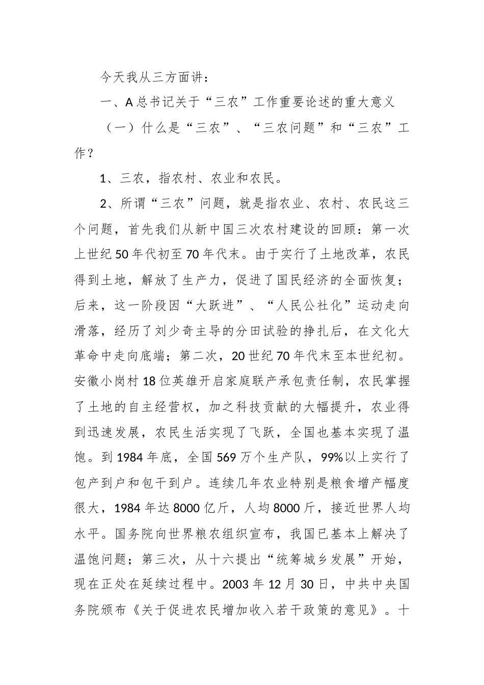 在深入学习贯彻A总书记关于“三农”工作重要论述各位学员好!非常高兴有机会和大家就关于“三农”工作的重要论述进行学习和交流。农业、农村、农民问题始终是一个关系党和国家工作全局的根本性问题。党的十八大以来,A总书记继承和发展了马克思主义“三农”思想,立足于现阶段社会主要矛盾的变化及“三农”工作在发展过程中出现的新矛盾、新问题,提出了一系列新论述和新观点,将“三农”工作提升到一个全新的高度。2月13日《中共中央国务院关于做好2023年全面推进乡村振兴重点工作的意见》印发,这是党的十八大以来第11个中央一号文件,是党的二十大胜利召开后发布的首个指导“三农”工作的“一号文件”,体现了以A同志为核心的党中央对“三农”工作的高度重视,传递出重农强农的强烈信号。党的十八大以来,A总书记就“三农”工作作出一系列重要指示。这些重要指示,在每一个中央一号文件中,都得到充分贯彻。回顾11个“一号文件”,一个鲜明的主题一以贯之——农业强、农村美、农民富。我们要深入学习贯彻A总书记关于“三农”工作的重要论述,不断增强做好新时代“三农”工作、全面推进乡村振兴的政治责任感和历史使命感。今天我从三方面讲:一、A总书记关于“三农”工作重要论述的重大意义(一)什么是“三农”、“三农问题”和“三农”工作?1、三农,指农村、农业和农民。2、所谓“三农”问题,就是指农业、农村、农民这三个问题,首先我们从新中国三次农村建设的回顾:第一次上世纪50年代初至70年代末。由于实行了土地改革,农民得到土地,解放了生产力,促进了国民经济的全面恢复;后来,这一阶段因“大跃进”、“人民公社化”运动走向滑落,经历了刘少奇主导的分田试验的挣扎后,在文化大革命中走向底端;第二次,20世纪70年代末至本世纪初。安徽小岗村18位英雄开启家庭联产承包责任制,农民掌握了土地的自主经营权,加之科技贡献的大幅提升,农业得到迅速发展,农民生活实现了飞跃,全国也基本实现了温饱。到1984年底,全国569万个生产队,99%以上实行了包产到户和包干到户。连续几年农业特别是粮食增产幅度很大,1984年达8000亿斤,人均8000斤,接近世界人均水平。国务院向世界粮农组织宣布,我国已基本上解决了温饱问题;第三次,从十六提出“统筹城乡发展”开始,现在正处在延续过程中。2003年12月30日,中共中央国务院颁布《关于促进农民增加收入若干政策的意见》。十一届三中全会以来,2004年至2017年,先后出台过十四个中央“一号文件”,不断推进农村改革。2017年“中央一号文件”的主题是:农业供给侧结构性改革。1996年正式提出“三农”的概念;2000年2004年中央一号文件再次回归农业。3、那三农工作是指什么?三农工作就是指做好农村、农业和农民的工作,其目的在解决农民增收、农业增长和农村稳定的问题。实际上,这是一个居住地域、从事行业和主体身份三位一体的问题,但三者侧重点不一,必须一体化地考虑以上三个问题。A总书记高度重视“三农”问题,坚持把解决好“三农”问题作为全党工作重中之重,并就“三农”工作提出了一系列新思想、新论断和新举措,为新时代解决好我国“三农”问题提供了根本遵循,具有十分重要的指导意义。一、A总书记关于“三农”工作重要论述的重大意义(一)实现共同富裕,必须解决城乡发展不平衡不充分问题近些年来,我国农业农村发展的整体形势是不错的,2004年以来,农业连续实现丰收,粮食综合生产能力实现了质的飞跃,城乡一体化的进程也取得了较好的成绩,农村的公共服务和社会事业都达到了一个较高的发展水平,6600多万贫困人口稳定脱贫,这几乎是世界经济发展史中的一个奇迹。近年来,我国农村贫困发生率已经从10.2%下降到了1.7%。但是,农业农村仍是社会主义现代化建设的突出短板。长期以来,我国城乡发展差距大的局面未得到根本扭转。比如,2017年城乡居民收入比为2.71:1;2018年城乡居民收入比为2.69:1;2019年城乡居民收入比为2.64:1;2020年城乡居民收入比为2.56:1;2021年城乡居民收入比为2.50:1;2022年城乡居民收入比为2.45,从以上数据显示城乡居民收入存在着巨大的差距,城乡发展不平衡的矛盾非常突出。因此A总...