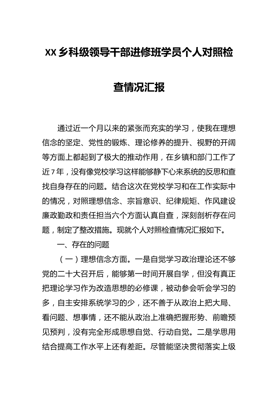 XX乡科级领导干部进修班学员个人对照检查情况汇报通过近一个月以来的紧张而充实的学习,使我在理想信念的坚定、党性的锻炼、理论修养的提升、视野的开阔等方面上都起到了极大的推动作用,在乡镇和部门工作了近7年,没有像党校学习这样能够静下心来系统的反思和查找自身存在的问题。结合这次在党校学习和在工作实际中的情况,对照理想信念、宗旨意识、纪律规矩、作风建设廉政勤政和责任担当六个方面认真自查,深刻剖析存在问题,制定了整改措施。现就个人对照检查情况汇报如下。一、存在的问题(一)理想信念方面。一是自觉学习政治理论还不够党的二十大召开后,能够第一时间开展自学,但没有真正把理论学习作为改造思想的必修课,被动参会听会学习的多,自主安排系统学习的少,还不善于从政治上把大局、看问题、想事情,还不能从政治上准确把握形势、前瞻预见预判,没有完全形成思想自觉、行动自觉。二是学思用结合提高工作水平上还有差距。尽管能坚决贯彻落实上级重大决策部署,及时完成上级领导交办的各项任务,但有的工作开展没有结合自身岗位实际进行深度思考,为了完成任务而任务,有时对上级意图理解不够准确、对标执行不够到位、落地落实不够精准,还处于较低层次的工作状态。(二)宗旨意识方面。一是群众服务不到位。能够始终践行以人民为中心的思想,能够把群众观点、群众路线贯穿到工作的全过程,但面对群众利益诉求的多样化和工作特点的多元化适应性不够,缺少对群众需求的深入了解服务群众的自觉性、主动性还应进一步加强。二是工作站位不够高。在工作中,能够认真履职尽责,但有时还是站位不高、大局意识不强,没有从大局角度去考虑研究、统筹推进,工作主动性还不够高,参与度还需进一步提升。(三)纪律规矩方面。能够认真遵守党章党规党纪和国家法律法规,能够自觉抵制不正之风和腐败现象。虽然能够保持不躲事不避事、不怕事不推事的行事风格,但有时面对错误思潮和不良言论缺乏抵制的意识,存在“老好人”思想,特别是对身边的不良行为、不正之风,与之斗争不够坚决,碍于情面不能及时指出或制止。(四)作风建设方面。一是防范化解风险还不足。能够坚决贯彻落实中央和省市各项决策部署,但在实际执行过程中,对一些工作中的风险问题考虑得不够深,难点和复杂性估计得不够充分,没有真正做到防患于未然。二是攻坚克难劲头不足。工作中有时遇到难题,一抓到底的恒心和韧劲不够足,特别是对一些遗留问题、复杂棘手的难题,结合工作实际,提出破解难题的思路和措施不多。(五)廉政勤政方面。一是贯彻上级决策部署还不够深入,有时思考问题的站位还不够高,对上级政策的理解不够深、落实不够快、对接还不够精准,特别是在如何把各项决策部署转化为推动分管工作高质量发展的实际行动和务实举措方面,还没有充分发挥带头示范作用。二是对重点工作的情况掌握不够及时,跟踪问效不够到位,深入调查研究,面对面解决实际困难问题的还不多。(六)责任担当方面。一是主动担当作为上还有差距有时认为贯彻落实决策部署是主要领导应该抓的,认为只要管好自己分管工作就行了,对不涉及自己分管的过问少缺乏全局视野,站位不够高。二是自我管控方面做的还不够。在工作中遇到困难时,有不求有功但求无过的麻痹思想,未能把工作做实、做深、做细,满足于过得去,忽视了如何把工作干得更好,工匠精神、精品意识相对缺乏,导致个别工作效果一般化、常规化。二、原因剖析经过深刻剖析,本人认为存在上述问题,主要有以下几个方面的原因。(一)理想信念不够坚定。平时工作中对自己的要求标准不高,学习的自觉性、主动性、规划性不强。对提升自身素质的重要性没有引起足够重视,没有把学习作为增强本领、提升自身素质的主要途径,没有把学习摆在工作的首位,平时学习浏览的多、思考的少,学习浮于表面,缺乏系统性全面性。(二)政治站位还不够高。政治站位的高低,决定着认识问题、分析问题和解决问题的能力和水平,以上问题的出现,原因在于政治意识不强,只从抓好自身工作的落实和任务的完成角度出发,不善于从政治上看待、分析和处理问题,遇到比较复杂局势时,不能及时从政治站...