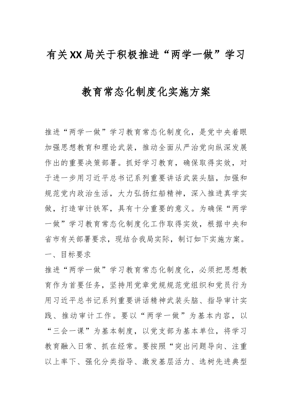 有关XX局关于积极推进“两学一做”学习教育常态化制度化实施方案推进“两学一做”学习教育常态化制度化,是党中央着眼加强思想教育和理论武装,推动全面从严治党向纵深发展作出的重要决策部署。抓好学习教育,确保取得实效,对于进一步用习近平总书记系列重要讲话武装头脑,加强和规范党内政治生活,大力弘扬红船精神,深入推进真学实做,打造审计铁军,具有十分重要的意义。为确保“两学一做”学习教育常态化制度化工作取得实效,根据中央和省市有关部署要求,现结合我局实际,制订如下实施方案。一、目标要求推进“两学一做”学习教育常态化制度化,必须把思想教育作为首要任务,坚持用党章党规规范党组织和党员行为用习近平总书记系列重要讲话精神武装头脑、指导审计实践、推动审计工作。要以“两学一做”为基本内容,以“三会一课”为基本制度,以党支部为基本单位,将学习教育融入日常、抓在经常。要按照“突出问题导向、注重以上率下、强化分类指导、激发基层活力、选树先进典型坚持常抓不懈”的要求,坚持全覆盖、常态化、重创新、求实效。(一)进一步坚定政治信仰。以“红船精神”为引领,突出思想政治建设、党性锻炼,不断增强全局党员的政治意识、大局意识、核心意识、看齐意识,做到在思想上拥护核心政治上维护核心、行动上紧跟核心。(二)进一步强化宗旨观念。始终把维护人民群众的根本利益作为审计工作的出发点和落脚点,强化群众意识,践行群众路线,站稳群众立场,增进群众感情,围绕更好地保障和改善民生来履行审计职责,努力为群众服务、让群众满意。(三)进一步严格党内政治生活。不断增强党内政治生活的政治性、时代性、原则性、战斗性,切实把全面从严治党要求落实到基层支部“最后一公里”。(四)进一步促进作用发挥。局各级党组织要在推进审计事业发展中充分履行职能、发挥核心作用,党员领导干部要忠诚干净担当、发挥表率作用,党员要党性坚强、在审计工作中发挥先锋模范作用。(五)进一步激发基层组织活力。把党员群众组织起来、凝聚起来,不忘初心、继续前进,肩负起“干在实处、走在前列、勇立潮头”的新使命,为围绕中心推进审计各项工作提供坚强组织保证。二、主要任务(一)持续深入推进学习,引导党员增强“四个意识”要始终打牢“学”这个基础,把学习党章党规、学习习近平总书记系列重要讲话作为一项长期任务坚持下去,使党的创新理论成果、实践成果、制度成果及时转化为广大党员特别是党员领导干部的自觉认识。1.精心安排学习计划。坚持局党组中心组率先学、党员领导干部带头学、支部书记引领学、党员干部自觉学的学习制度。局党组要认真落实中心组学习计划,每季度至少开展1次专题学习研讨;各党支部要认真制定具体学习计划,明确学习内容、时间安排和主要方式等。党员领导干部要结合实际制订个人自学计划,自觉开展学习。2.突出重点学习内容。要以尊崇党章、遵守党规为基本要求,汇编党内法规制度,下发全局党员干部,组织和引导广大党员继续深入学习党章党规和习近平总书记系列重要讲话精神,仔细研读《弘扬“红船精神”、走在时代前列》署名文章,深刻领会习近平同志关于XX发展的重要论述和对审计工作“三个立”的总要求,及时组织学习中央和省委市委重大会议、重大部署、重要文件等精神,特别是要抓好党的十九大会议精神的学习贯彻,教育引导党员坚定“四个自信”、增强“四个意识”。3.着力提升学习实效。各支部要注重学思践悟,紧密联系审计工作和党员思想实际,加强研讨式、互动式、调研式学习;要坚持读原著、学原文、悟原理,要形式多样讲党课通过集中学习、交流研讨、党课辅导等方式,推动党员系统掌握思想精髓和精神实质,做到内化于心、外化于行。要积极组织参加以“勇立潮头话担当”为主题的微型党课大赛,以微党课、微动漫、微视频等形式宣传展示学习成果。(二)强化实做这一关键,引导党员做到“四个合格”要教育引导广大党员按照“四讲四有”标准,自觉规范言行,不断锤炼党性,在“做”上深化拓展,把服务审计中心工作作为“两学一做”的最大实践,认真践行习近平总书记“以审计精神立身、以创新规范立业、以自身建设立...