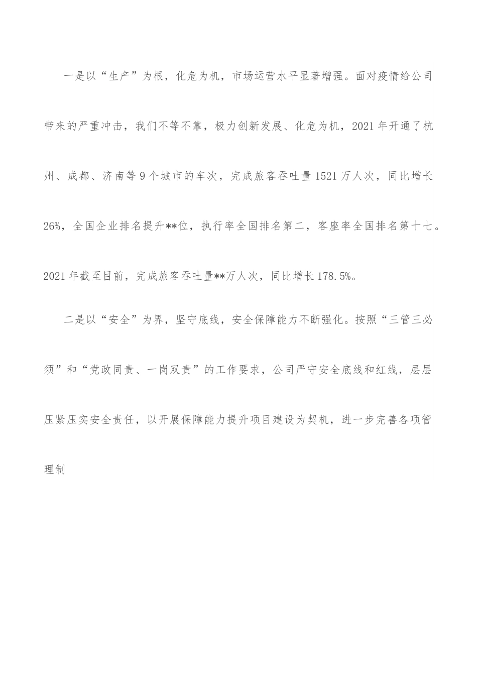 在“如何用高质量党建推动高质量发展”专题研讨会上的发言按照会议安排,由我代表公司围绕“如何用高质量党建推动高质量发展”作专题研讨发言,不当之处,敬请大家批评指正。一、以高质量党建推动高质量发展,就要把准政治引领之魂党的领导是实现高质量发展的根本保证。公司始终把党的政治建设摆在首位,党委班子在充分自学的基础上,扎实开展集中学习研讨,将习近平总书记对运输事业、我省发展一以贯之的期待和要求作为根本遵循。通过开展党委中心组学习、集中学习研讨、开展警示教育、红色基地教育、支部主题党日、党委班子上党课等方式,领导班子的德、能等综合素质实现了较大提升,进一步坚定政治信仰,把准思想“定盘星”。二、以高质量党建推动高质量发展,就要大兴担当实干之风一是以“生产”为根,化危为机,市场运营水平显著增强。面对疫情给公司带来的严重冲击,我们不等不靠,极力创新发展、化危为机,2021年开通了杭州、成都、济南等9个城市的车次,完成旅客吞吐量1521万人次,同比增长26%,全国企业排名提升**位,执行率全国排名第二,客座率全国排名第十七。2021年截至目前,完成旅客吞吐量**万人次,同比增长178.5%。二是以“安全”为界,坚守底线,安全保障能力不断强化。按照“三管三必须”和“党政同责、一岗双责”的工作要求,公司严守安全底线和红线,层层压紧压实安全责任,以开展保障能力提升项目建设为契机,进一步完善各项管理制度、体系、流程,实现内部管理的制度化、规范化、标准化、流程化,为安全服务保障奠定了坚实的理论基础。三是以“服务”为本,创新举措,真情服务水平明显提高。按照“质量品牌建设”要求,为打造最具魅力的“*”系列服务品牌,促进“*”系列服务与各项工作的相互融合,推行值班经理上车,开展苗语、侗语、汉语“三语”服务及服务品牌创建工作,密切关注旅客需求,不断完善服务设施,改进服务流程,健全服务保障功能,为旅客提供功能完备、流程顺畅、便捷舒心的出行体验。**”战略要求,结合公司实际,为合理利用运输资源,我们积极发展通用通用业务,现已有**辆客车常驻公司,通过企业与高职校联合办学进行训练业务,2022年一季度完成各类运输**车次,同比增长1669.3%,在全省排名第一。三、以高质量党建推动高质量发展,就要筑牢战斗堡垒之基(一)忠诚担当,在疫情防控中勇立潮头。在疫情防控方面,领导班子靠前指挥,充分发挥政治优势,组建党员先锋队、青年突击队等攻坚队伍冲锋一线、关口前移,将发热旅客和外来人员成功隔离在大门之外;成功处置一起者密切接触者事件。面对疫情常态化形势,公司组织员工开展疫苗接种、定期核酸检测,严防死守疫情传播风险,守护广大旅客平安出行。(二)履职尽职,在脱贫攻坚中彰显担当。在打赢脱贫攻坚战役方面,我们负责帮扶**县白塘村和炭坑村,选派了2名党员干部赴村帮扶。并结合两村特点,开展“一村一策”“一户一策”帮扶,积极争取养蜂专项资金6万元,实施养蜂产业化管理,利用扶贫点产业结构,结合公司元素设计农副产品包装盒,帮助扶贫村开展对外销售工作,全面实现了两村脱贫攻坚摘帽。下一步,公司将进一步巩固脱贫攻坚良好成果,乘势而上,协助帮扶村全面推进乡村振兴建设。(三)全力以赴,在复工复产中真抓实干。在地方政府的大力支持下,公司完成了复工复产运输保障和杭州市代表团扶贫重要保障任务,协助**单位顺利完成了学员返学。通过主动与地方人力资源社会保障局、供电局、就业局等部门对接,获得地方减免及补充资金共计**万元。2022年一季度又获地方暂时性生产经营困难且恢复有望企业失业保险稳岗返还资金**万元,极大的减轻了公司的运行压力。(四)攻坚克难,在班组建设中崭露头角。按照“党建进班组”工作要求,“空白”班组消除率达100%。通过规范管理、精益管理,在紧紧围绕安全生产经营指标、员工专业能力素质建设上,开展内部班组评比,形成“比、学、赶、超”的班组建设氛围,使公司上下基本上形成了“千斤重担有人挑,人人肩上有指标”的工作格局,班组建设工作取得了一定的成效。其中消防“闪电”班组荣获监管局“空防优秀班组”称号、运输“小蜜蜂”班组荣...