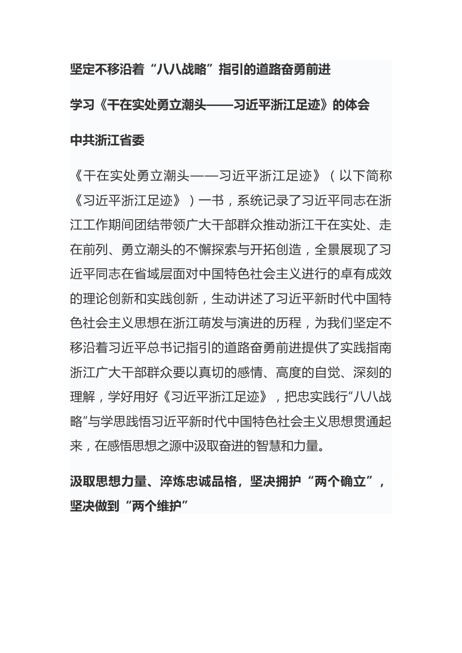 坚定不移沿着“八八战略”指引的道路奋勇前进学习《干在实处勇立潮头——习近平浙江足迹》的体会中共浙江省委《干在实处勇立潮头——习近平浙江足迹》(以下简称《习近平浙江足迹》)一书,系统记录了习近平同志在浙江工作期间团结带领广大干部群众推动浙江干在实处、走在前列、勇立潮头的不懈探索与开拓创造,全景展现了习近平同志在省域层面对中国特色社会主义进行的卓有成效的理论创新和实践创新,生动讲述了习近平新时代中国特色社会主义思想在浙江萌发与演进的历程,为我们坚定不移沿着习近平总书记指引的道路奋勇前进提供了实践指南浙江广大干部群众要以真切的感情、高度的自觉、深刻的理解,学好用好《习近平浙江足迹》,把忠实践行“八八战略”与学思践悟习近平新时代中国特色社会主义思想贯通起来,在感悟思想之源中汲取奋进的智慧和力量。汲取思想力量、淬炼忠诚品格,坚决拥护“两个确立”,坚决做到“两个维护”“八八战略”是全面系统开放的理论体系,涵盖了习近平同志在浙江工作时作出的一系列重大决策部署,与时俱进融汇集合了党的十八大以来习近平总书记重要指示、党中央重大决策部署在浙江贯彻落实的战略要求,是习近平新时代中国特色社会主义思想在浙江萌发与实践的集中体现,是引领浙江走向共同富裕和现代化的总纲领。《习近平浙江足迹》呈现了“八八战略”指引浙江改革发展的历程,是理解把握习近平新时代中国特色社会主义思想深厚理论基础、实践基础、群众基础的重要辅导读本。我们要争当学懂弄通做实习近平新时代中国特色社会主义思想的排头兵,深刻感悟习近平同志成为党的核心、军队统帅、人民领袖的历史逻辑、理论逻辑、实践逻辑,坚决拥护“两个确立”,坚决做到“两个维护”。在“铸魂”中学思践悟科学思想。《习近平浙江足迹》中的每一个篇章、每一段情节都蕴含着深刻科学道理,给我们带来思想启迪。比如,习近平同志强调科学决策的源头活水在于问计于民、问计于基层;提出“腾笼换鸟”“凤凰涅槃”思路,通过让“俊鸟”引领浙江经济来倡导转变经济增长方式;用“木桶理论”来阐述“实现全面小康,一个乡镇、一个人都不能掉队”;等等。我们要深化理论铸魂工程,掌握蕴含其中的马克思主义立场、观点、方法,不断增强“四个意识”、坚定“四个自信”、做到“两个维护”,以坚定理想信念铸牢忠诚之魂。在“溯源”中发挥重要萌发地的资源优势。《习近平浙江足迹》对习近平同志在浙江工作期间的主政理念、领导艺术品行修养、工作作风等作了生动翔实的场景呈现。比如,习近平同志用“跑遍了浙江的山山水水”“跑深了与浙江广大干部群众的真切感情”“跑透了浙江的省情市情县情”来形容要加强调查研究、加深与百姓情感;强调领导干部要坚持“两手过硬”,学会“十指弹琴”;等等。我们要深化理论溯源工程,循着习近平总书记的足迹发掘丰厚思想资源,学习总结好、传承发扬好习近平总书记留给浙江的宝贵财富,不断找到打开新思路、解决新问题的“金钥匙”。在“走心”中提高政治判断力、政治领悟力、政治执行力。《习近平浙江足迹》以生动案例记载了习近平同志在浙江坚决扛起管党治党政治责任,为人民群众的福祉殚精竭虑为浙江建设呕心沥血的从政履职经历。我们要深化理论走心工程,怀着深厚感情、扛起政治责任,讲好习近平总书记在浙江的故事,推动全省上下深刻领会“两个确立”的决定性意义,矢志不渝忠诚核心、拥戴核心、紧跟核心,始终做到“总书记有号令、党中央有部署,浙江见行动”。汲取行动力量、彰显实干担当,在高质量发展中推进共同富裕和省域现代化先行《习近平浙江足迹》记录了习近平同志立足浙江实际擘画“八八战略”,制定实施创建生态省、建设“平安浙江”、加快建设文化大省、建设“法治浙江”、加强和改进党的建设等重大决策部署的历程。我们要从中领悟马克思主义方法论的精髓要义,把握浙江干在实处、走在前列、勇立潮头的实践密码,在推进共同富裕和省域现代化先行中实现浙江发展的新跃变。锤炼尊重规律的实践品格。习近平同志针对21世纪初浙江改革发展面临的新形势新特点,在广泛调研的基础上擘画实施“八八战略”,就是在洞察事物发展规...