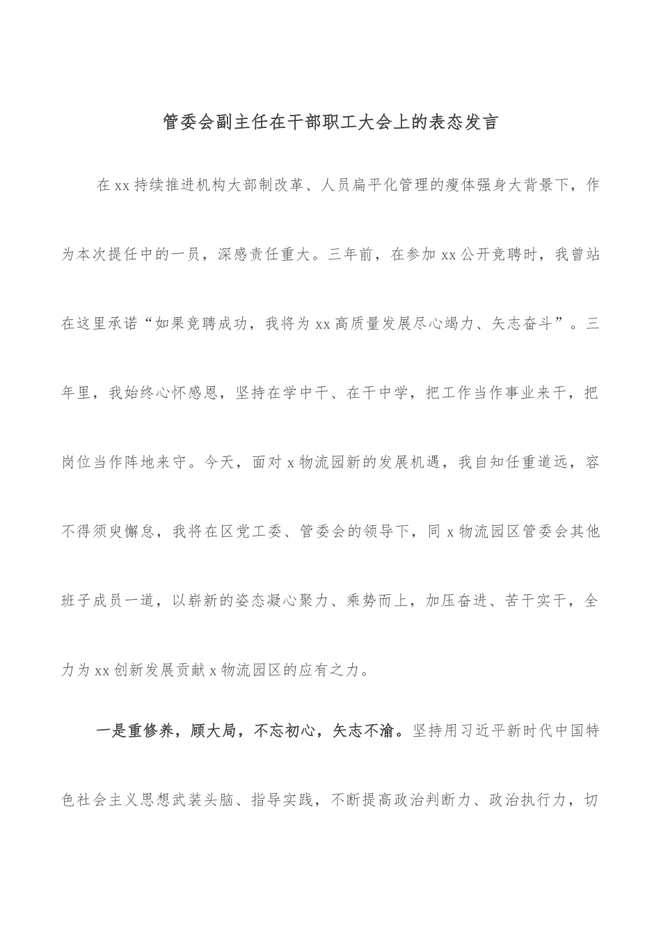 管委会副主任在干部职工大会上的表态发言在xx持续推进机构大部制改革、人员扁平化管理的瘦体强身大背景下,作为本次提任中的一员,深感责任重大。三年前,在参加xx公开竞聘时,我曾站在这里承诺“如果竞聘成功,我将为xx高质量发展尽心竭力、矢志奋斗”。三年里,我始终心怀感恩,坚持在学中干、在干中学,把工作当作事业来干,把岗位当作阵地来守。今天,面对x物流园新的发展机遇,我自知任重道远,容不得须臾懈怠,我将在区党工委、管委会的领导下,同x物流园区管委会其他班子成员一道,以崭新的姿态凝心聚力、乘势而上,加压奋进、苦干实干,全力为xx创新发展贡献x物流园区的应有之力。一是重修养,顾大局,不忘初心,矢志不渝。坚持用习近平新时代中国特色社会主义思想武装头脑、指导实践,不断提高政治判断力、政治执行力,切实增强“四个意识”、坚定“四个自信”、做到“两个维护”,筑牢理想信念,坚定信仰追求,把对党的绝对忠诚融入到对事业的热爱、对事业的追求中。同时,自觉把工作放到xx改革发展的大局中去思考、去谋划、去推进,不折不扣落实党工委、管委会及x物流园区管委会的决策部署,践行初心使命,坚定园区建设发展的信心和决心。二是讲实干,重担当,孜孜追求,驰而不息。压实扛牢招商引资和项目建设“两条主线”,以“朝受命、夕饮冰,昼无为、夜难寐”的责任感和使命感,推进各项任务目标的落实。全力以赴打好项目攻坚战,通过目标任务倒逼、时间节点倒排、责任落实倒追,推动签约项目抓开工、在建项目抓进度、投产项目抓见效;全力以赴打好招商主动战,深入开展以商招商、产业链招商,聚焦链条引项目,打造完整物流产业链,不断丰富园区物流业态;全力以赴打好要素供给战,坚持要素跟着项目走,不断加大融资力度,多渠道筹措项目资金,全力破解资金、用地等瓶颈制约,为项目推进提供有力保障;全力以赴打好环境保障战,坚持服务围绕项目转,创造最优营商环境,做到在一线解难题、破瓶颈,逐个攻克项目推进困难问题,以务实的举措、过硬的担当,推动项目建设。三是讲团结,聚合力,分工协作,行而不辍。同心山成玉,协力土变金。团结是干事创业的基础,团结就是凝聚力、战斗力和生产力。我将坚决执行党的民主集中制,坚决执行集体领导下的分工负责制,在工作上遵规守矩、相互支持,在生活上互相尊重、以诚相待,同x物流园区的同志们攥成一个拳头,打造更多正能量的园区声音、园区瞬间、园区故事,营造一条心干事业、一盘棋抓工作、一股劲促发展的生动局面。四是知敬畏,守规矩,砥砺前行,永葆本色。工作中,我将始终把纪律和规矩挺在前面,坚守廉洁从政底线,以《党章》为遵循、以《准则》为标尺、以《条例》为戒尺,严格执行廉洁自律各项规定,严格落实中央八项规定精神,暮鼓晨钟,加强淬炼,怀德自重,砥砺奋进,做到做人有尺度、有遵循,做事有底线、有原则。“日日行,不怕千万里;常常做,不怕千万事”。今后,我将以“勤快严实精细廉”的作风,在xx高质量发展征途中始终保持战略定力和耐心,不断为xx更好的明天贡献力量。