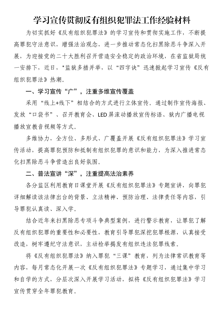 学习宣传贯彻反有组织犯罪法工作经验材料为切实抓好《反有组织犯罪法》的学习宣传和贯彻实施工作,不断提高罪犯守法意识,增强法治观念,进一步推动常态化扫黑除恶斗争深入开展,为迎接党的二十大胜利召开营造安全稳定的政治环境,在省监狱局统一安排下,近日,*监狱多措并举,以“四字诀”迅速掀起学习宣传《反有组织犯罪法》热潮。一、学习宣传“广”,注重多维宣传覆盖采用“线上+线下”相结合的方式进行立体宣传。通过制作宣传海报、发放“口袋书”、召开教育会、LED屏滚动播放宣传标语、狱内广播电视播放宣教音视频等方式。多维协力,全方位、多形式、广覆盖开展《反有组织犯罪法》学习宣传活动,提高罪犯预防和抵制有组织犯罪的意识和能力,为深入推进常态化扫黑除恶斗争营造出良好氛围。二、普法宣讲“深”,注重提高法治素养各分监区利用教育日课堂开展《反有组织犯罪法》专题宣讲,向罪犯详细解读该法律出台的背景、立法精神、预防治理、法律责任等内容,引导罪犯认真读、深入学。结合近年来扫黑除恶专项斗争典型案例,进行警示教育,让罪犯了解反有组织犯罪的重要性和必要性,教育引导罪犯深挖犯罪根源,认真接受改造,树牢遵纪守法意识,主动检举揭发有组织违法犯罪线索。将《反有组织犯罪法》纳入罪犯“三课”教育,列为法律常识教育等内容,每月常态化开展一次《反有组织犯罪法》专题学习,通过集中学习和自学的方式,分层次深入开展学习活动,拟将《反有组织犯罪法》学习宣传贯穿全年罪犯教育。三、学思贯通“透”,增强改造内生动力各监区结合工作实际,组织罪犯就“有组织犯罪的危害性”“如何预防和治理黑恶犯罪”“狱内如何防止有组织犯罪的侵害”等话题展开互动讨论,撰写学习心得,举办现身说法和知识竞赛,加深罪犯对《反有组织犯罪法》的理解程度,让法律知识入脑入心,努力做到学思贯通“透”,巩固学法成效,深化思想认识,引导罪犯更好运用法治思维面对黑恶势力,用法律条款维护自身合法权益。四、知行合一“实”,统筹做到形效统一坚持以推动罪犯教育工作作为检验学习贯彻成效的重要标准,进一步把学习《反有组织犯罪法》与推进当前教育改造重点工作结合起来,与罪犯出入监教育、行为规范教育、认罪悔罪教育、反脱逃教育和目前正在开展的系列专项教育活动结合起来。努力做到形效统一,将罪犯普法最终落脚到监规纪律和遵纪守法教育上,切实把贯彻落实《反有组织犯罪法》体现在实实在在的具体工作措施中,奋力推动监狱工作再上新台阶。通过本次宣传教育活动,提升了罪犯的法治意识,增强了罪犯防范和抵御安全风险的能力,对涉黑涉恶类罪犯起到震慑作用,为监狱的安全稳定营造了良好氛围。